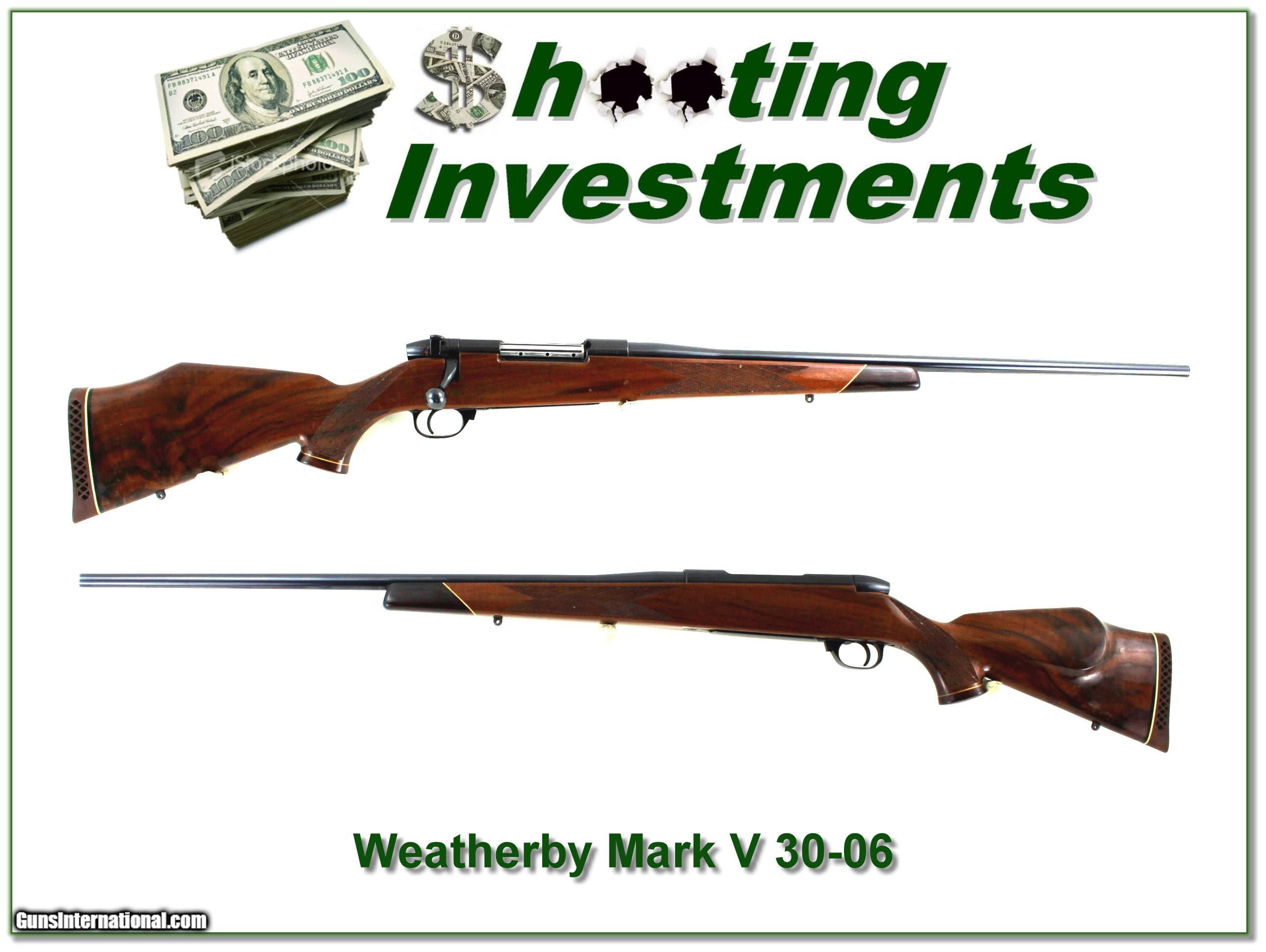 Description: This is a very nice Weatherby Mark V Deluxe in 30-06. It is an older 9-Lug Mark V with the lighter weight 24in barrel. It has a few marks and from the sharp lugs I’m sure not shot alot. It will make a high-end hunting gun! Considering the current list price of $2600 for a new Deluxe how can you go wrong here? It is a Shooting Investment. Shipping and insurance is $49. Please email me with any questions or larger pictures. (Consign your quality firearms with Shooting Investments for only 12%! Let me know if you have any you would like to sell!) 23-1129 Payment: Payment is by Money Order, Cashier’s Check or Personal Check. I can now also accept Credit Cards (MasterCard, Visa, Discover & American Express) with a 3% convenience fee. Shipping: The shipping charge will be listed in each description. It is $49 for most firearms. Some heavy guns or those insured for over $2000 will be higher. Shipments to Alaska and Hawaii are higher because air shipment is required. Most firearms are shipped on Tuesday and Thursday and usually in 5 days of receipt of payment. We package all shipments carefully and insure them. Optics are shipped Priority Mail and most other non-firearm shipments are shipped First Class. Returns: Our return policy is simple. If for any reason you are not pleased with your purchase, you may return your item for a full refund of purchase price. Ammunition cannot be returned. It is important to us that you are happy. Guns cannot be fired or dissembled before returning them and they must be returned in the same condition as received. Notification of a return must occur within 3 days of receipt at your dealer. Shipping, convenience and dealer fees are not refundable and are the responsibility of the buyer. Lay-a-way: If needed, we offer a 60 day lay-a-way option on most firearms. It is 1/3 now, 1/3 in 30 days and 1/3 in 60 days. Lay-a-way firearm sales are final and cannot be returned. If a lay-a-way is not completed the first payment cannot be refunded. Consigning your firearms with Shooting Investments: We will help you get top dollar for your firearms. While most local guns shops charge 20% or more, our fee is only 12% with a minimum of $75. At your local gun shop it might take months to sell. Selling on-line provides instant access to thousands of interested buyers. You won’t find any other on-line dealer willing to sell your firearms for only 12% or listing every gun on 3 separate s. Selling through an House typically costs the seller 15% and the buyer an addition 15% (so 30%) and you have to wait several months to sell and longer to receive funds. If properly priced, we will sell your firearms within a few weeks. Send us an email or give us a call and we’ll explain how easy it is for you to get top dollar. Trading: Trading for us is really just buying your gun to re-sell. If you have a gun you want to trade, please email a picture and we will let you know what we can give for it. You will always get more if we sell it for you on consignment. SOLD |