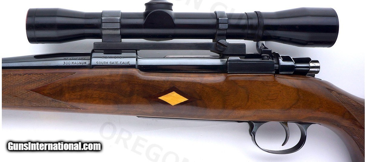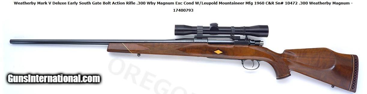 Description: WEATHERBY MARK V DELUXE EARLY SOUTH GATE BOLT ACTION RIFLE .300 WBY MAGNUM EXCELLENT CONDITION WITH LEUPOLD MOUNTAINEER 4X SCOPE SN# 10472 Up for sale is a classic early-production Weatherby Mark V Deluxe chambered in .300 Weatherby Magnum, circa 1960. This rifle features beautiful high-gloss walnut with contrasting rosewood accents and a deep, glossy blue finish. Both the barrel and stock are in excellent condition, making this a standout example of an early South Gate Mark V Deluxe sporting rifle. Features:
