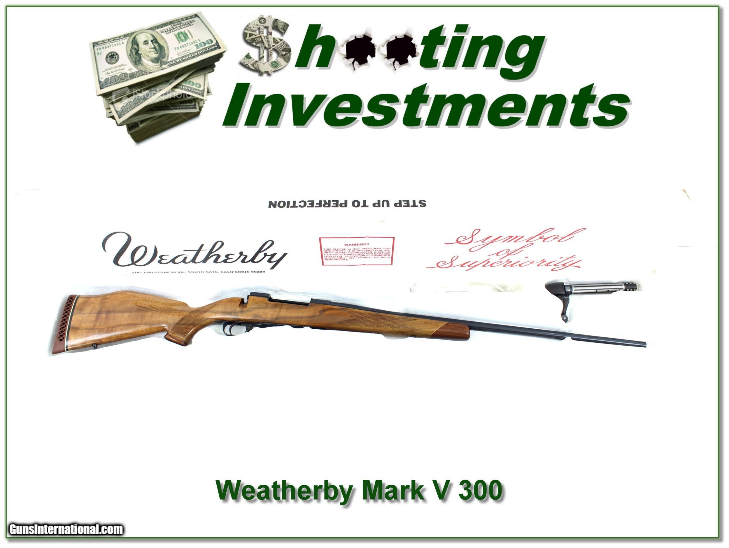 Description: Collectors, shooters and hunters, this is a hard-hitting, flat-shooting Weatherby Mark V Deluxe in 300 Weatherby Magnum. It is a top-quality Japan made Mark V. Many collectors believe these are the highest quality of all! This one has beautiful wood and I just a couple insignificant handing marks. It’s a harder to find 26in gun and comes in original box with test target and manual. It’s a real Shooting Investment! I am selling this one on consignment and as such lay-a-way can’t be used. It does of course have the standard 3-day inspection. Shipping and insurance is $39. Please email me with any questions or larger pictures. (Consign your quality firearms with Shooting Investments for only 12%! Let me know if you have any you would like to sell!) 20-0092 Payment: Payment is by Money Order, Cashiers Check or Personal Check. I can now also accept Credit Cards (MasterCard, Visa, Discover & American Express) with a 3% convenience fee. PayPal can be used for some items but never for firearms. Shipping: The shipping charge will be listed in each description. It is $39 for most firearms. Some heavy guns or those insured for over $2000 will be higher. Shipments to Alaska and Hawaii are higher because air shipment is required. Most firearms are shipped on Tuesday and Thursday and usually in 5 days of receipt of payment. We package all shipments carefully and insure them. Optics are shipped Priority Mail and most other non-firearm shipments are shipped First Class. Returns: Our return policy is simple. If for any reason you are not pleased with your purchase, you may return your item for a full refund of purchase price. Ammunition cannot be returned. It is important to us that you are happy. Guns cannot be fired or dissembled before returning them and they must be returned in the same condition as received. Notification of a return must occur with-in 3 days of receipt at your dealer. Shipping, convenience and dealer fees are not refundable and are the responsibility of the buyer. Lay-a-way: If needed, we offer a 60 day lay-a-way option on most firearms. It is 1/3 now, 1/3 in 30 days and 1/3 in 60 days. Lay-a-way firearm sales are final and if not completed the first payment cannot be returned. Consigning your firearms with Shooting Investments: We will help you get top dollar for your firearms. While most local guns shops charge 20% or more, our fee is only 12% with a minimum of $75. At your local gun shop it might take months to sell. Selling on-line provides instant access to thousands of interested buyers. You won’t find any other on-line dealer willing to sell your firearms for only 12% or listing every gun on 3 separate s. Selling through an House typically costs the seller 15% and the buyer an addition 15% (so 30%) and you have to wait several months to sell and longer to receive funds. If properly priced, we will sell your firearms in a few weeks. Send us an email or give us a call and we’ll explain how easy it is for you to get top dollar. Trading: Trading for use is really just buying your gun to re-sell. If you have a gun you want to trade, please email a picture and we will let you know what we can give or it. You will always get more if we sell it for you on consignment. Help for California Buyers: We are happy to ship to California. It is the buyer’s responsibility to make sure any item you buy is legal in your state. We are also happy to help with your purchase of a firearm from someone other than us. If you see a gun you would like to buy but the seller can’t or won’t ship to California they can ship to use and we’ll then ship it to your California dealer. The cost for this service is only $30 + shipping. Let us know if we can help! SOLD |