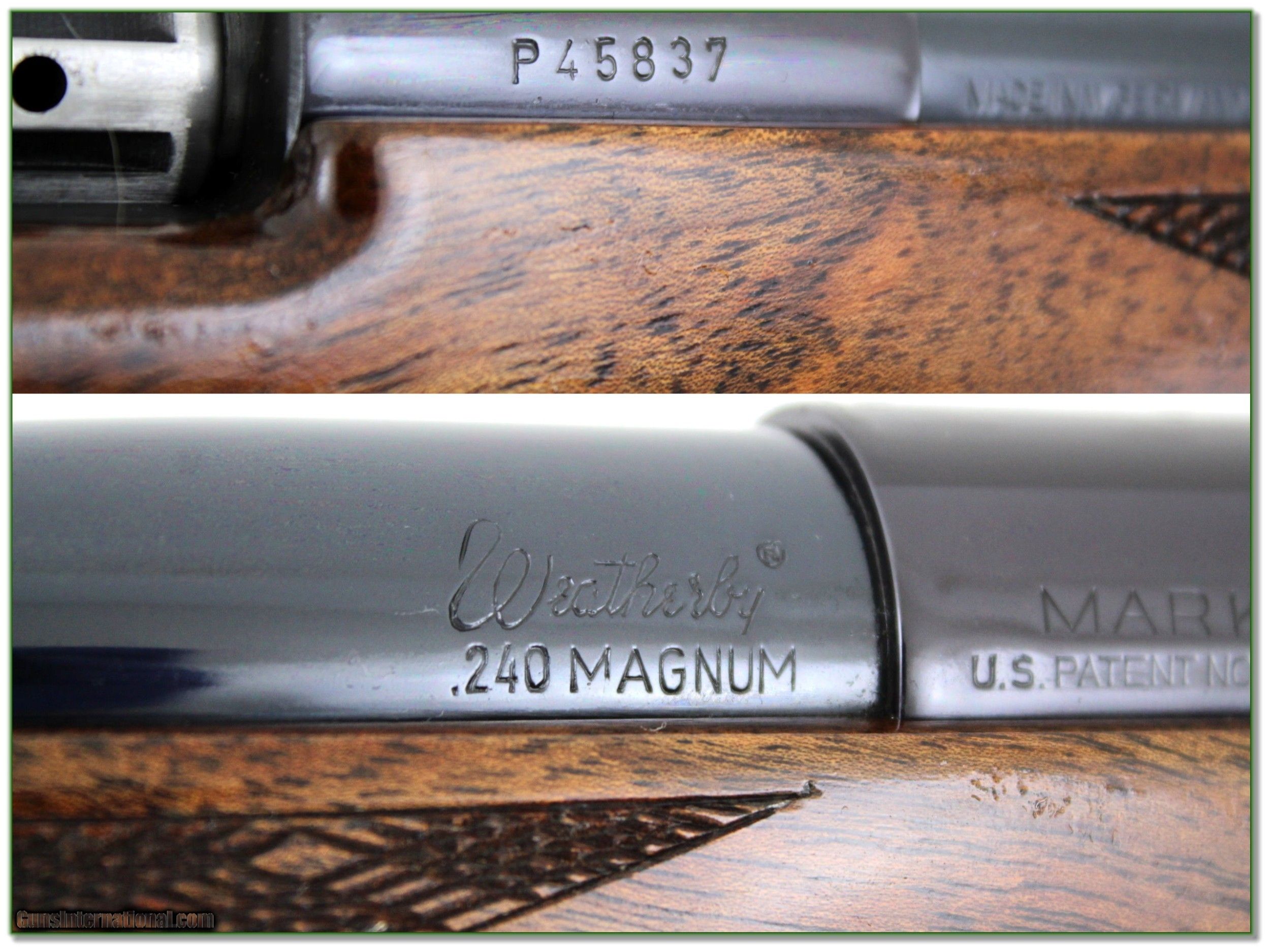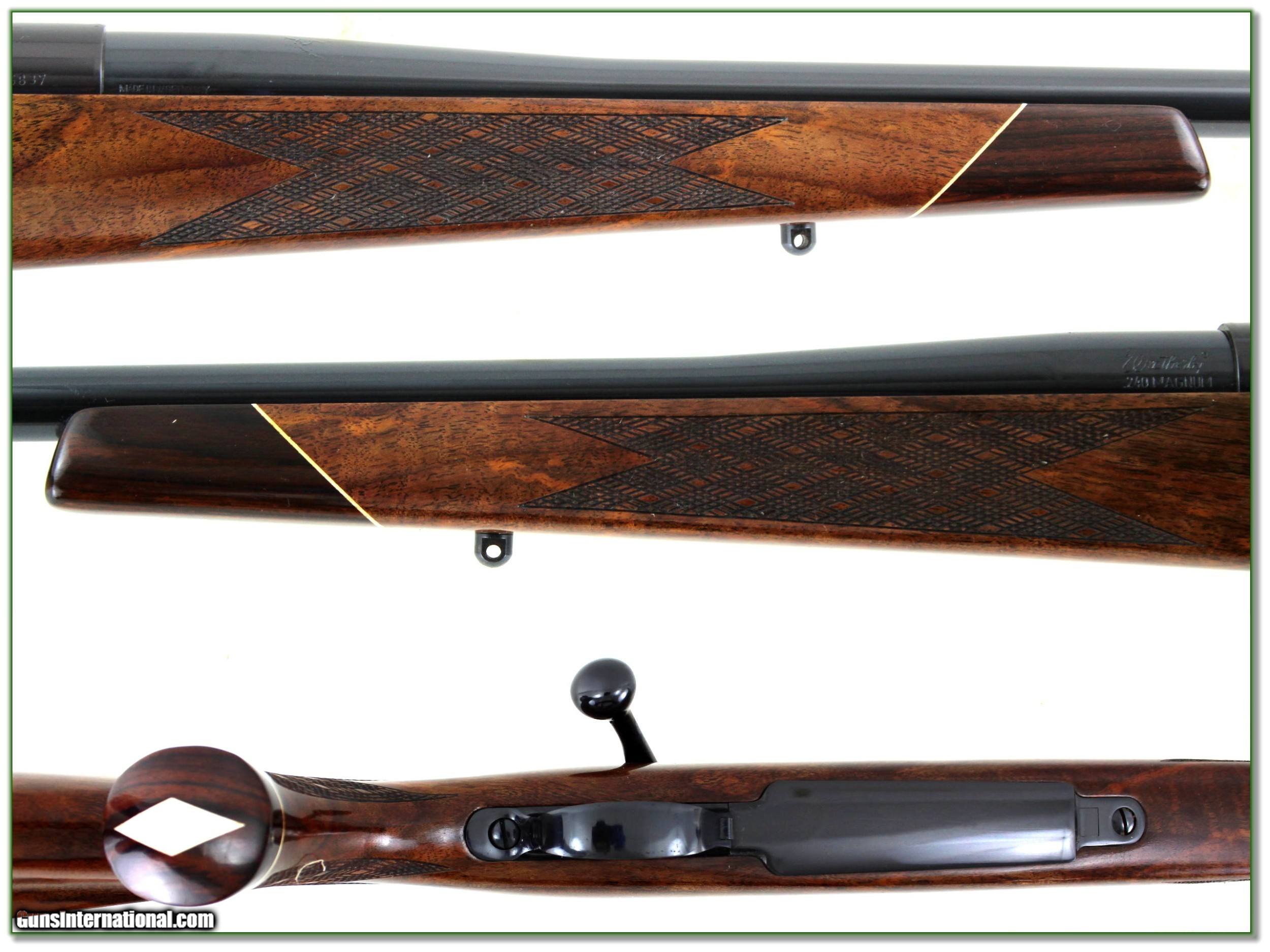 Description: Collectors, this is a near new and collector condition Weatherby Mark V Deluxe in 240 Weatherby Magnum. It is the VERY hard to find 26in German made Mark V. And look at the wood! It has outstanding figure; much more than typical from the German manufactured Mark V’s. I find no marks on the wood and no wear on the blue. From the razor sharp lugs I’m sure only a few rounds fired. I don’t know how you could find a nicer one! It is a real Shooting Investment. Shipping and insurance is $59. Please email me with any questions or larger pictures. (Consign your quality firearms with Shooting Investments for only 12%! Let me know if you have any you would like to sell!) 23-0114 Payment: Payment is by Money Order, Cashiers Check or Personal Check. I can now also accept Credit Cards (MasterCard, Visa, Discover & American Express) with a 3% convenience fee. Shipping: The shipping charge will be listed in each description. It is $49 for most long guns. Some heavy guns, over 48in boxes or those insured for over $2000 will be higher. Shipments to Alaska and Hawaii are higher because air shipment is required. Most firearms are shipped on Tuesday and Thursday and usually in 5 days of receipt of payment. We package all shipments carefully and insure them. Optics are shipped Priority Mail and most other non-firearm shipments are shipped First Class. Returns: Our return policy is simple. If for any reason you are not pleased with your purchase, you may return your item for a full refund of purchase price. Ammunition cannot be returned. It is important to us that you are happy. Guns cannot be fired or dissembled before returning them and they must be returned in the same condition as received. Notification of a return must occur with-in 3 days of receipt at your dealer. Shipping, convenience and dealer fees are not refundable and are the responsibility of the buyer. Lay-a-way: If needed, we offer a 60 day lay-a-way option on most firearms. It is 1/3 now, 1/3 in 30 days and 1/3 in 60 days. Lay-a-way firearm sales are final and if not completed the first payment cannot be returned. Consigning your firearms with Shooting Investments: We will help you get top dollar for your firearms. While most local guns shops charge 20% or more, our fee is only 12% with a minimum of $75. At your local gun shop it might take months to sell. Selling on-line provides instant access to thousands of interested buyers. You won’t find any other on-line dealer willing to sell your firearms for only 12% or listing every gun on 3 separate s. Selling through an House typically costs the seller 15% and the buyer an addition 15% (so 30%) and you have to wait several months to sell and longer to receive funds. If properly priced, we will sell your firearms in a few weeks. Send us an email or give us a call and we’ll explain how easy it is for you to get top dollar. Trading: Trading for use is really just buying your gun to re-sell. If you have a gun you want to trade, please email a picture and we will let you know what we can give or it. You will always get more if we sell it for you on consignment. Help for California Buyers: We are happy to ship to California. It is the buyer’s responsibility to make sure any item you buy is legal in your state. We are also happy to help with your purchase of a firearm from someone other than us. If you see a gun you would like to buy but the seller can’t or won’t ship to California they can ship to use and we’ll then ship it to your California dealer. The cost for this service is only $30 + shipping. Let us know if we can help! SOLD |