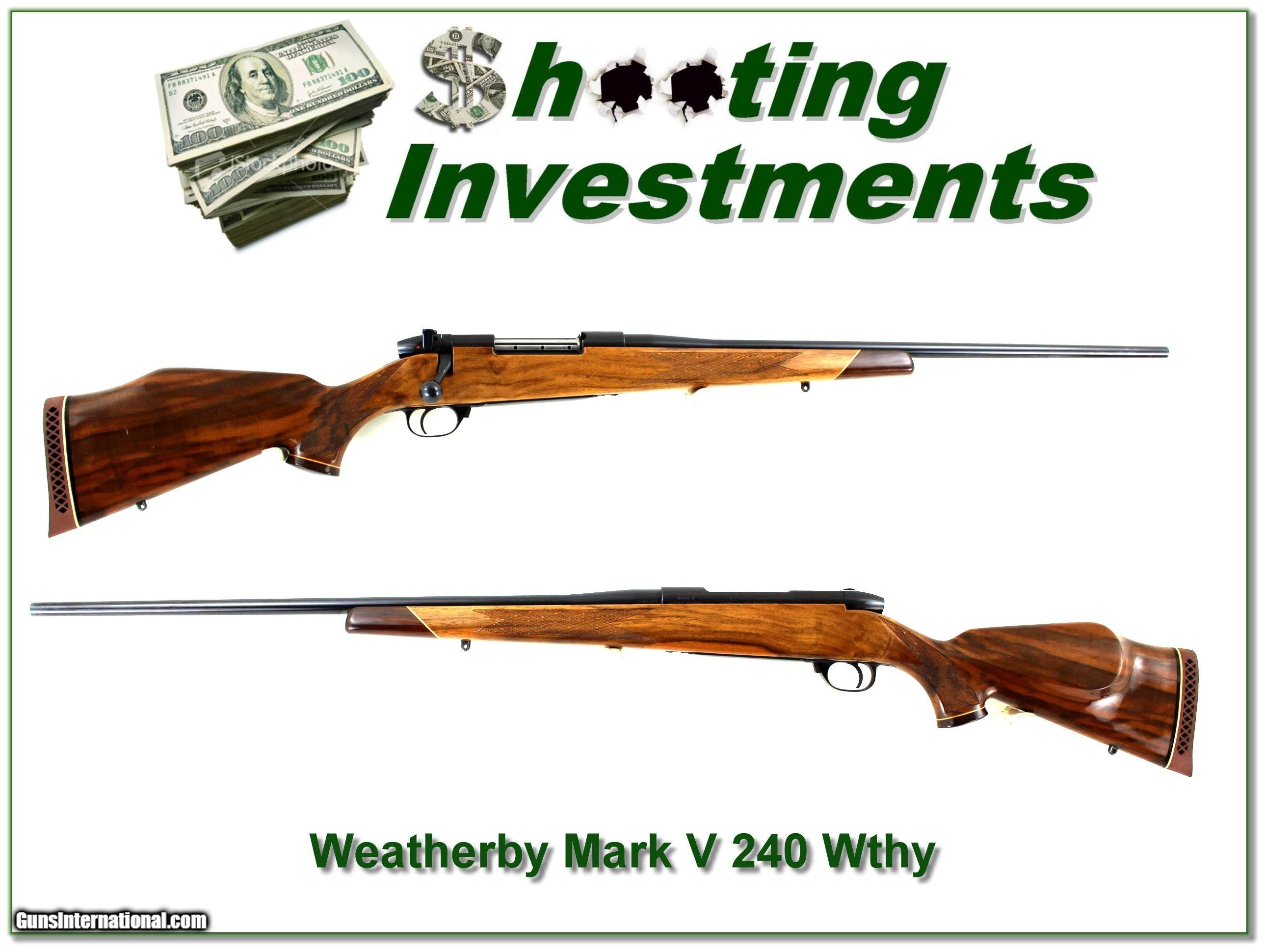 Description: This is a beautiful Weatherby Mark V Deluxe in 240 Weatherby Magnum. It is the original 9-lug Mark V. The wood is outstanding honey blond. This is the lightweight 24in gun and from the razor-sharp lugs I know not many rounds fired. I only find a few rubs at the end of the barrel. It will make a classic deer gun or be a fine addition to your collection! Shipping and insurance is $49. Please email me with any questions or larger pictures. (Consign your quality firearms with Shooting Investments for only 12%! Let me know if you have any you would like to sell!) 23-0513 Payment: Payment is by Money Order, Cashier’s Check or Personal Check. I can now also accept Credit Cards (MasterCard, Visa, Discover & American Express) with a 3% convenience fee. Shipping: The shipping charge will be listed in each description. It is $49 for most firearms. Some heavy guns or those insured for over $2000 will be higher. Shipments to Alaska and Hawaii are higher because air shipment is required. Most firearms are shipped on Tuesday and Thursday and usually in 5 days of receipt of payment. We package all shipments carefully and insure them. Optics are shipped Priority Mail and most other non-firearm shipments are shipped First Class. Returns: Our return policy is simple. If for any reason you are not pleased with your purchase, you may return your item for a full refund of purchase price. Ammunition cannot be returned. It is important to us that you are happy. Guns cannot be fired or dissembled before returning them and they must be returned in the same condition as received. Notification of a return must occur within 3 days of receipt at your dealer. Shipping, convenience and dealer fees are not refundable and are the responsibility of the buyer. Lay-a-way: If needed, we offer a 60 day lay-a-way option on most firearms. It is 1/3 now, 1/3 in 30 days and 1/3 in 60 days. Lay-a-way firearm sales are final and cannot be returned. If a lay-a-way is not completed the first payment cannot be refunded. Consigning your firearms with Shooting Investments: We will help you get top dollar for your firearms. While most local guns shops charge 20% or more, our fee is only 12% with a minimum of $75. At your local gun shop it might take months to sell. Selling on-line provides instant access to thousands of interested buyers. You won’t find any other on-line dealer willing to sell your firearms for only 12% or listing every gun on 3 separate s. Selling through an House typically costs the seller 15% and the buyer an addition 15% (so 30%) and you have to wait several months to sell and longer to receive funds. If properly priced, we will sell your firearms within a few weeks. Send us an email or give us a call and we’ll explain how easy it is for you to get top dollar. Trading: Trading for us is really just buying your gun to re-sell. If you have a gun you want to trade, please email a picture and we will let you know what we can give for it. You will always get more if we sell it for you on consignment. SOLD |