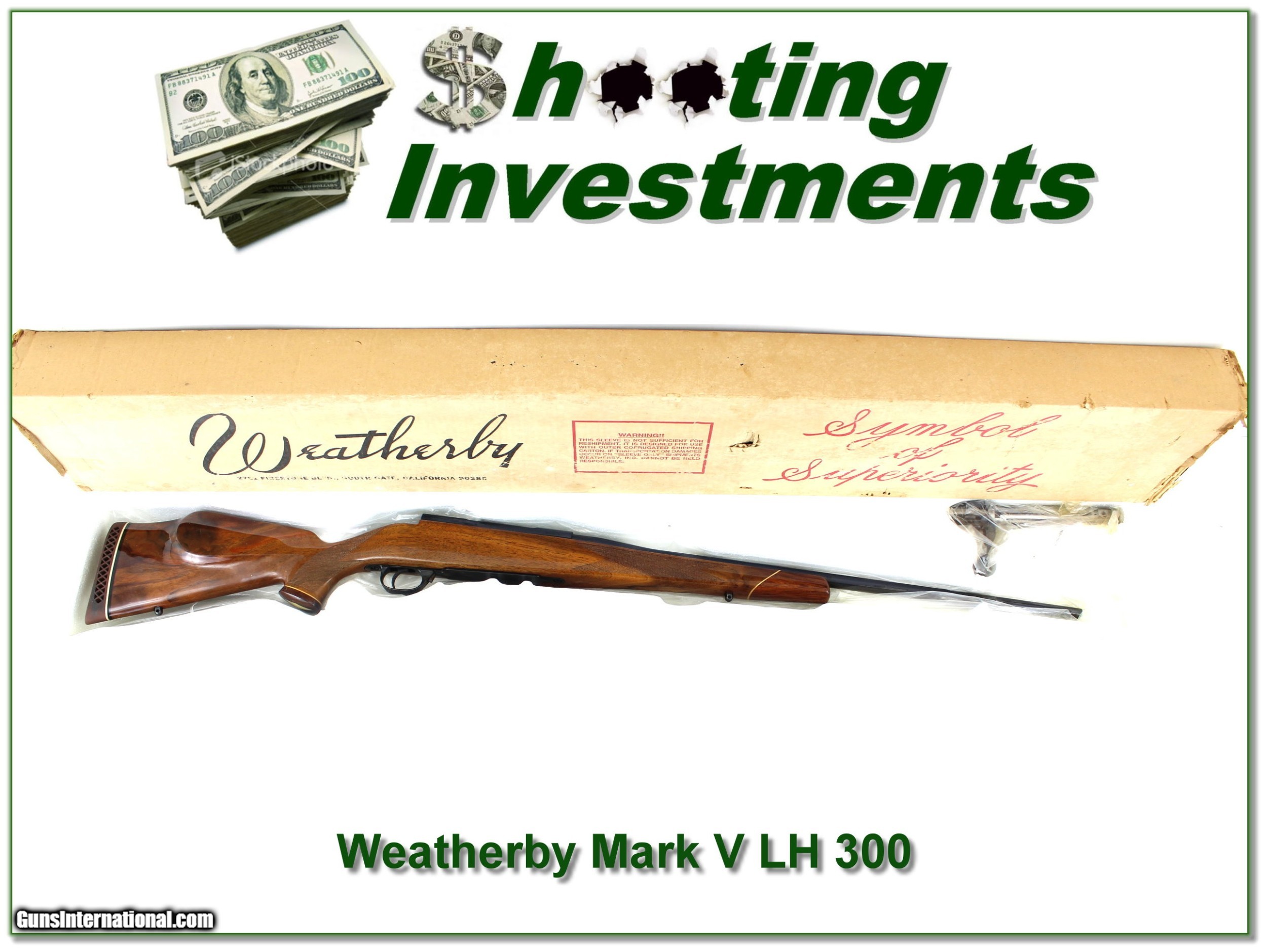 Description: Left-Handed Shooters, collectors and hunters, this is a Left-Handed Mark V Deluxe in 300 Weatherby Magnum. It is in as new condition with no marks on blue or wood. It has beautiful wood and a 24in barrel so it’s perfect for most hunters. It comes as seen in biox (no end label). From the bolt at most a few rounds fired. It will make a high-end hunting gun for the Left-handed shooter or a fine addition to your collection. Shipping and insurance is $39. Please email me with any questions or larger pictures. (Consign your quality firearms with Shooting Investments for only 12%! Let me know if you have any you would like to sell!) 20-0521 Payment: Payment is by Money Order, Cashiers Check or Personal Check. I can now also accept Credit Cards (MasterCard, Visa, Discover & American Express) with a 3% convenience fee. Shipping: The shipping charge will be listed in each description. It is $39 for most firearms. Some heavy guns or those insured for over $2000 will be higher. Shipments to Alaska and Hawaii are higher because air shipment is required. Most firearms are shipped on Tuesday and Thursday and usually in 5 days of receipt of payment. We package all shipments carefully and insure them. Optics are shipped Priority Mail and most other non-firearm shipments are shipped First Class. Returns: Our return policy is simple. If for any reason you are not pleased with your purchase, you may return your item for a full refund of purchase price. Ammunition cannot be returned. It is important to us that you are happy. Guns cannot be fired or dissembled before returning them and they must be returned in the same condition as received. Notification of a return must occur with-in 3 days of receipt at your dealer. Shipping, convenience and dealer fees are not refundable and are the responsibility of the buyer. Lay-a-way: If needed, we offer a 60 day lay-a-way option on most firearms. It is 1/3 now, 1/3 in 30 days and 1/3 in 60 days. Lay-a-way firearm sales are final and if not completed the first payment cannot be returned. Consigning your firearms with Shooting Investments: We will help you get top dollar for your firearms. While most local guns shops charge 20% or more, our fee is only 12% with a minimum of $75. At your local gun shop it might take months to sell. Selling on-line provides instant access to thousands of interested buyers. You won’t find any other on-line dealer willing to sell your firearms for only 12% or listing every gun on 3 separate s. Selling through an House typically costs the seller 15% and the buyer an addition 15% (so 30%) and you have to wait several months to sell and longer to receive funds. If properly priced, we will sell your firearms in a few weeks. Send us an email or give us a call and we’ll explain how easy it is for you to get top dollar. Trading: Trading for use is really just buying your gun to re-sell. If you have a gun you want to trade, please email a picture and we will let you know what we can give or it. You will always get more if we sell it for you on consignment. Help for California Buyers: We are happy to ship to California. It is the buyer’s responsibility to make sure any item you buy is legal in your state. We are also happy to help with your purchase of a firearm from someone other than us. If you see a gun you would like to buy but the seller can’t or won’t ship to California they can ship to use and we’ll then ship it to your California dealer. The cost for this service is only $30 + shipping. Let us know if we can help! SOLD |