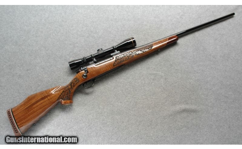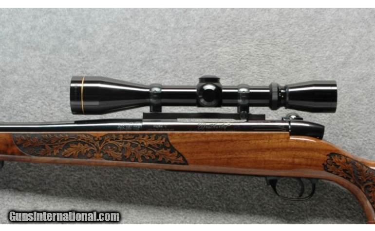 Description: This is a pre-owned Weatherby Mark V Lasermark in .300 Weatherby Magnum with a 26 inch barrel. It features a laser carved pistol griped walnut raised comb Monte Carlo stock with a rosewood tipped forearm and pistol grip, a factory Pachmayr recoil pad with Weatherby logo, and a Leopold 3X9X40 Vari –X IIIc with Leopold mounts. The rifle is in excellent condition showing little to no wear on the wood or metal. SOLD Manufacturer: 1983 Â? 1984 Caliber Info: .300 Weatherby Magnum Metal Condition: Shows little to no wear. Wood Condition: Shows little to no wear. Bore Condition: Clean with bright lands. Barrels: 26Â? Stock: Laser carved pistol griped walnut raised comb Monte Carlo stock with a rosewood tipped pistol grip. Stock Dimensions: 13 5/8Â? LOP Fore End: Laser carved walnut with a rosewood tipped forearm. Butt Pad: Factory Pachmayr recoil pad with Weatherby logo. Weight: 9 lbs. Sights: Leopold 3X9X40 Vari Â?X IIIc with Leopold mounts. Extras: Comes with a Leopold 3X9X40 Vari Â?X IIIc with Leopold mounts. Item Location: Glendale, AZ |
