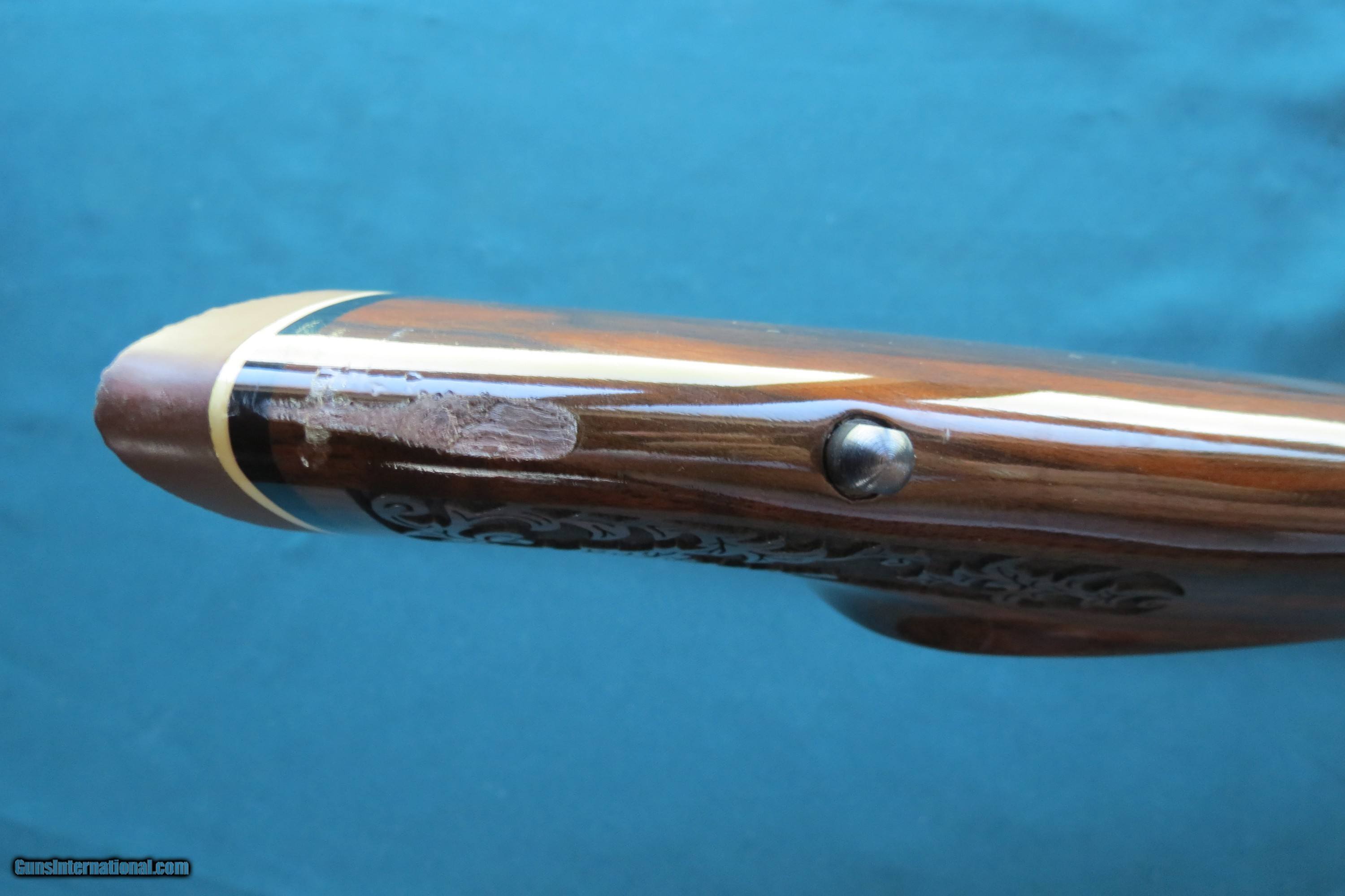Description: Weatherby Mark V Lazermark in 224 Weatherby, manufactured in Japan, 26" high luster blued barrel, hinged floorplate, sling swivel studs, 1" rings w/bases. Rifle appears to have very little usage. Beautiful rifle with a couple lite inperfections in the stock and a noticable 1 1/4" chip (pictured) in stock between sling swivel stud and butt pad. Ships in hard case, Shipping/insurance $75 SOLD Rifle Caliber: .224 Weatherby Magnum Manufacturer: Weatherby Model: Mark V Lazermark Barrel Length: 26 Condition: Excellent less chip in stock |