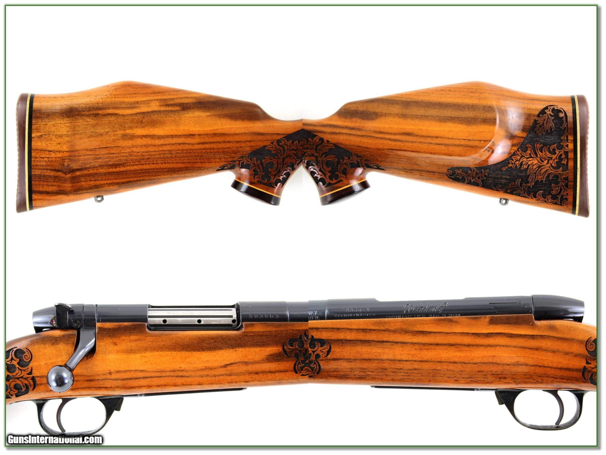 Description: Collectors, shooters and Varmint hunters, this is a VERY HARD TO FIND 5-Panel Lazermark Weatherby Mark V Varmintmaster in 22-250 Remington. The blue on this one is excellent. The barrel is 24in. The wood has beautiful grain and some marks from light use. Based on the metal and sharp lugs I’m sure not shot a lot. Finding these early Varmintmasters in Lazermark ha gotten VERY hard. This one will make a nice addition to your collection. Shipping and insurance is $39. Please email me with any questions or larger pictures. (Consign your quality firearms with Shooting Investments for only 12%! Let me know if you have any you would like to sell!) 20-0437 Payment: Payment is by Money Order, Cashiers Check or Personal Check. I can now also accept MasterCard and Visa with a 3% convenience fee. PayPal can be used for some items but never firearms. Please let us know if you would like to pay via PayPal. Shipping: The shipping charge will be listed in each description. It is $39 for most guns. Some heavy guns or those insured for over $2000 will be higher. Shipments to Alaska and Hawaii are higher because air shipment is required. Most firearms are shipped on Tuesday and Thursday and usually in 5 days of receipt of payment. We package all shipments carefully and insure them. Returns: Our return policy is simple. If for any reason you are not pleased with your purchase, you may return your item for a full refund of purchase price. Ammunition cannot be returned. It is important to us that you are happy. Guns cannot be fired or dissembled before returning them and they must be returned in the same condition as received. Notification of a return must occur with-in 3 days of receipt at your dealer. Shipping, convenience and dealer fees are not refundable and are the responsibility of the buyer. Lay-a-way: If needed, we offer a 60 day lay-a-way option on most firearms. It is 1/3 now, 1/3 in 30 days and 1/3 in 60 days. Lay-a-way firearm sales are final and if not completed the first payment cannot be returned. Consigning your firearms with Shooting Investments: We will help you get top dollar for your firearms. While most local guns shops charge 20% or more, our fee is only 12% with a minimum of $75. At your local gun shop it might take months to sell. Selling on-line provides instant access to thousands of interested buyers. You won’t find any other on-line dealer willing to sell your firearms for only 12% or listing every gun on 3 separate s. Selling through an House typically costs the seller 15% and the buyer an addition 15% (so 30%) and you have to wait several months to sell and longer to receive funds. If properly priced, we will sell your firearms in a few weeks. Send us an email or give us a call and we’ll explain how easy it is for you to get top dollar. Trading: Trading for use is really just buying your gun to re-sell. If you have a gun you want to trade, please email a picture and we will let you know what we can give or it. You will always get more if we sell it for you on consignment. Help for California Buyers: We are happy to ship to California. It is the buyer’s responsibility to make sure any item you buy is legal in your state. We are also happy to help with your purchase of a firearm from someone other than us. If you see a gun you would like to buy but the seller can’t or won’t ship to California they can ship to use and we’ll then ship it to your California dealer. The cost for this service is only $30 + shipping. Let us know if we can help! SOLD |
