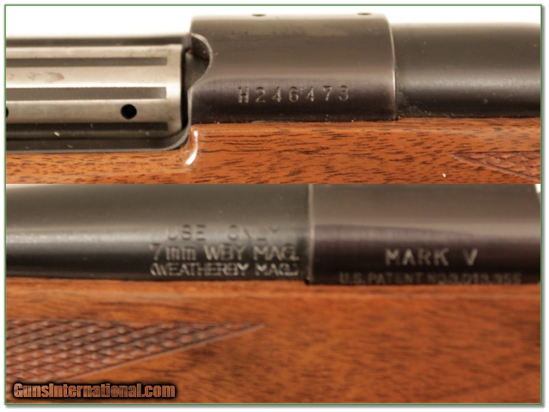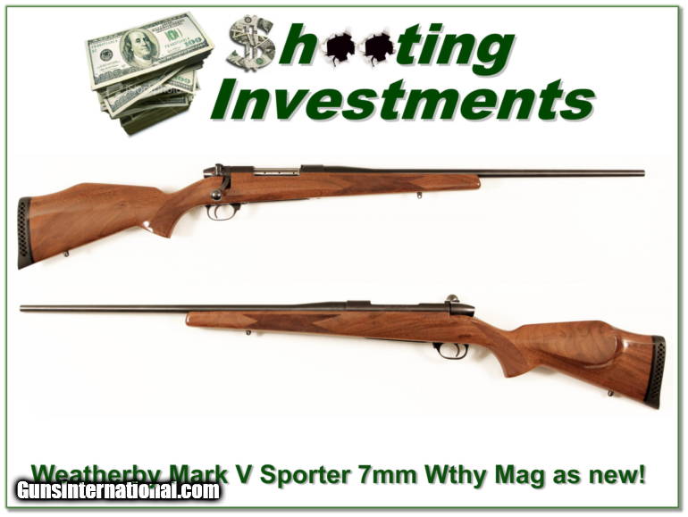 Description: This is a near new and beautiful Weatherby Mark V Sporter in 7mm Wthy mag. Blue and wood have no marks of note. The wood grain is much better than most. I am sure it was never shot more than a few times. This will make a high end hunting gun as the price of a low cost massed produced new one. That is why this is a real Shooting Investment and Smart Money! Shipping and insurance is $30 and please email me with any questions or larger pictures. (I now consign quality firearms only 10%! Let me know if you have any you would like to sell!) [14-1013] Payment: Payment is by Money Order, Cashiers Check or Personal Check. I can now also accept MasterCard and Visa with a 3% convenience fee. PayPal can be used for some items but never firearms. Please let us know if you would like to pay via PayPal. Shipping: The shipping charge will be listed in each description. It is $30 for most guns. Some heavy guns or those insured for over $2000 may be higher. Shipments to Alaska and Hawaii are higher because air shipment is required. Most firearms are shipped within 5 days of receipt of payment. We prefer shipping at the beginning of the week to avoid firearms in transit over weekends. We package all shipments carefully and insure them for the full purchase price, rounded up to the next $100. In the unlikely event that damage occurs, it is important that you save all packaging material for the claims process. Optics are shipped Priority Mail and most other non-firearm shipments are shipped First Class. Returns: Our return policy is simple. If for any reason you are not pleased with your purchase, you may return your item for a refund. The only exception is ammunition, it cannot be returned. It is important to us that you are happy. Guns cannot be fired or dissembled before returning them and must be returned in the same condition as received. Notification of a return must occur with-in 3 days of receipt at your dealer. Shipping, convenience and dealer fees are not refundable and are the responsibility of the buyer. Lay-a-way: If needed, we offer a 60 day lay-a-way option on most firearms. It is 1/3 now, 1/3 in 30 days and 1/3 in 60 days. Lay-a-way firearm sales are final. Consigning your firearms with Shooting Investments: We will help you get top dollar for your firearms. While most local guns shops charge 20% or more, our fee is only 10% with a minimum of $50. At your local gun shop it might take months to sell. Selling on-line provides instant access to thousands of interested buyers. You won’t find any other on-line dealer willing to sell your firearms for only 10% or listing every gun on 4 separate s. Selling through an House typically costs the seller 15% and the buyer an addition 15% (so 30%) and you have to wait several months to sell and longer to receive funds. If properly priced, we will sell your firearms in a week or two. Send us an email or give us a call and we’ll explain how easy it is for you to get top dollar. Trading: We collect guns and usually just trade for guns we want to add to our collections. We often sell guns for others wanting to purchase one of ours. We find this the most fair to both of us. Our Commission is only 10% and we hold the gun you want until yours sells. Please contact us if you want to sell one of yours to buy one of ours. Help for California Buyers: We are happy to ship to California. It is the buyer’s responsibility to make sure any item you buy is legal in your state. We are also happy to help with your purchase of a firearm from someone other than us. If you see a gun you would like to buy but the seller can’t or won’t ship to California we can help. You buy the gun and have it shipped to us. We’ll then ship it to your California dealer. The cost for this service is only $30 + shipping. Let me know if we can help! SOLD |