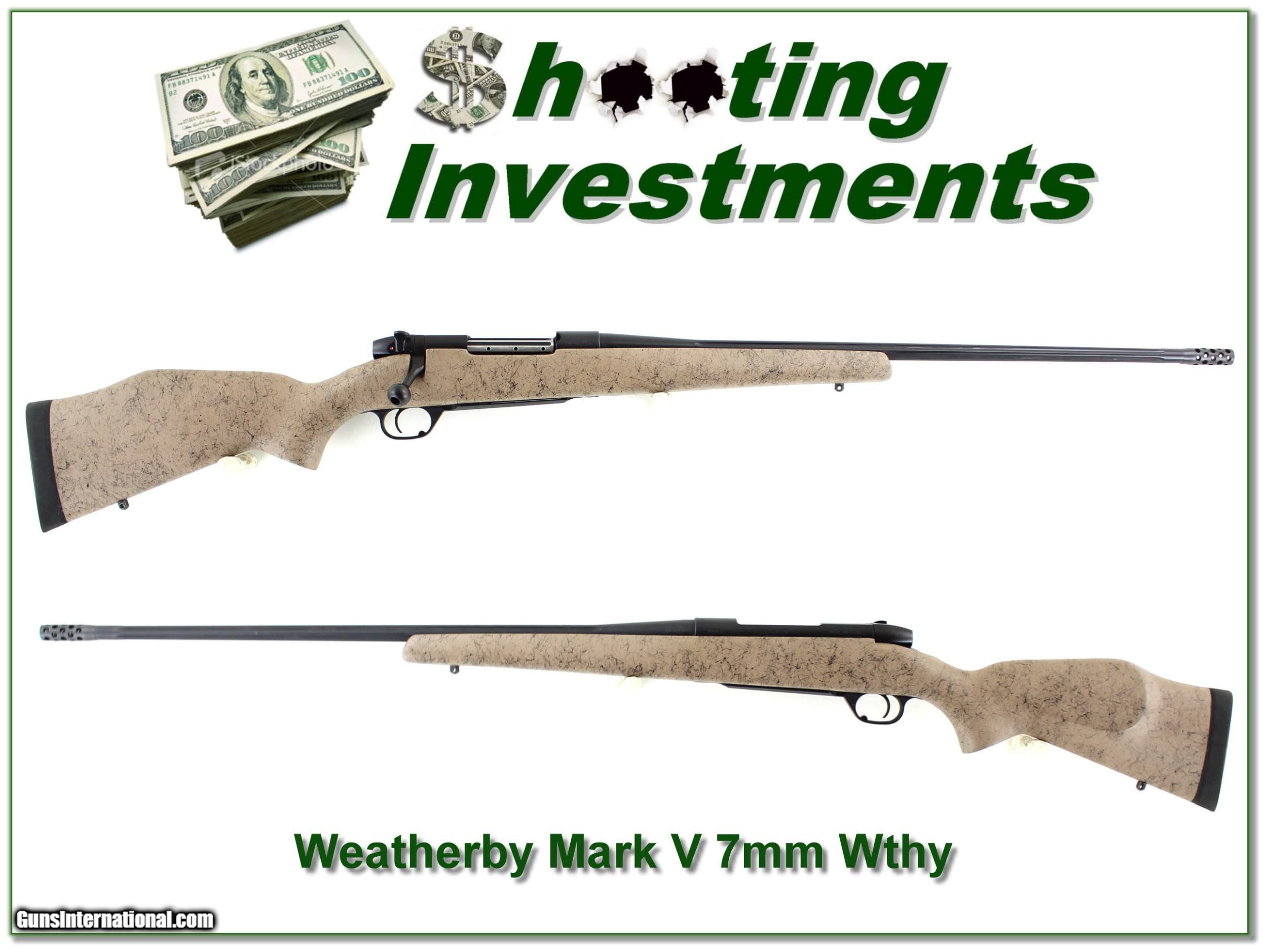 Description: This is a near new Weatherby Mark V Ultralight in 7mm Weatherby Magnum. It is a VERY hard to find 7mm with Accubreak! With the break this will make recoil more like a 243. From the razor sharp lugs I am sure only a few rounds fired. It will make a high-end long range big game gun from deer to elk and moose. It has a 26in fluted barrel including the break. It is a real Shooting Investment! Shipping and insurance is $39. Please email me with any questions or larger pictures. (Consign your quality firearms with Shooting Investments for only 12%! Let me know if you have any you would like to sell!) 21-0383 Payment: Payment is by Money Order, Cashiers Check or Personal Check. I can now also accept Credit Cards (MasterCard, Visa, Discover & American Express) with a 3% convenience fee. Shipping: The shipping charge will be listed in each description. It is $39 for most firearms. Some heavy guns or those insured for over $2000 will be higher. Shipments to Alaska and Hawaii are higher because air shipment is required. Most firearms are shipped on Tuesday and Thursday and usually in 5 days of receipt of payment. We package all shipments carefully and insure them. Optics are shipped Priority Mail and most other non-firearm shipments are shipped First Class. Returns: Our return policy is simple. If for any reason you are not pleased with your purchase, you may return your item for a full refund of purchase price. Ammunition cannot be returned. It is important to us that you are happy. Guns cannot be fired or dissembled before returning them and they must be returned in the same condition as received. Notification of a return must occur with-in 3 days of receipt at your dealer. Shipping, convenience and dealer fees are not refundable and are the responsibility of the buyer. Lay-a-way: If needed, we offer a 60 day lay-a-way option on most firearms. It is 1/3 now, 1/3 in 30 days and 1/3 in 60 days. Lay-a-way firearm sales are final and if not completed the first payment cannot be returned. Consigning your firearms with Shooting Investments: We will help you get top dollar for your firearms. While most local guns shops charge 20% or more, our fee is only 12% with a minimum of $75. At your local gun shop it might take months to sell. Selling on-line provides instant access to thousands of interested buyers. You won’t find any other on-line dealer willing to sell your firearms for only 12% or listing every gun on 3 separate s. Selling through an House typically costs the seller 15% and the buyer an addition 15% (so 30%) and you have to wait several months to sell and longer to receive funds. If properly priced, we will sell your firearms in a few weeks. Send us an email or give us a call and we’ll explain how easy it is for you to get top dollar. Trading: Trading for use is really just buying your gun to re-sell. If you have a gun you want to trade, please email a picture and we will let you know what we can give or it. You will always get more if we sell it for you on consignment. Help for California Buyers: We are happy to ship to California. It is the buyer’s responsibility to make sure any item you buy is legal in your state. We are also happy to help with your purchase of a firearm from someone other than us. If you see a gun you would like to buy but the seller can’t or won’t ship to California they can ship to use and we’ll then ship it to your California dealer. The cost for this service is only $30 + shipping. Let us know if we can help! SOLD |