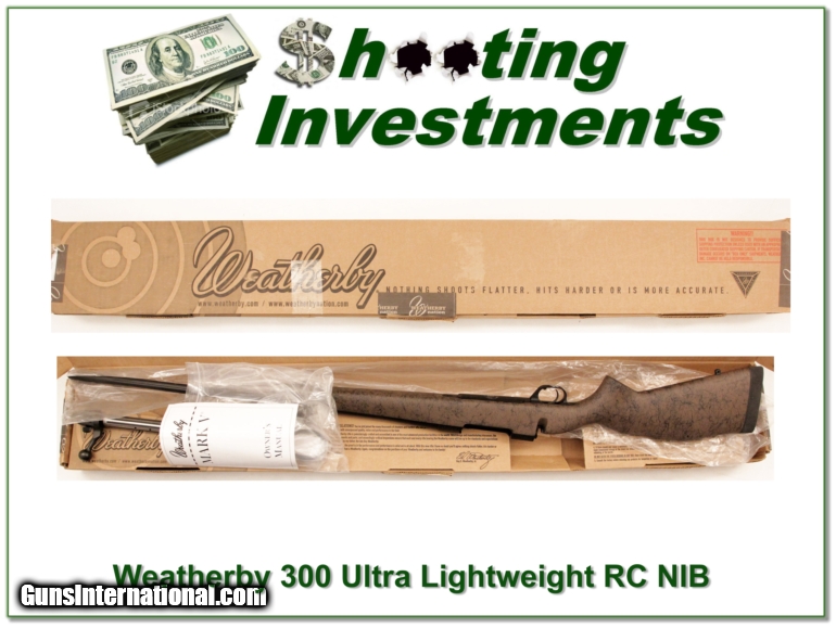 Description: This is a new and only factory fired Weatherby Mark V Ultra Light Weight RC (Custom Shop Range Certified) in 300 Wthy Mag. This one was built without the break and is perfect for the extreme hunter that needs the big 300 in a light weight carry gun. It does have recoil. Now they only sell the 300 RC with the break and it is $2700! Buy this one before I decide to keep it! Shipping and insurance is $30 or for $18 more (my cost) I’ll ship it in a new Plano hard case. Please email me with any questions or larger pictures. (I now consign quality firearms only 10%! Let me know if you have any you would like to sell!) [15-0281] Payment: Payment is by Money Order, Cashiers Check or Personal Check. I can now also accept MasterCard and Visa with a 3% convenience fee. PayPal can be used for some items but never firearms. Please let us know if you would like to pay via PayPal. Shipping: The shipping charge will be listed in each description. It is $30 for most guns. Some heavy guns or those insured for over $2000 may be higher. Shipments to Alaska and Hawaii are higher because air shipment is required. Most firearms are shipped within 5 days of receipt of payment. We prefer shipping at the beginning of the week to avoid firearms in transit over weekends. We package all shipments carefully and insure them for the full purchase price, rounded up to the next $100. In the unlikely event that damage occurs, it is important that you save all packaging material for the claims process. Optics are shipped Priority Mail and most other non-firearm shipments are shipped First Class. Returns: Our return policy is simple. If for any reason you are not pleased with your purchase, you may return your item for a refund. The only exception is ammunition, it cannot be returned. It is important to us that you are happy. Guns cannot be fired or dissembled before returning them and must be returned in the same condition as received. Notification of a return must occur with-in 3 days of receipt at your dealer. Shipping, convenience and dealer fees are not refundable and are the responsibility of the buyer. Lay-a-way: If needed, we offer a 60 day lay-a-way option on most firearms. It is 1/3 now, 1/3 in 30 days and 1/3 in 60 days. Lay-a-way firearm sales are final. Consigning your firearms with Shooting Investments: We will help you get top dollar for your firearms. While most local guns shops charge 20% or more, our fee is only 10% with a minimum of $50. At your local gun shop it might take months to sell. Selling on-line provides instant access to thousands of interested buyers. You won’t find any other on-line dealer willing to sell your firearms for only 10% or listing every gun on 4 separate s. Selling through an House typically costs the seller 15% and the buyer an addition 15% (so 30%) and you have to wait several months to sell and longer to receive funds. If properly priced, we will sell your firearms in a week or two. Send us an email or give us a call and we’ll explain how easy it is for you to get top dollar. Trading: We collect guns and usually just trade for guns we want to add to our collections. We often sell guns for others wanting to purchase one of ours. We find this the most fair to both of us. Our Commission is only 10% and we hold the gun you want until yours sells. Please contact us if you want to sell one of yours to buy one of ours. Help for California Buyers: We are happy to ship to California. It is the buyer’s responsibility to make sure any item you buy is legal in your state. We are also happy to help with your purchase of a firearm from someone other than us. If you see a gun you would like to buy but the seller can’t or won’t ship to California we can help. You buy the gun and have it shipped to us. We’ll then ship it to your California dealer. The cost for this service is only $30 + shipping. Let me know if we can help! SOLD |