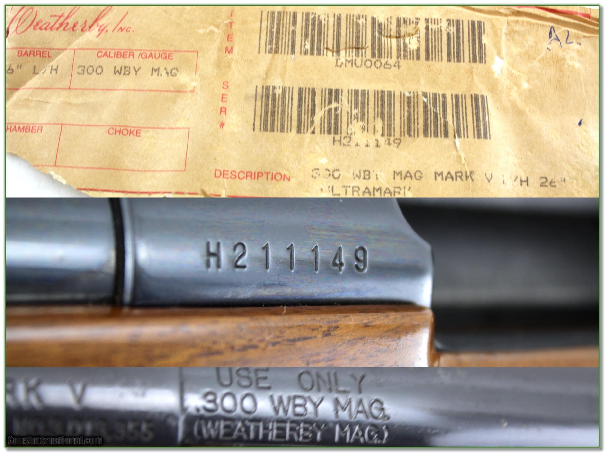 Description: Shooters and hunters, this is a hard to find Left Hander Weatherby UltraMark in 300 Weatherby Magnum. It has a 26in barrel and comes as seen in orignla box with manual and test target. These Ultramarks are Custom Shop made Weatherby with upgraded wood and features like jeweled bolt and follower. Checkered bolt handle and extended grip checkering. The engraved floorplate says Weatherby Ultramark. This one has some use with a few marks here and there. It will make a high-end hunting gun for the Left Handed shooter or be a fine addition to your collection. Shipping and insurance is $59. Please email me with any questions or larger pictures. (Consign your quality firearms with Shooting Investments for only 12%! Let me know if you have any you would like to sell!) 21-1603 Payment: Payment is by Money Order, Cashiers Check or Personal Check. I can now also accept Credit Cards (MasterCard, Visa, Discover & American Express) with a 3% convenience fee. Shipping: The shipping charge will be listed in each description. It is $49 for most long guns. Some heavy guns, over 48in boxes or those insured for over $2000 will be higher. Shipments to Alaska and Hawaii are higher because air shipment is required. Most firearms are shipped on Tuesday and Thursday and usually in 5 days of receipt of payment. We package all shipments carefully and insure them. Optics are shipped Priority Mail and most other non-firearm shipments are shipped First Class. Returns: Our return policy is simple. If for any reason you are not pleased with your purchase, you may return your item for a full refund of purchase price. Ammunition cannot be returned. It is important to us that you are happy. Guns cannot be fired or dissembled before returning them and they must be returned in the same condition as received. Notification of a return must occur with-in 3 days of receipt at your dealer. Shipping, convenience and dealer fees are not refundable and are the responsibility of the buyer. Lay-a-way: If needed, we offer a 60 day lay-a-way option on most firearms. It is 1/3 now, 1/3 in 30 days and 1/3 in 60 days. Lay-a-way firearm sales are final and if not completed the first payment cannot be returned. Consigning your firearms with Shooting Investments: We will help you get top dollar for your firearms. While most local guns shops charge 20% or more, our fee is only 12% with a minimum of $75. At your local gun shop it might take months to sell. Selling on-line provides instant access to thousands of interested buyers. You won’t find any other on-line dealer willing to sell your firearms for only 12% or listing every gun on 3 separate s. Selling through an House typically costs the seller 15% and the buyer an addition 15% (so 30%) and you have to wait several months to sell and longer to receive funds. If properly priced, we will sell your firearms in a few weeks. Send us an email or give us a call and we’ll explain how easy it is for you to get top dollar. Trading: Trading for use is really just buying your gun to re-sell. If you have a gun you want to trade, please email a picture and we will let you know what we can give or it. You will always get more if we sell it for you on consignment. Help for California Buyers: We are happy to ship to California. It is the buyer’s responsibility to make sure any item you buy is legal in your state. We are also happy to help with your purchase of a firearm from someone other than us. If you see a gun you would like to buy but the seller can’t or won’t ship to California they can ship to use and we’ll then ship it to your California dealer. The cost for this service is only $30 + shipping. Let us know if we can help! SOLD |