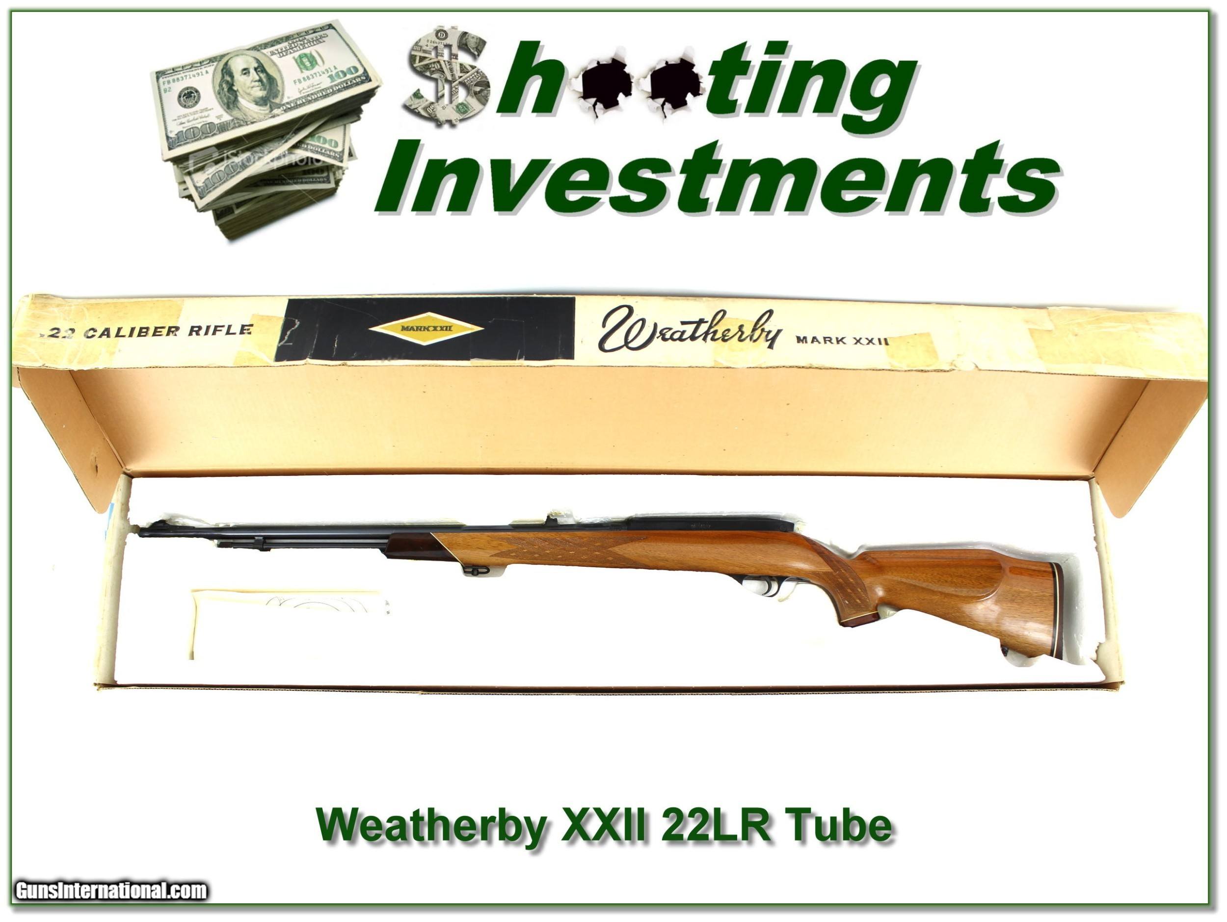 Description: This is a Weatherby Mark V XXII 22 LR semi-auto. It is the harder to find tube model. This is an earlier on and comes as seen in original box. Included are the hang tag, manual and factory test target. It has all 3 holes at about .5in 50 yards. This one has beautiful bold wood with just a few minor marks. It will make a fine addition to your collection and finding on in the earlier box has gotten very hard. Shipping and insurance is $39. Please email me with any questions or larger pictures. (Consign your quality firearms with Shooting Investments for only 12%! Let me know if you have any you would like to sell!) 20-0591 Payment: Payment is by Money Order, Cashiers Check or Personal Check. I can now also accept Credit Cards (MasterCard, Visa, Discover & American Express) with a 3% convenience fee. Shipping: The shipping charge will be listed in each description. It is $39 for most firearms. Some heavy guns or those insured for over $2000 will be higher. Shipments to Alaska and Hawaii are higher because air shipment is required. Most firearms are shipped on Tuesday and Thursday and usually in 5 days of receipt of payment. We package all shipments carefully and insure them. Optics are shipped Priority Mail and most other non-firearm shipments are shipped First Class. Returns: Our return policy is simple. If for any reason you are not pleased with your purchase, you may return your item for a full refund of purchase price. Ammunition cannot be returned. It is important to us that you are happy. Guns cannot be fired or dissembled before returning them and they must be returned in the same condition as received. Notification of a return must occur with-in 3 days of receipt at your dealer. Shipping, convenience and dealer fees are not refundable and are the responsibility of the buyer. Lay-a-way: If needed, we offer a 60 day lay-a-way option on most firearms. It is 1/3 now, 1/3 in 30 days and 1/3 in 60 days. Lay-a-way firearm sales are final and if not completed the first payment cannot be returned. Consigning your firearms with Shooting Investments: We will help you get top dollar for your firearms. While most local guns shops charge 20% or more, our fee is only 12% with a minimum of $75. At your local gun shop it might take months to sell. Selling on-line provides instant access to thousands of interested buyers. You won’t find any other on-line dealer willing to sell your firearms for only 12% or listing every gun on 3 separate s. Selling through an House typically costs the seller 15% and the buyer an addition 15% (so 30%) and you have to wait several months to sell and longer to receive funds. If properly priced, we will sell your firearms in a few weeks. Send us an email or give us a call and we’ll explain how easy it is for you to get top dollar. Trading: Trading for use is really just buying your gun to re-sell. If you have a gun you want to trade, please email a picture and we will let you know what we can give or it. You will always get more if we sell it for you on consignment. Help for California Buyers: We are happy to ship to California. It is the buyer’s responsibility to make sure any item you buy is legal in your state. We are also happy to help with your purchase of a firearm from someone other than us. If you see a gun you would like to buy but the seller can’t or won’t ship to California they can ship to use and we’ll then ship it to your California dealer. The cost for this service is only $30 + shipping. Let us know if we can help! Payment: Payment is by Money Order, Cashiers Check or Personal Check. I can now also accept Credit Cards (MasterCard, Visa, Discover & American Express) with a 3% convenience fee. Shipping: The shipping charge will be listed in each description. It is $39 for most firearms. Some heavy guns or those insured for over $2000 will be higher. Shipments to Alaska and Hawaii are higher because air shipment is required. Most firearms are shipped on Tuesday and Thursday and usually in 5 days of receipt of payment. We package all shipments carefully and insure them. Optics are shipped Priority Mail and most other non-firearm shipments are shipped First Class. Returns: Our return policy is simple. If for any reason you are not pleased with your purchase, you may return your item for a full refund of purchase price. Ammunition cannot be returned. It is important to us that you are happy. Guns cannot be fired or dissembled before returning them and they must be returned in the same condition as received. Notification of a return must occur with-in 3 days of receipt at your dealer. Shipping, convenience and dealer fees are not refundable and are the responsibility of the buyer. Lay-a-way: If needed, we offer a 60 day lay-a-way option on most firearms. It is 1/3 now, 1/3 in 30 days and 1/3 in 60 days. Lay-a-way firearm sales are final and if not completed the first payment cannot be returned. Consigning your firearms with Shooting Investments: We will help you get top dollar for your firearms. While most local guns shops charge 20% or more, our fee is only 12% with a minimum of $75. At your local gun shop it might take months to sell. Selling on-line provides instant access to thousands of interested buyers. You won’t find any other on-line dealer willing to sell your firearms for only 12% or listing every gun on 3 separate s. Selling through an House typically costs the seller 15% and the buyer an addition 15% (so 30%) and you have to wait several months to sell and longer to receive funds. If properly priced, we will sell your firearms in a few weeks. Send us an email or give us a call and we’ll explain how easy it is for you to get top dollar. Trading: Trading for use is really just buying your gun to re-sell. If you have a gun you want to trade, please email a picture and we will let you know what we can give or it. You will always get more if we sell it for you on consignment. Help for California Buyers: We are happy to ship t