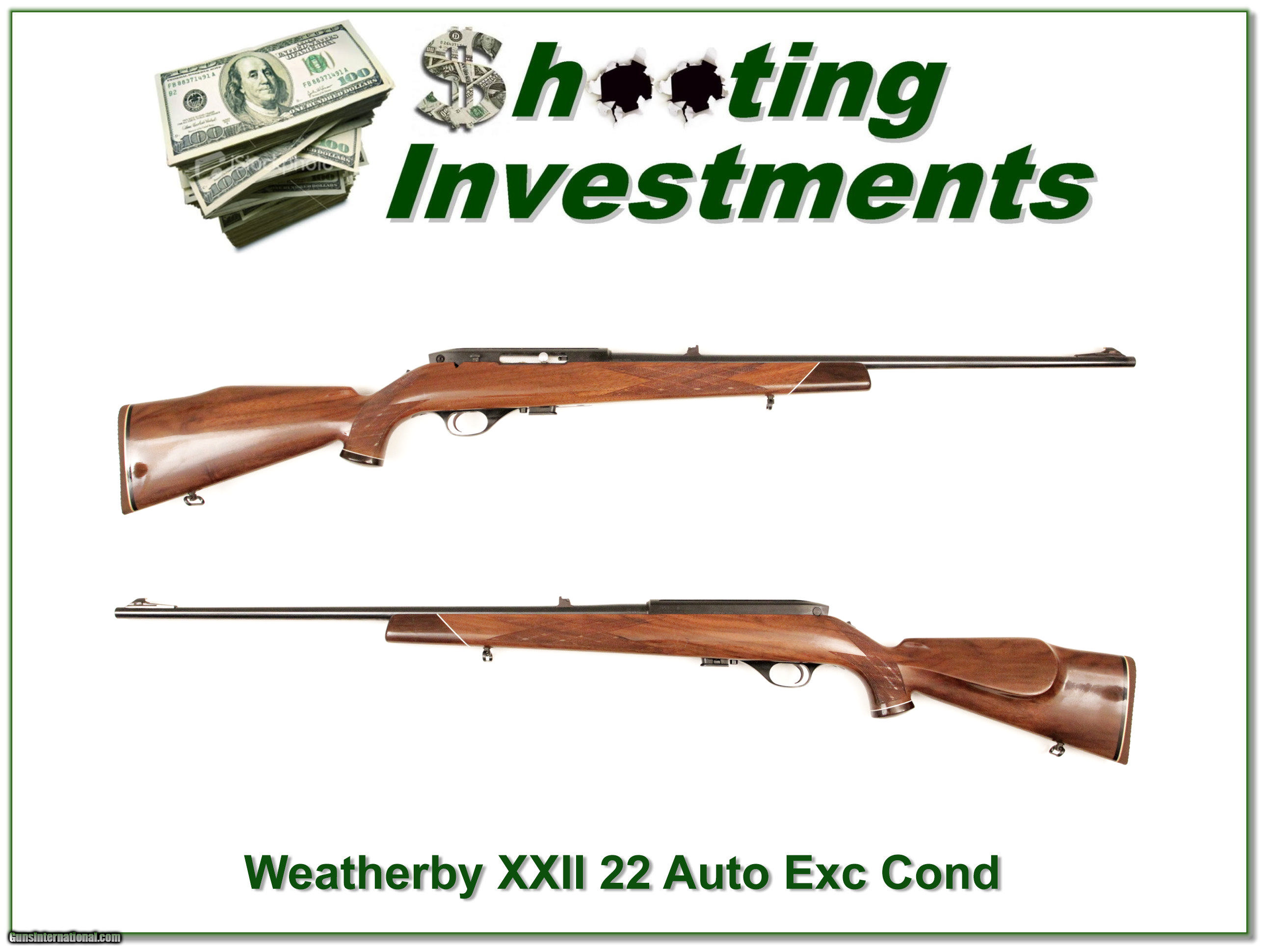 Description: This is an older Weatherby XXII semi-auto. It is very nice with excellent metal and only a couple minor marks on the wood. It is an early Japan made gun. These have become collector guns and are known for superior accuracy. Shipping and insurance is $35 or $15 more if you want it shipped in a new Plano hard case. Please email me with any questions or larger pictures. (I now consign quality firearms only 10%! Let me know if you have any you would like to sell!) [16-0151] Payment: Payment is by Money Order, Cashiers Check or Personal Check. I can now also accept MasterCard and Visa with a 3% convenience fee. PayPal can be used for some items but never firearms. Please let us know if you would like to pay via PayPal. Shipping: The shipping charge will be listed in each description. It is $35 for most guns. Some heavy guns or those insured for over $2000 will be higher. Shipments to Alaska and Hawaii are higher because air shipment is required. Most firearms are shipped within 5 days of receipt of payment. We prefer shipping at the beginning of the week to avoid firearms in transit over weekends. We package all shipments carefully and insure them for the full purchase price, rounded up to the next $100. In the unlikely event that damage occurs, it is important that you save all packaging material for the claims process. Optics are shipped Priority Mail and most other non-firearm shipments are shipped First Class. Returns: Our return policy is simple. If for any reason you are not pleased with your purchase, you may return your item for a refund. The only exception is ammunition, it cannot be returned. It is important to us that you are happy. Guns cannot be fired or dissembled before returning them and must be returned in the same condition as received. Notification of a return must occur with-in 3 days of receipt at your dealer. Shipping, convenience and dealer fees are not refundable and are the responsibility of the buyer. Lay-a-way: If needed, we offer a 60 day lay-a-way option on most firearms. It is 1/3 now, 1/3 in 30 days and 1/3 in 60 days. Lay-a-way firearm sales are final. Consigning your firearms with Shooting Investments: We will help you get top dollar for your firearms. While most local guns shops charge 20% or more, our fee is only 10% with a minimum of $50. At your local gun shop it might take months to sell. Selling on-line provides instant access to thousands of interested buyers. You won’t find any other on-line dealer willing to sell your firearms for only 10% or listing every gun on 4 separate s. Selling through an House typically costs the seller 15% and the buyer an addition 15% (so 30%) and you have to wait several months to sell and longer to receive funds. If properly priced, we will sell your firearms in a week or two. Send us an email or give us a call and we’ll explain how easy it is for you to get top dollar. Trading: We collect guns and usually just trade for guns we want to add to our collections. We often sell guns for others wanting to purchase one of ours. We find this the most fair to both of us. Our Commission is only 10% and we hold the gun you want until yours sells. Please contact us if you want to sell one of yours to buy one of ours. Help for California Buyers: We are happy to ship to California. It is the buyer’s responsibility to make sure any item you buy is legal in your state. We are also happy to help with your purchase of a firearm from someone other than us. If you see a gun you would like to buy but the seller can’t or won’t ship to California we can help. You buy the gun and have it shipped to us. We’ll then ship it to your California dealer. The cost for this service is only $30 + shipping. Let me know if we can help! SOLD |