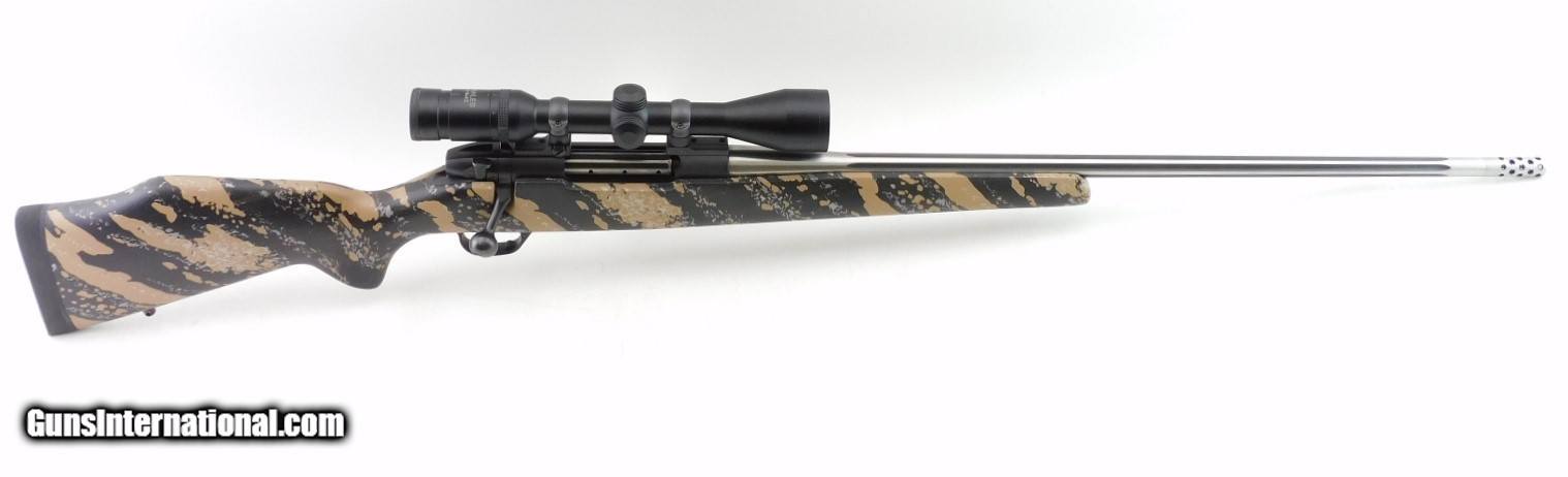 Description: Weatherby Mk V Ultra Light Kahles Pkg .300 WBYMAG, 24 in. blackened stainless steel fluted barrel with radial muzzle brake, bright shiny bore, good rifling, Kahles 3-9X42 scope, Monte Carlo composite stock with aluminum bedding block, tan/brown/silver camo, very light use marks, and factory installed Pachmayr Decelerator pad. Add 3% for Credit Card Shipping $40.00 in the 48 contiguous United States SOLD |