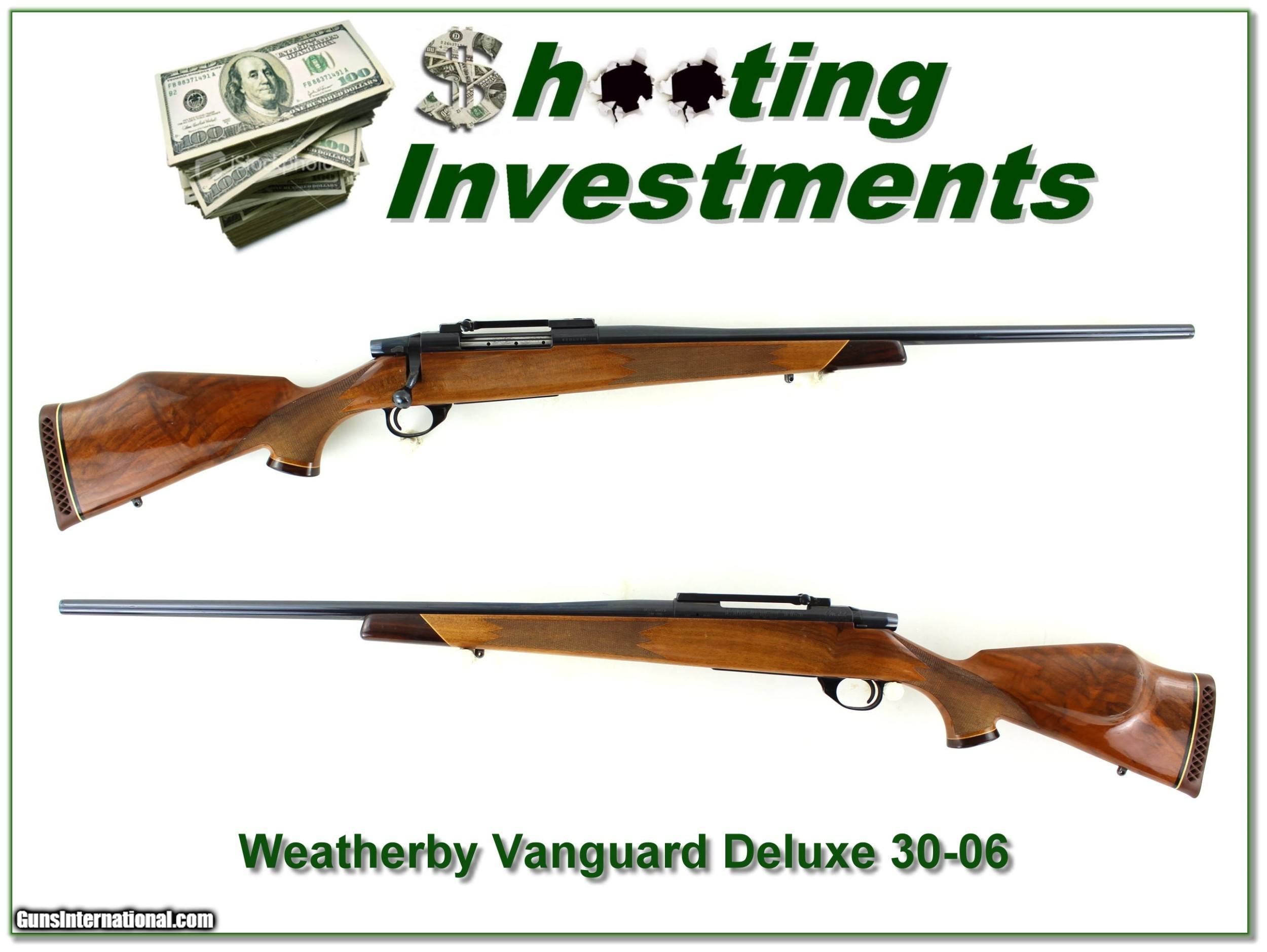 Description: This is an early Weatherby Vanguard Deluxe in 30-06. It has polished blue and high gloss stock. The barrel is 24in. It has some minor marks from some use and will make an excellent hunting gun and much less than a new gun of equal quality. It is a Shooting Investment. Shipping and insurance is $39. Please email me with any questions or larger pictures. (Consign your quality firearms with Shooting Investments for only 12%! Let me know if you have any you would like to sell!) 21-0849 Payment: Payment is by Money Order, Cashier’s Check or Personal Check. I can now also accept Credit Cards (MasterCard, Visa, Discover & American Express) with a 3% convenience fee. Shipping: The shipping charge will be listed in each description. It is $39 for most firearms. Some heavy guns or those insured for over $2000 will be higher. Shipments to Alaska and Hawaii are higher because air shipment is required. Most firearms are shipped on Tuesday and Thursday and usually in 5 days of receipt of payment. We package all shipments carefully and insure them. Optics are shipped Priority Mail and most other non-firearm shipments are shipped First Class. Returns: Our return policy is simple. If for any reason you are not pleased with your purchase, you may return your item for a full refund of purchase price. Ammunition cannot be returned. It is important to us that you are happy. Guns cannot be fired or dissembled before returning them and they must be returned in the same condition as received. Notification of a return must occur within 3 days of receipt at your dealer. Shipping, convenience and dealer fees are not refundable and are the responsibility of the buyer. Lay-a-way: If needed, we offer a 60 day lay-a-way option on most firearms. It is 1/3 now, 1/3 in 30 days and 1/3 in 60 days. Lay-a-way firearm sales are final and cannot be returned. If a lay-a-way is not completed the first payment cannot be refunded. Consigning your firearms with Shooting Investments: We will help you get top dollar for your firearms. While most local guns shops charge 20% or more, our fee is only 12% with a minimum of $75. At your local gun shop it might take months to sell. Selling on-line provides instant access to thousands of interested buyers. You won’t find any other on-line dealer willing to sell your firearms for only 12% or listing every gun on 3 separate s. Selling through an House typically costs the seller 15% and the buyer an addition 15% (so 30%) and you have to wait several months to sell and longer to receive funds. If properly priced, we will sell your firearms within a few weeks. Send us an email or give us a call and we’ll explain how easy it is for you to get top dollar. Trading: Trading for us is really just buying your gun to re-sell. If you have a gun you want to trade, please email a picture and we will let you know what we can give for it. You will always get more if we sell it for you on consignment. Help for California Buyers: We are happy to ship to California. It is the buyer’s responsibility to make sure any item you buy is legal in your state. We are also happy to help with your purchase of a firearm from someone other than us. If you see a gun you would like to buy but the seller can’t or won’t ship to California they can ship to use and we’ll then ship it to your California dealer. The cost for this service is only $30 + shipping. Let us know if we can help! SOLD |