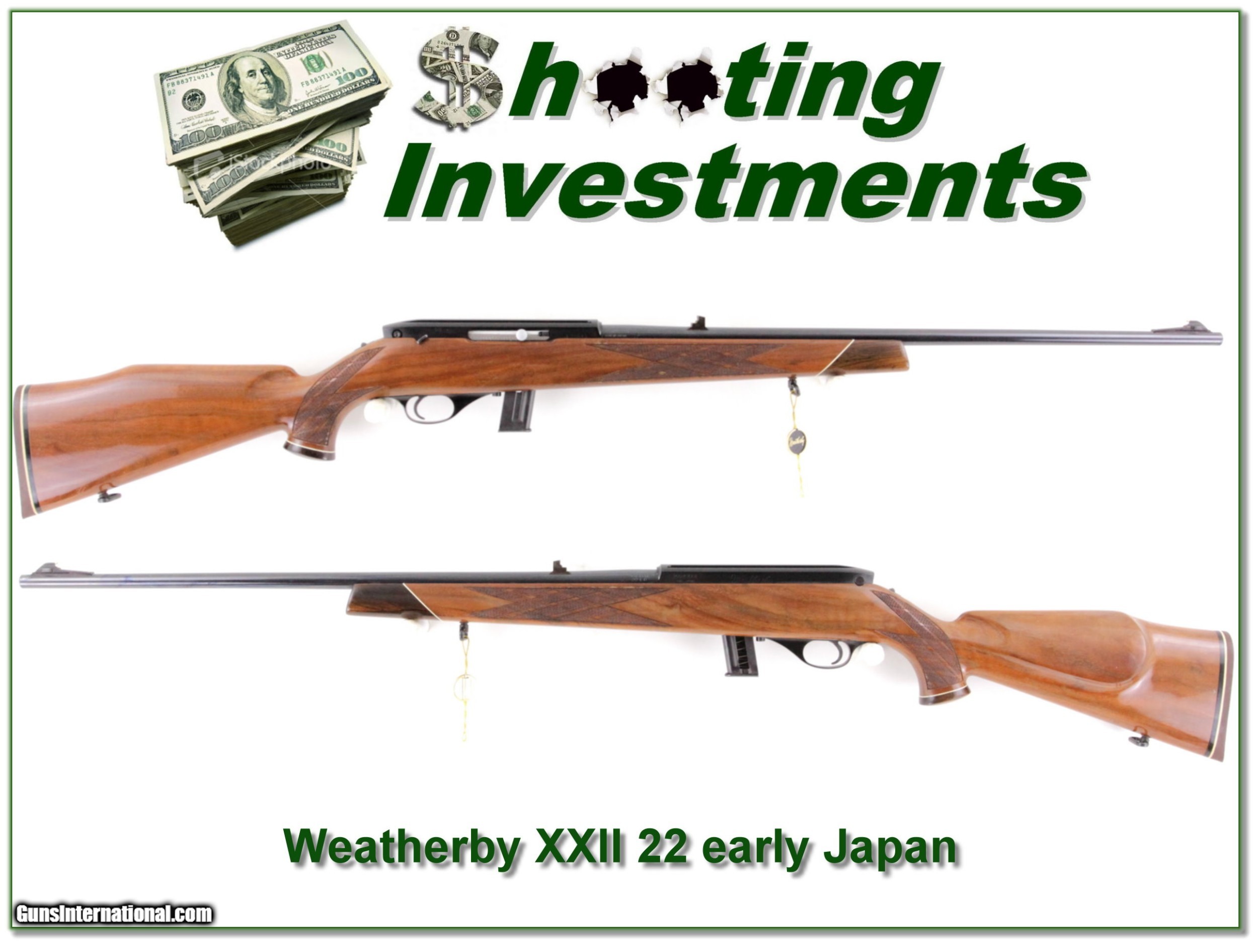 Description: Collectors and shooters this is an excellent condition Weatherby XXII 22 LR semi-auto. It is an early Japan made gun with the exact specs as the Italian guns (3 leaf rear sight, adjustable trigger, push button mag release and more robust safety). The metal and wood are near new with just a few minor marks. It comes as seen with 10 round magazine. Shipping with insurance is $39. Please email me with any questions or larger pictures. (Consign your quality firearms with Shooting Investments for only 12%! Let me know if you have any you would like to sell!) 19-0024 Payment: Payment is by Money Order, Cashiers Check or Personal Check. I can now also accept Credit Cards (MasterCard, Visa, Discover & American Express) with a 3% convenience fee. PayPal can be used for some items but never for firearms. Shipping: The shipping charge will be listed in each description. It is $39 for most firearms. Some heavy guns or those insured for over $2000 will be higher. Shipments to Alaska and Hawaii are higher because air shipment is required. Most firearms are shipped on Tuesday and Thursday and usually in 5 days of receipt of payment. We package all shipments carefully and insure them. Optics are shipped Priority Mail and most other non-firearm shipments are shipped First Class. Returns: Our return policy is simple. If for any reason you are not pleased with your purchase, you may return your item for a full refund of purchase price. Ammunition cannot be returned. It is important to us that you are happy. Guns cannot be fired or dissembled before returning them and they must be returned in the same condition as received. Notification of a return must occur with-in 3 days of receipt at your dealer. Shipping, convenience and dealer fees are not refundable and are the responsibility of the buyer. Lay-a-way: If needed, we offer a 60 day lay-a-way option on most firearms. It is 1/3 now, 1/3 in 30 days and 1/3 in 60 days. Lay-a-way firearm sales are final and if not completed the first payment cannot be returned. Consigning your firearms with Shooting Investments: We will help you get top dollar for your firearms. While most local guns shops charge 20% or more, our fee is only 12% with a minimum of $75. At your local gun shop it might take months to sell. Selling on-line provides instant access to thousands of interested buyers. You won’t find any other on-line dealer willing to sell your firearms for only 12% or listing every gun on 3 separate s. Selling through an House typically costs the seller 15% and the buyer an addition 15% (so 30%) and you have to wait several months to sell and longer to receive funds. If properly priced, we will sell your firearms in a few weeks. Send us an email or give us a call and we’ll explain how easy it is for you to get top dollar. Trading: Trading for use is really just buying your gun to re-sell. If you have a gun you want to trade, please email a picture and we will let you know what we can give or it. You will always get more if we sell it for you on consignment. Help for California Buyers: We are happy to ship to California. It is the buyer’s responsibility to make sure any item you buy is legal in your state. We are also happy to help with your purchase of a firearm from someone other than us. If you see a gun you would like to buy but the seller can’t or won’t ship to California they can ship to use and we’ll then ship it to your California dealer. The cost for this service is only $30 + shipping. Let us know if we can help! SOLD |