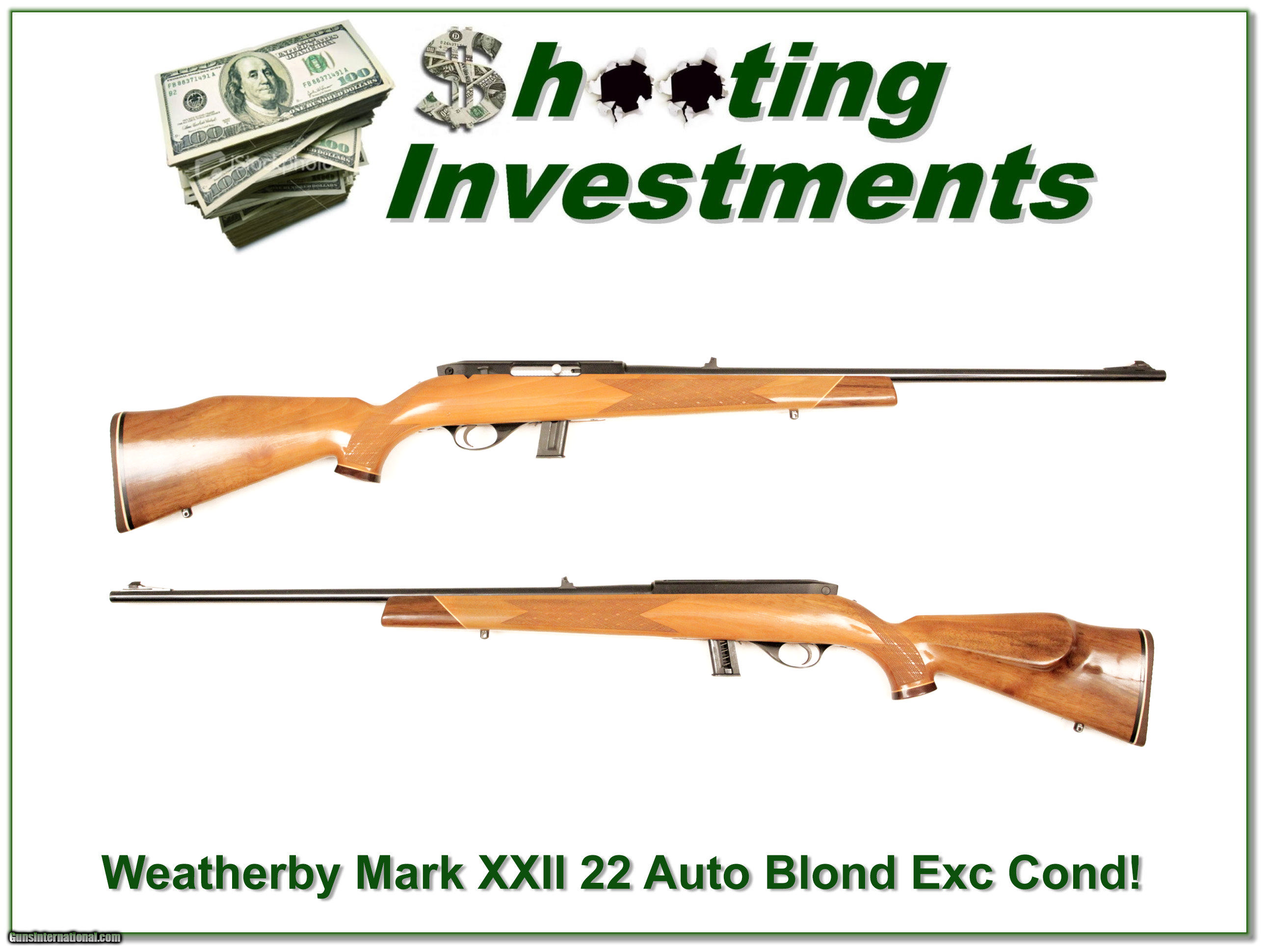 Description: This is a Weatherby XXII 22 Auto. It is in excellent condition and has a very nice Honey Blond stock with nice dark streaks. The metal is excellent and it comes with a 10 round magazine as show. These 22’s have become collector guns and are known for superior accuracy. This is a Shooting Investment. Shipping and insurance is $35 or $15 more if you want it shipped in a new Plano hard case. Please email me with any questions or larger pictures. (I now consign quality firearms only 10%! Let me know if you have any you would like to sell!) [16-0613] Payment: Payment is by Money Order, Cashiers Check or Personal Check. I can now also accept MasterCard and Visa with a 3% convenience fee. PayPal can be used for some items but never firearms. Please let us know if you would like to pay via PayPal. Shipping: The shipping charge will be listed in each description. It is $35 for most guns. Some heavy guns or those insured for over $2000 will be higher. Shipments to Alaska and Hawaii are higher because air shipment is required. Most firearms are shipped within 5 days of receipt of payment. We prefer shipping at the beginning of the week to avoid firearms in transit over weekends. We package all shipments carefully and insure them for the full purchase price, rounded up to the next $100. In the unlikely event that damage occurs, it is important that you save all packaging material for the claims process. Optics are shipped Priority Mail and most other non-firearm shipments are shipped First Class. Returns: Our return policy is simple. If for any reason you are not pleased with your purchase, you may return your item for a refund. The only exception is ammunition, it cannot be returned. It is important to us that you are happy. Guns cannot be fired or dissembled before returning them and must be returned in the same condition as received. Notification of a return must occur with-in 3 days of receipt at your dealer. Shipping, convenience and dealer fees are not refundable and are the responsibility of the buyer. Lay-a-way: If needed, we offer a 60 day lay-a-way option on most firearms. It is 1/3 now, 1/3 in 30 days and 1/3 in 60 days. Lay-a-way firearm sales are final. Consigning your firearms with Shooting Investments: We will help you get top dollar for your firearms. While most local guns shops charge 20% or more, our fee is only 10% with a minimum of $50. At your local gun shop it might take months to sell. Selling on-line provides instant access to thousands of interested buyers. You won’t find any other on-line dealer willing to sell your firearms for only 10% or listing every gun on 4 separate s. Selling through an House typically costs the seller 15% and the buyer an addition 15% (so 30%) and you have to wait several months to sell and longer to receive funds. If properly priced, we will sell your firearms in a week or two. Send us an email or give us a call and we’ll explain how easy it is for you to get top dollar. Trading: We collect guns and usually just trade for guns we want to add to our collections. We often sell guns for others wanting to purchase one of ours. We find this the most fair to both of us. Our Commission is only 10% and we hold the gun you want until yours sells. Please contact us if you want to sell one of yours to buy one of ours. Help for California Buyers: We are happy to ship to California. It is the buyer’s responsibility to make sure any item you buy is legal in your state. We are also happy to help with your purchase of a firearm from someone other than us. If you see a gun you would like to buy but the seller can’t or won’t ship to California we can help. You buy the gun and have it shipped to us. We’ll then ship it to your California dealer. The cost for this service is only $30 + shipping. Let me know if we can help! SOLD |