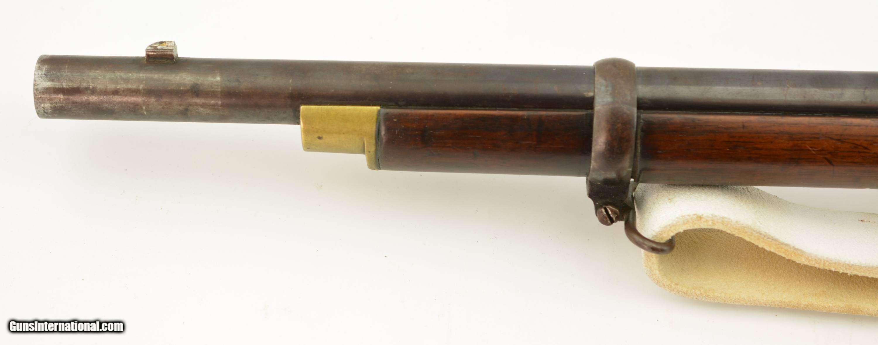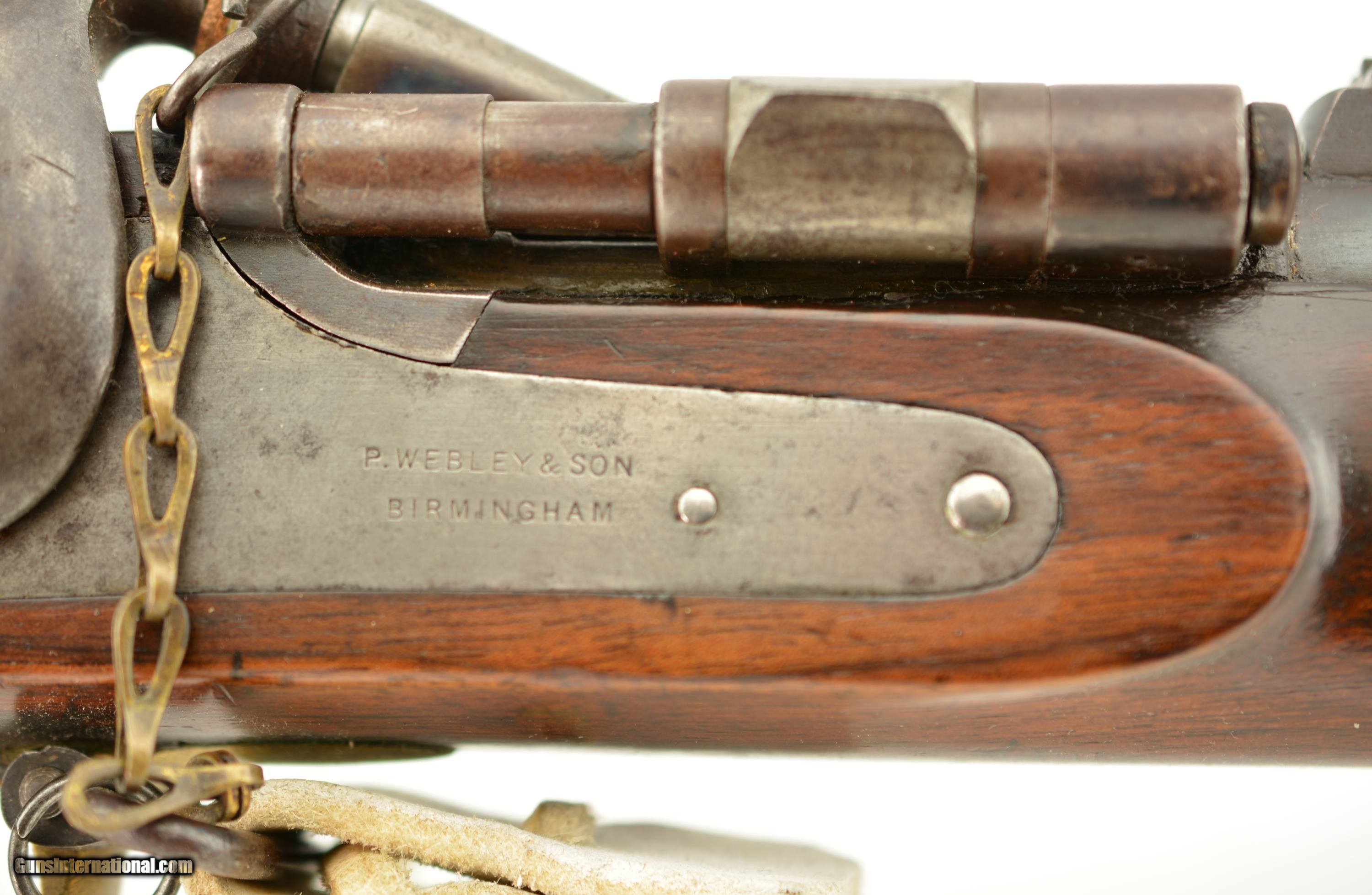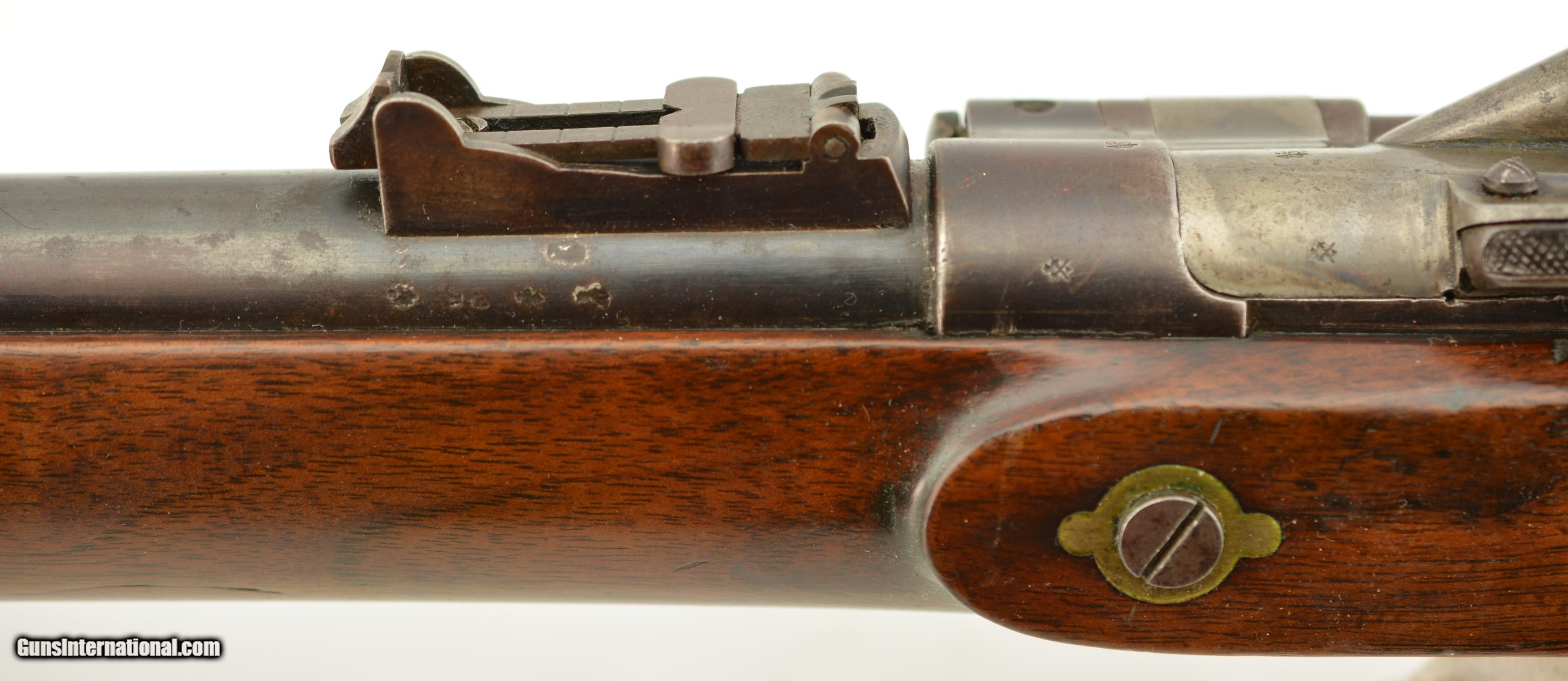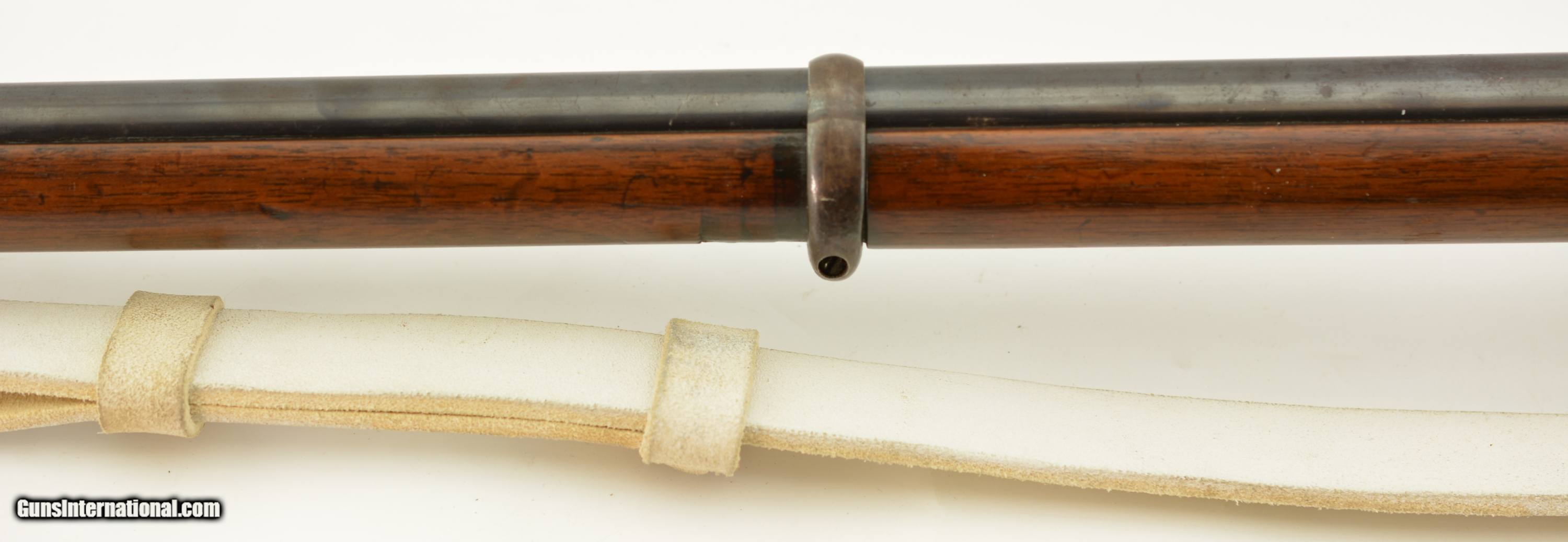 Description: Serial #2985M, .577 Snider, 36 1/2" barrel with a fine, bright bore that has a small amount of freckling within the grooves. This commercially-produced rifle has retained about 50-60% of the original blue along the barrel, with a streaked plum-brown patina on the balance, and gray metal near the muzzle. Visible original color case-hardening remains on the breechblock, with mild freckling and fading on the balance, and a mottled gray-brown patina is present on the hammer and "P. WEBLEY & SON / BIRMINGHAM"-marked lockplate. The brass trigger guard and nosecap have a mild yellow-ochre patina throughout, while the walnut stock has various small handling marks and blemishes in the added military oil finish. No ramrod is present, but a buff leather sling is fitted, and the firing pin protector is still attached via a short chain. The action lock-up is tight and fully functional. This is a very nice Snider Volunteer Rifle in fine condition overall. Antique SOLD Antique: Yes Manufacturer: Webley Model: Snider Serial Number: 2985M Caliber Info: .577 Gauge Info: .577 |