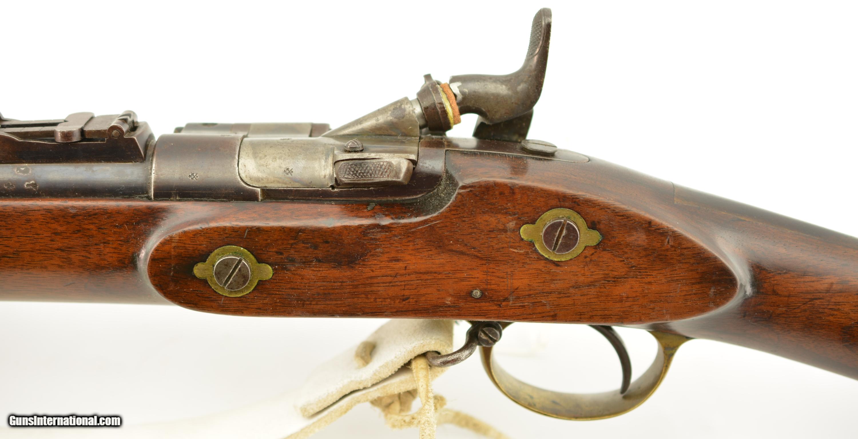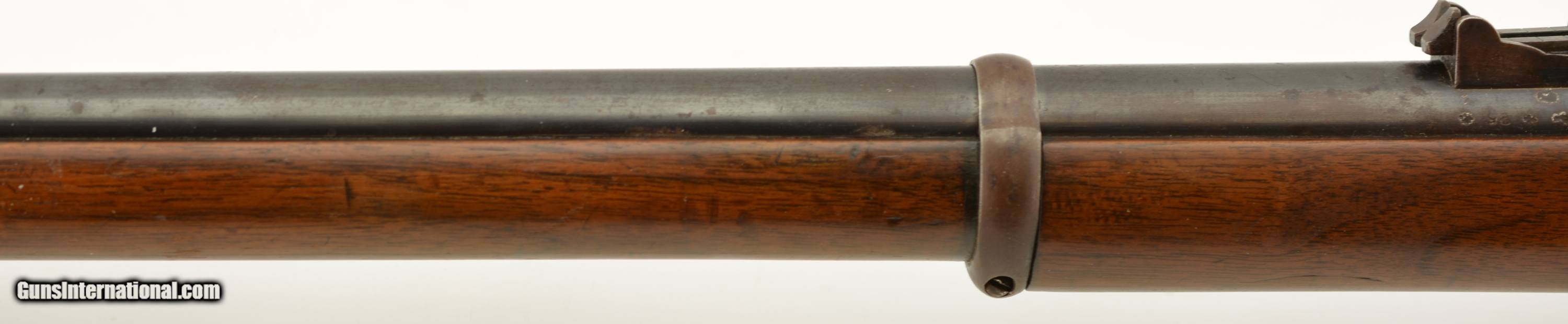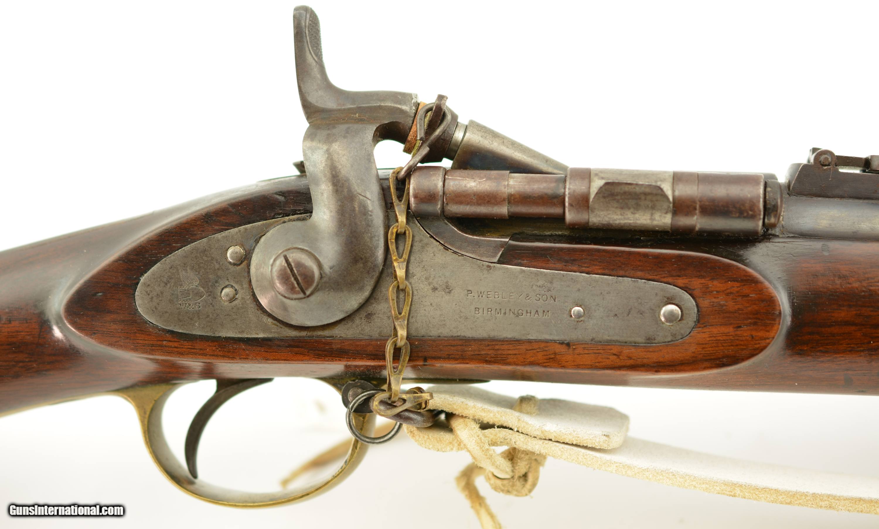 Description: Serial #2985M, .577 Snider, 36 1/2" barrel with a fine, bright bore that has a small amount of freckling within the grooves. This commercially-produced rifle has retained about 50-60% of the original blue along the barrel, with a streaked plum-brown patina on the balance, and gray metal near the muzzle. Visible original color case-hardening remains on the breechblock, with mild freckling and fading on the balance, and a mottled gray-brown patina is present on the hammer and "P. WEBLEY & SON / BIRMINGHAM"-marked lockplate. The brass trigger guard and nosecap have a mild yellow-ochre patina throughout, while the walnut stock has various small handling marks and blemishes in the added military oil finish. No ramrod is present, but a buff leather sling is fitted, and the firing pin protector is still attached via a short chain. The action lock-up is tight and fully functional. This is a very nice Snider Volunteer Rifle in fine condition overall. Antique SOLD Antique: Yes Manufacturer: Webley Model: Snider Serial Number: 2985M Caliber Info: .577 Gauge Info: .577 |