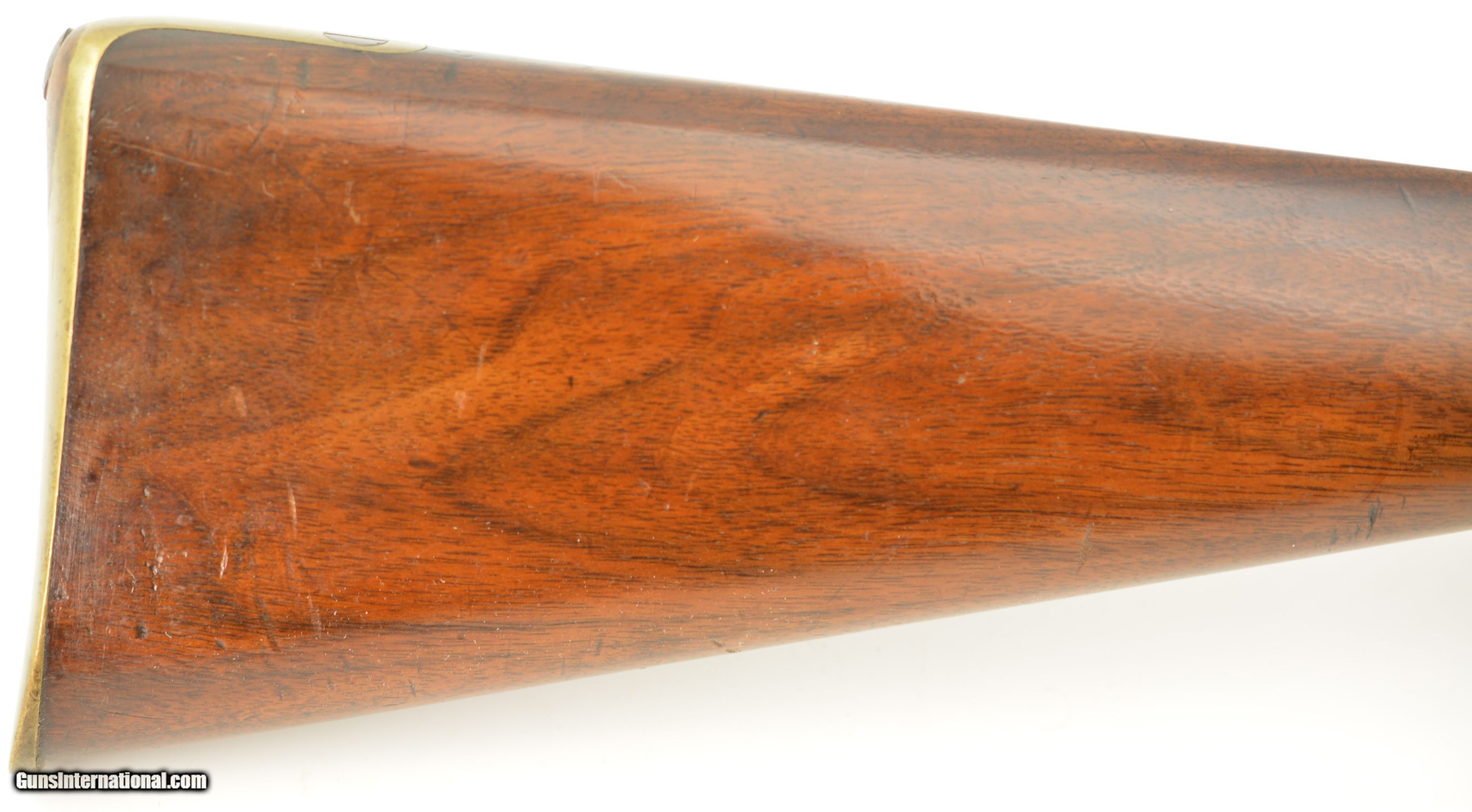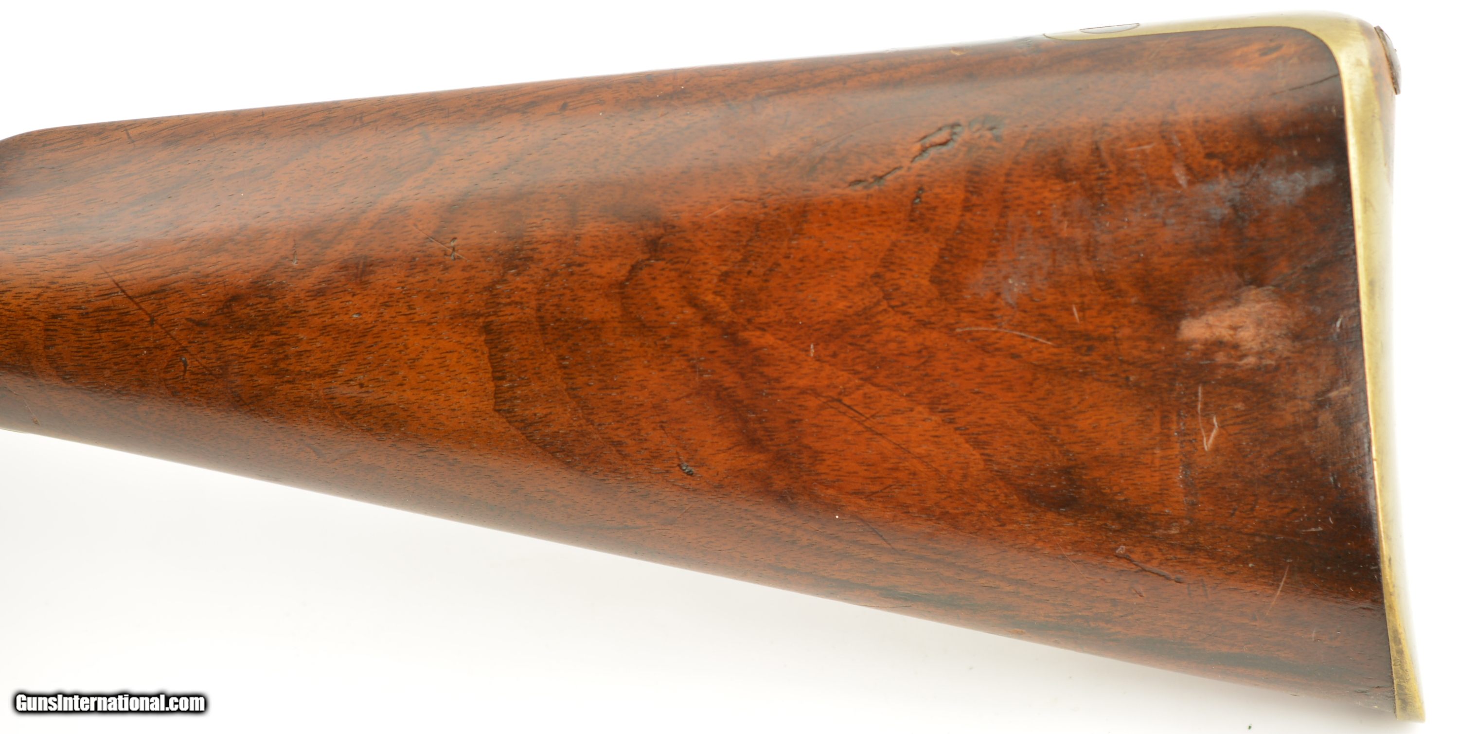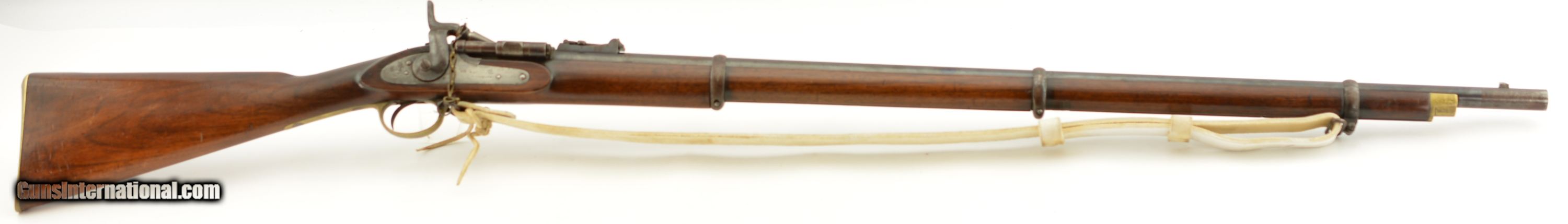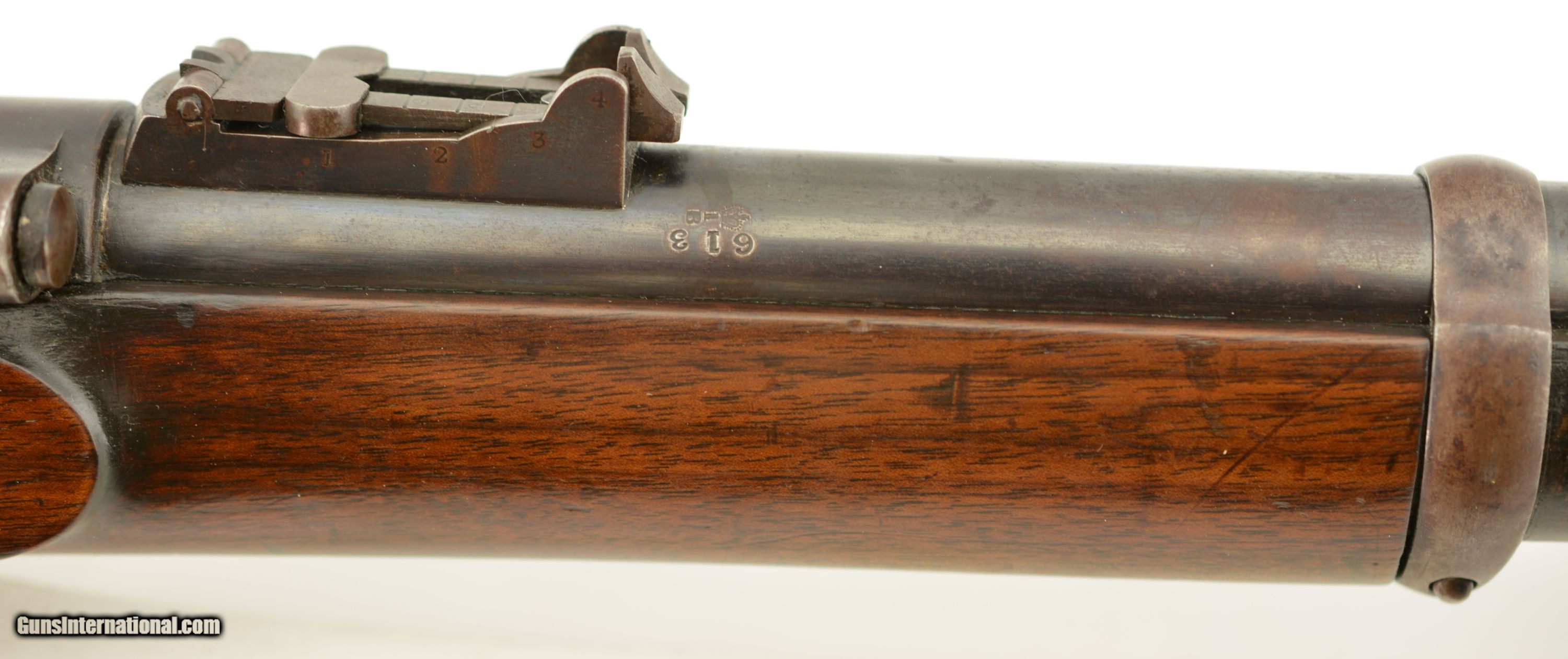 Description: Serial #2985M, .577 Snider, 36 1/2" barrel with a fine, bright bore that has a small amount of freckling within the grooves. This commercially-produced rifle has retained about 50-60% of the original blue along the barrel, with a streaked plum-brown patina on the balance, and gray metal near the muzzle. Visible original color case-hardening remains on the breechblock, with mild freckling and fading on the balance, and a mottled gray-brown patina is present on the hammer and "P. WEBLEY & SON / BIRMINGHAM"-marked lockplate. The brass trigger guard and nosecap have a mild yellow-ochre patina throughout, while the walnut stock has various small handling marks and blemishes in the added military oil finish. No ramrod is present, but a buff leather sling is fitted, and the firing pin protector is still attached via a short chain. The action lock-up is tight and fully functional. This is a very nice Snider Volunteer Rifle in fine condition overall. Antique SOLD Antique: Yes Manufacturer: Webley Model: Snider Serial Number: 2985M Caliber Info: .577 Gauge Info: .577 |