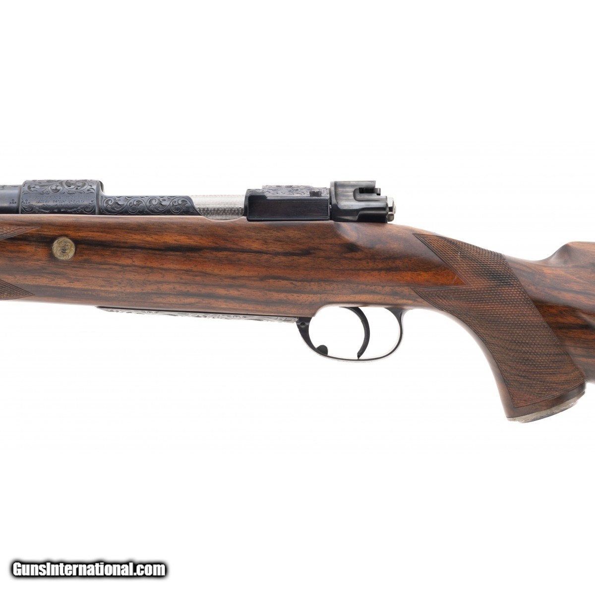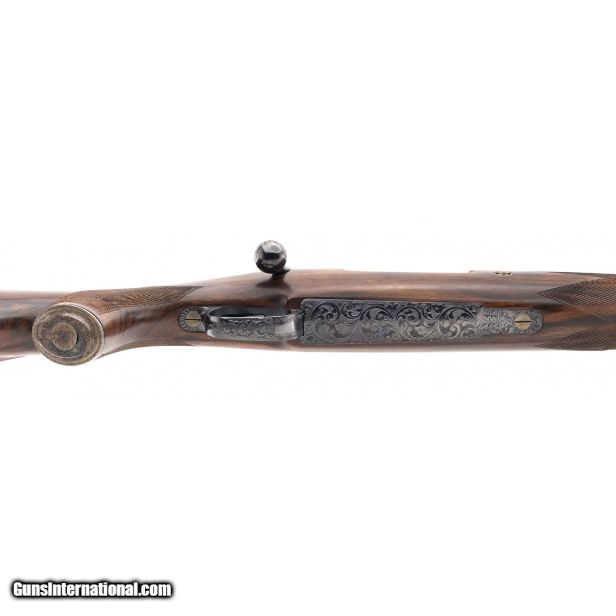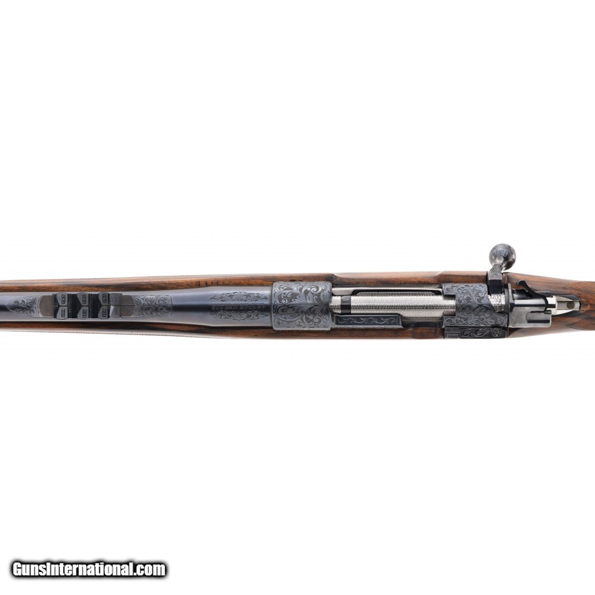 SN: 43395. Premium grade Mauser action dangerous game rifle made by one of the top names in English gunmaking. The action, floorplate, grip cap and barrel breech are engraved with a broad scroll. The 25"" barrel has a 4-leaf express sight and is marked ""Regulated for 500 GRN Bullet"". The stock is of figured straight grain walnut with a horn forend tip and rubber recoil pad. A beautiful piece in excellent condition.