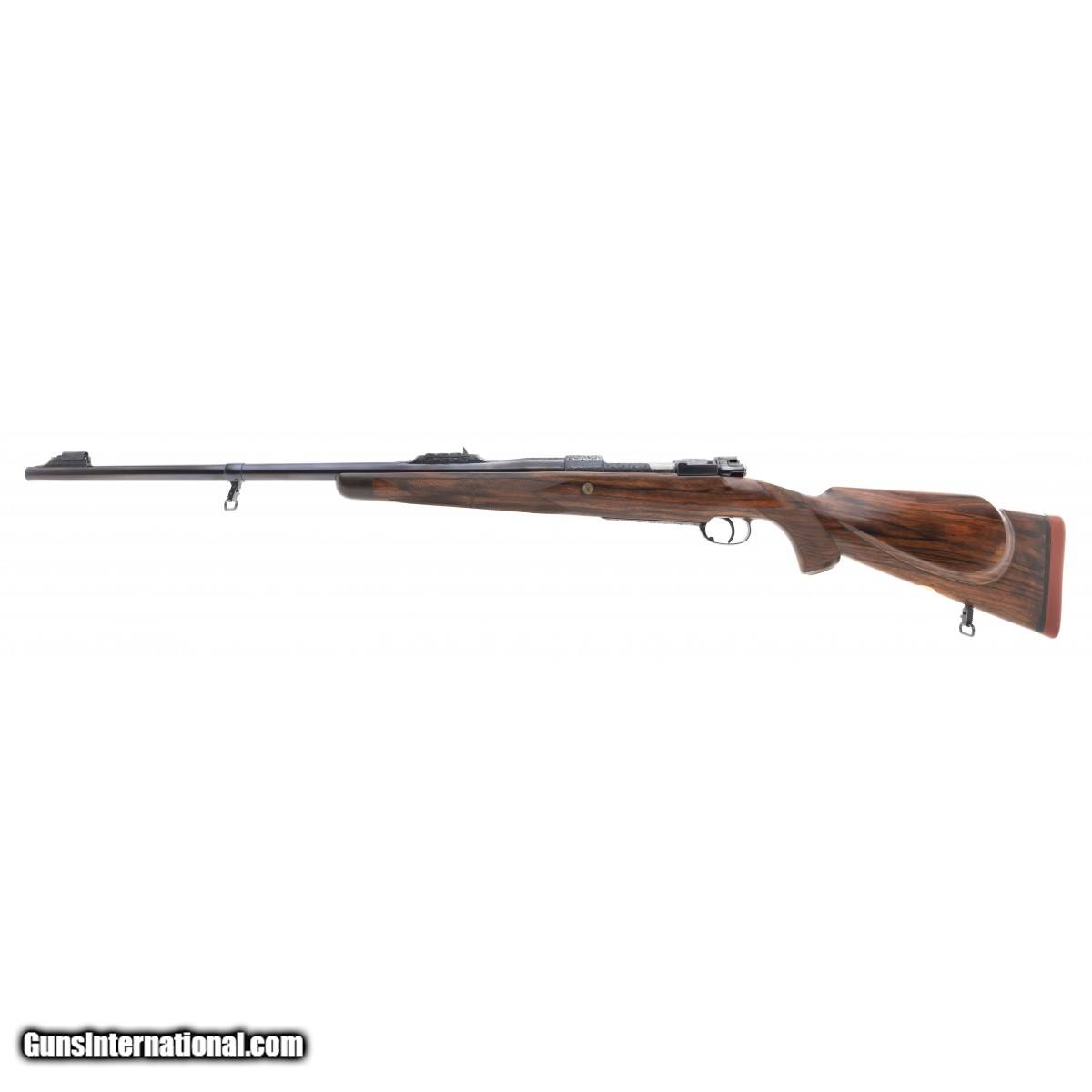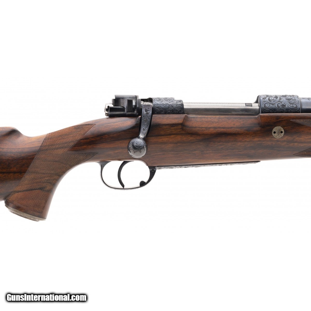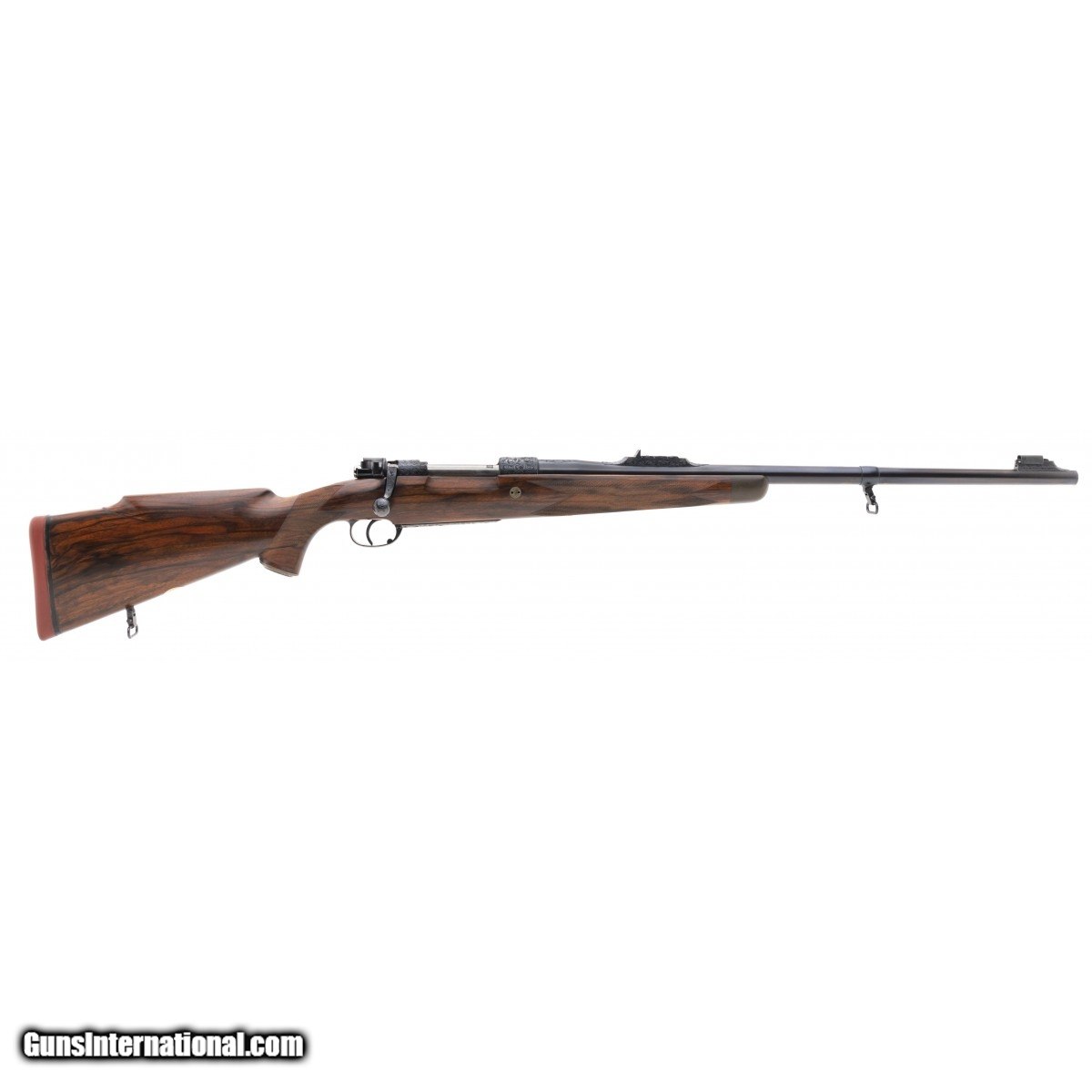 Description: " SN: 43395. Premium grade Mauser action dangerous game rifle made by one of the top names in English gunmaking. The action, floorplate, grip cap and barrel breech are engraved with a broad scroll. The 25"" barrel has a 4-leaf express sight and is marked ""Regulated for 500 GRN Bullet"". The stock is of figured straight grain walnut with a horn forend tip and rubber recoil pad. A beautiful piece in excellent condition. SOLD |