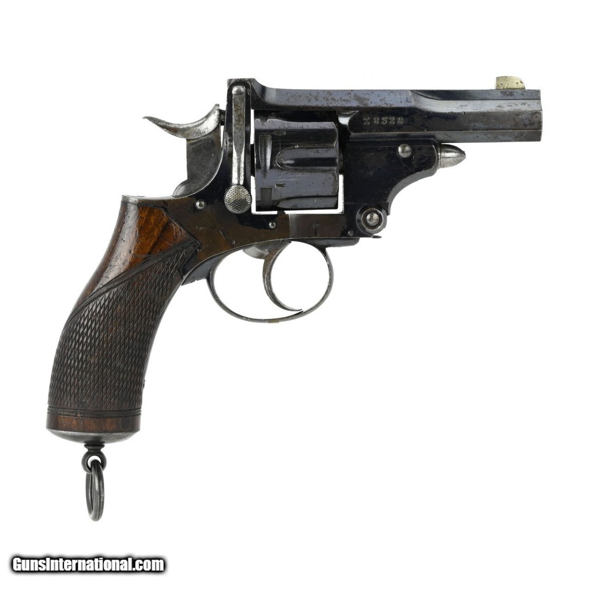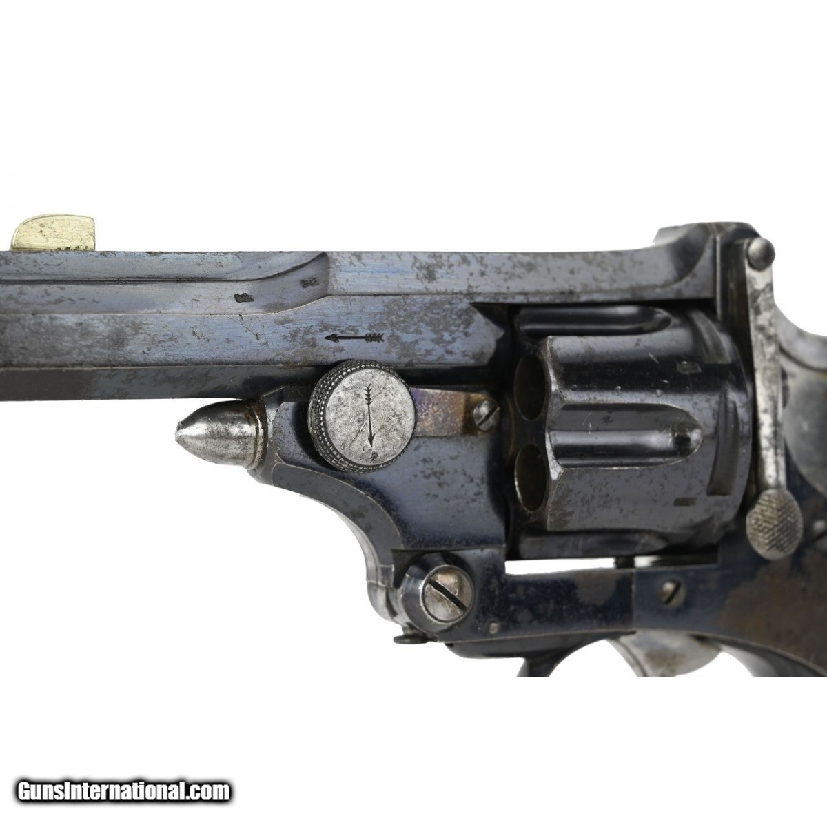 Description: " Westley Richards “Pryse” Revolver .450 Caliber. 3” barrel length 6 shot revolver. British proofs (crown BP and crown BV). Cylinder flutes are also proofed. Top of barrel rib is marked “Westley Richards & Co.” This is a Pryse revolver and is probably made by Webley for Westley Richards. Revolver has approximately 90% blue, the rest has flaked to a brown patina as is often seen on British revolvers. Bore is very good plus with strong rifling and is mostly bright. Action works perfectly. Grips are excellent, checkering is also excellent. A very appealing revolver. SOLD |