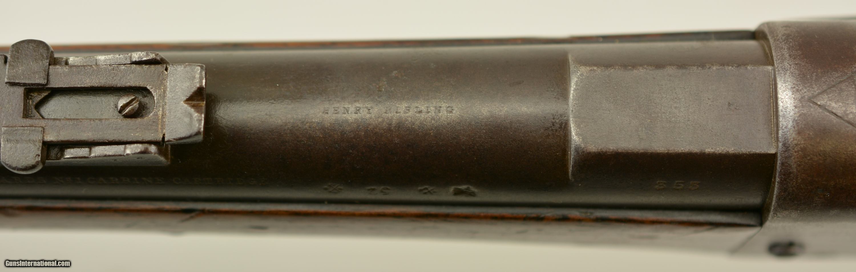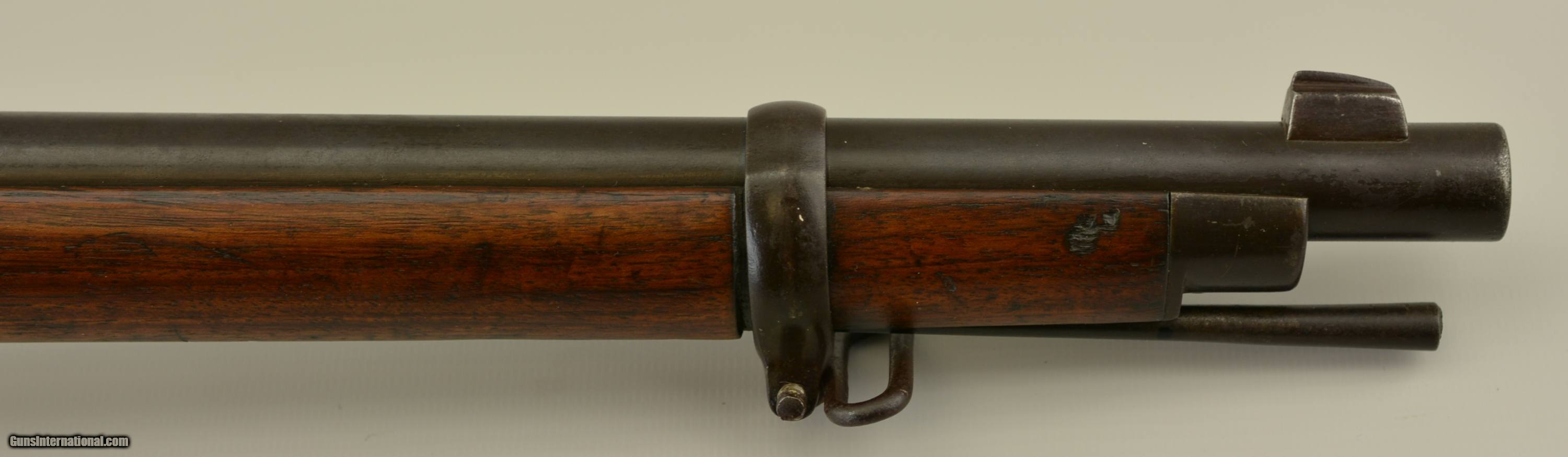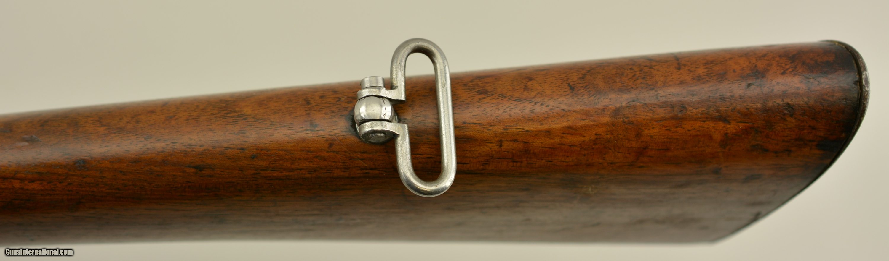 Description: Serial #353, .500/.450 No. 1 Carbine, 25" barrel with a good plus, lightly freckled bore. This carbine uses Westley Richard's side-lever opening action, and has an overall dark brown patina with areas of fading and pitting at the muzzle, and on the trigger guard bow. There is further mild pitting along the tops of the receiver, barrel, and breech-block. The walnut forend and buttstock have been lightly sanded with small handling marks and surface blemishes in the otherwise fine added oil finish. The stock compartment trapdoor is no longer present. The action is fully functional, and a non-original metal ramrod is included. This is a rather scarce and seldom seen military type carbine by one of Britain's most respected maker of sporting guns and rifles. The carbine rates good-near very good overall, and would make a nice addition to a collection. Antique SOLD Antique: Yes Manufacturer: Westley Richards Model: Carbine Caliber Info: .500/450 Gauge Info: .500/450 |