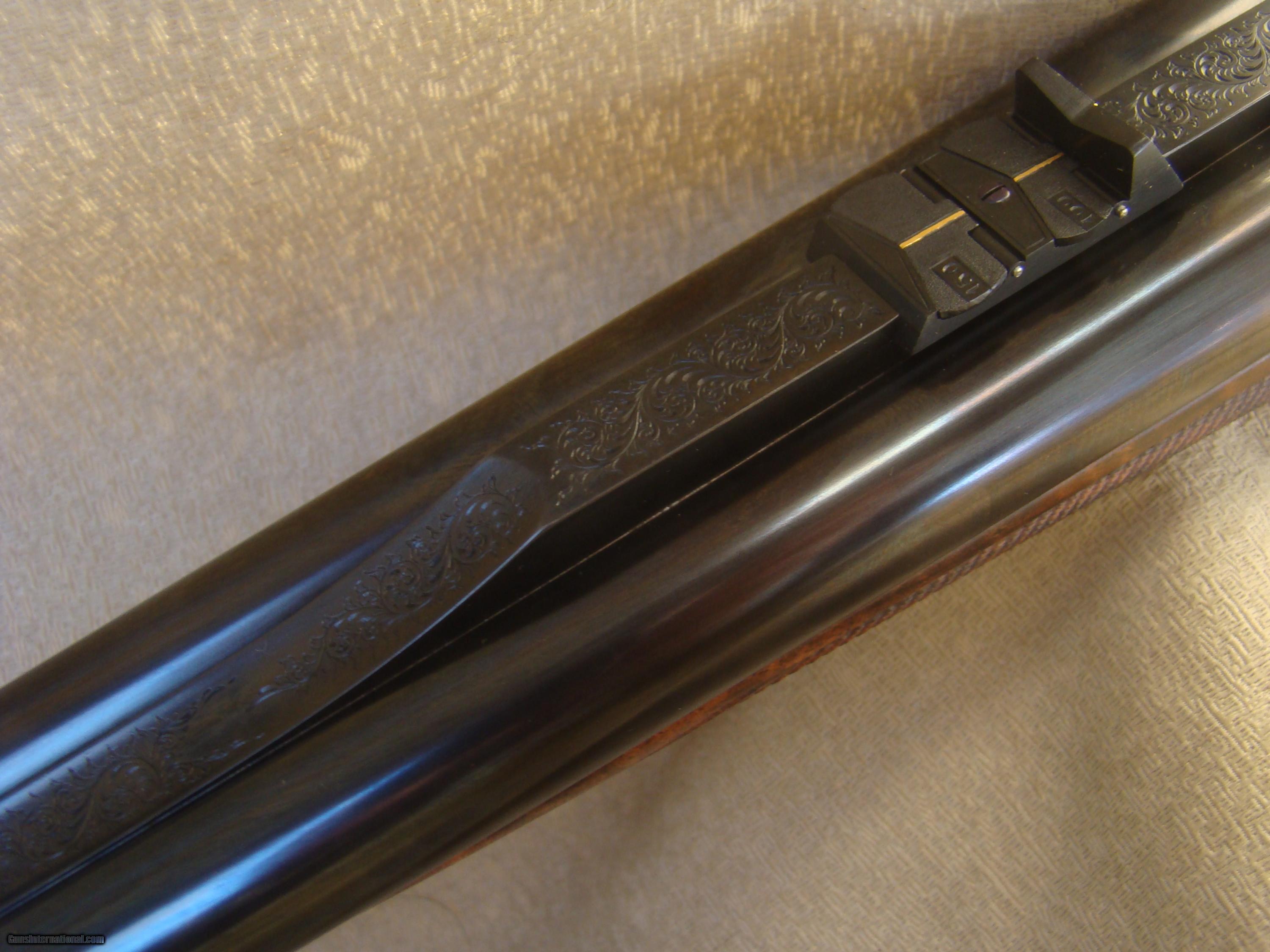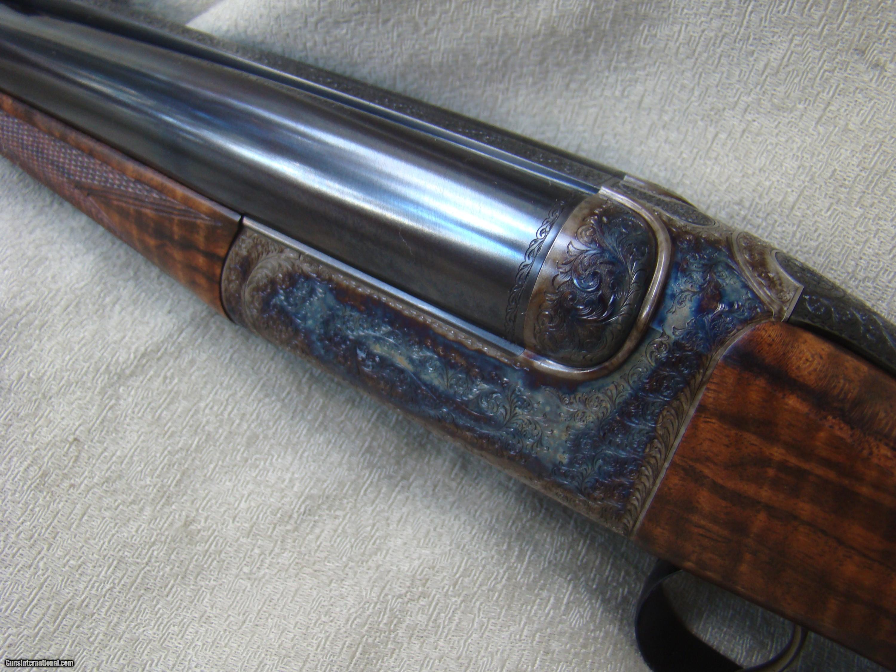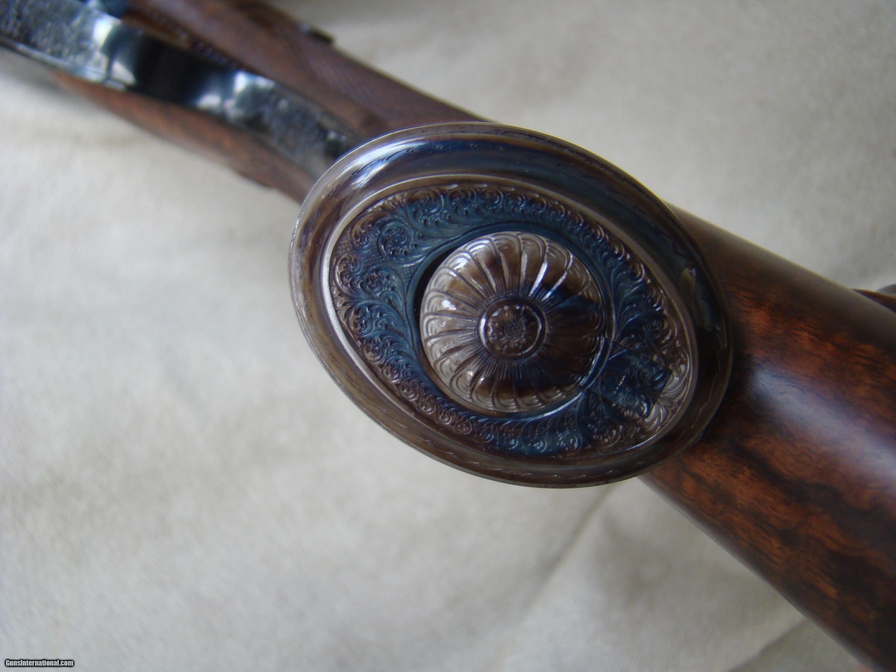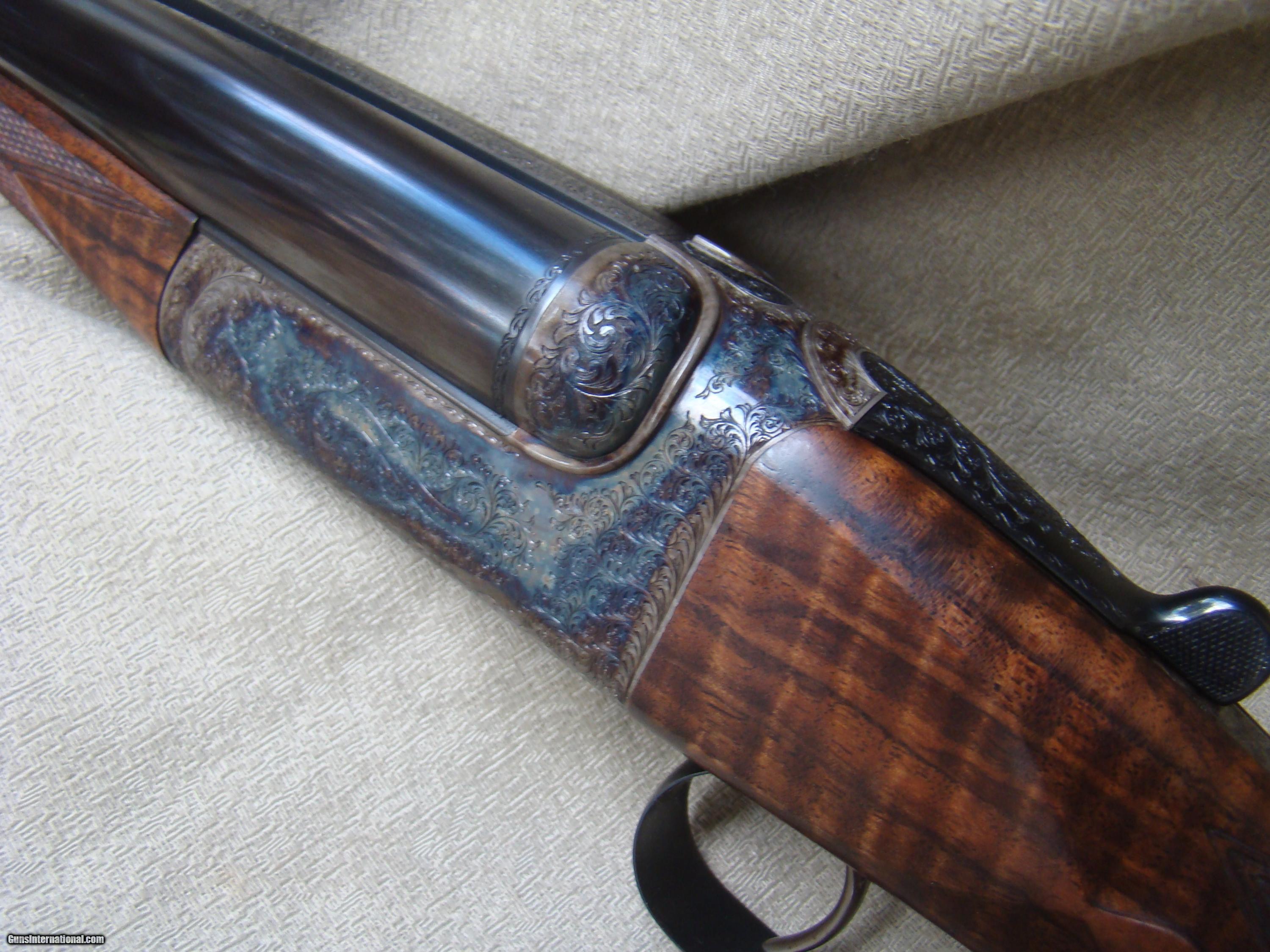 Description: Just landed! Brand new Westley Richards .450/.400, 3" , best quality detachable droplock double rifle. 24" barrels regulated for the 400 grain bullet feature a quarter rib, one standing and two folding express sights, flipover hood front sight. The toplever utilizes the traditional Westley doll's head sliding bolt. Hinged floorplate allows access to the renowned Westley detachable locks. Completely engraved in classic English scroll with "Westley Richards" in a banner and finished with a fabulous rainbow of case color hardening. This rifle is fitted with double triggers and automatic ejectors. Buffalo horn tip splinter forend. Pistol grip stock with trap grip cap features a pre-war style kidney cheekpiece. The stock of rock hard, highly figured walnut with rich black figure and extraordinary contrasting fiddleback, measures 14-3/4" over a solid red Silvers pad. This rifle was ordered to replicate the fast handling characteristics of a bygone era and weighs just 9 lbs, 7 oz. Extraordinary fit and finish and attention to detail, Westley Richards is among the best of the best. Complete with factory supplied airline travel case and original shipping crate. Today's replacement over $100K + 2 year wait. SOLD |