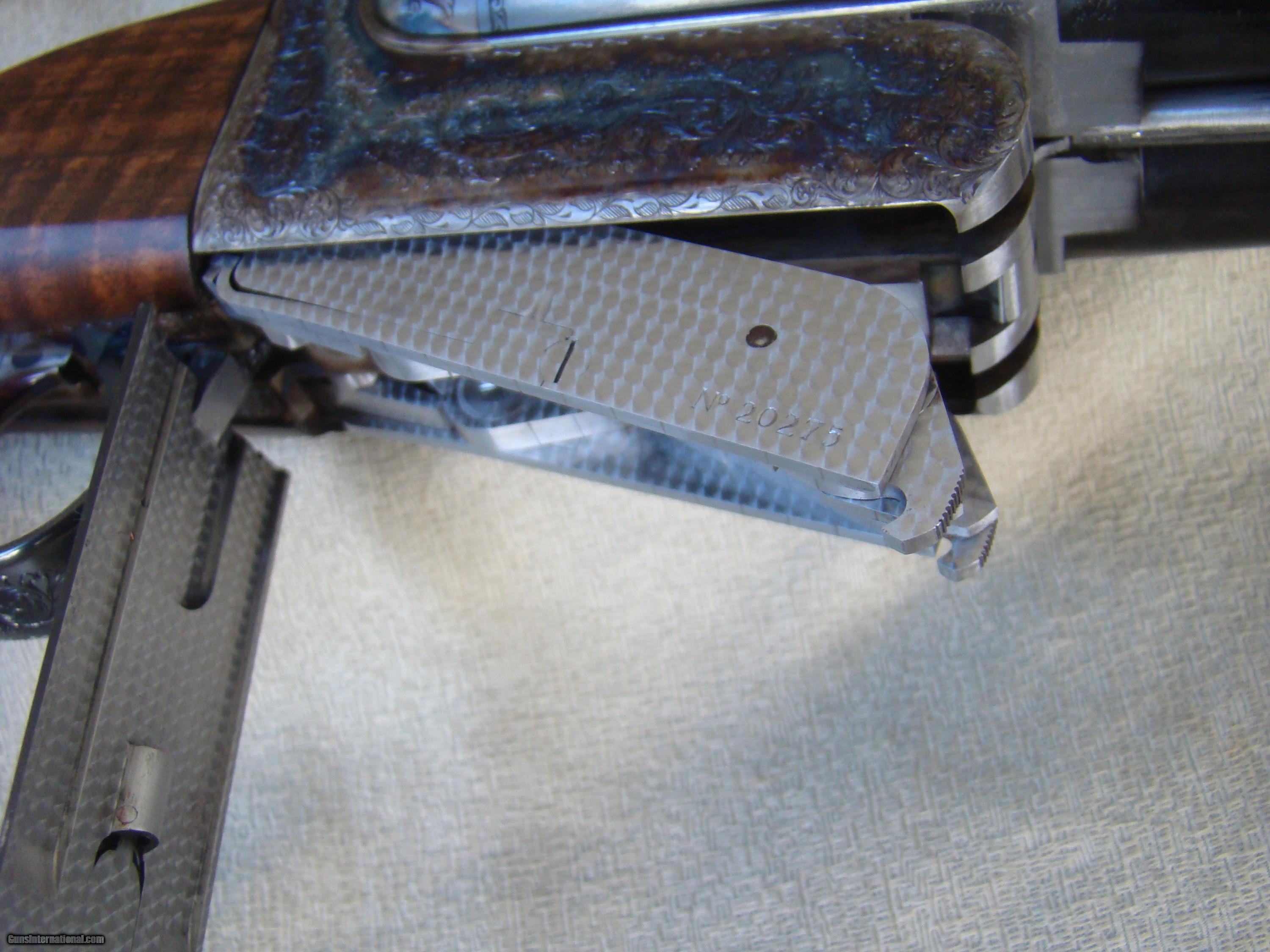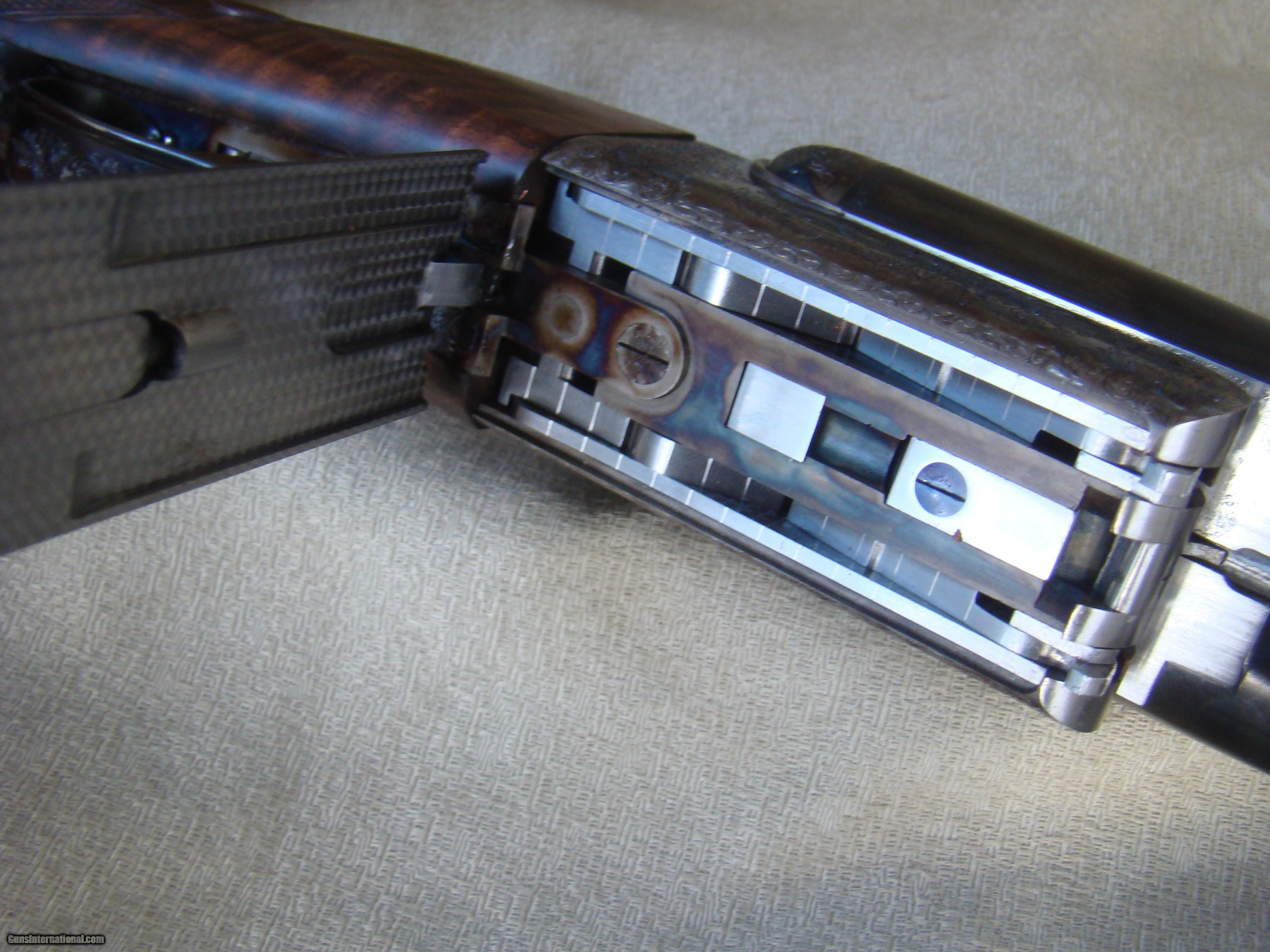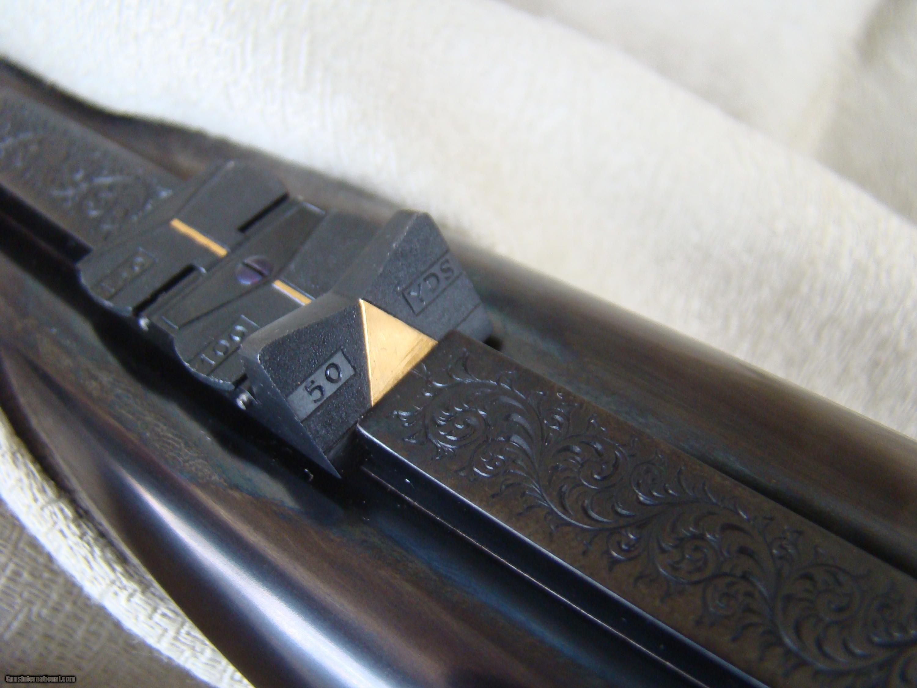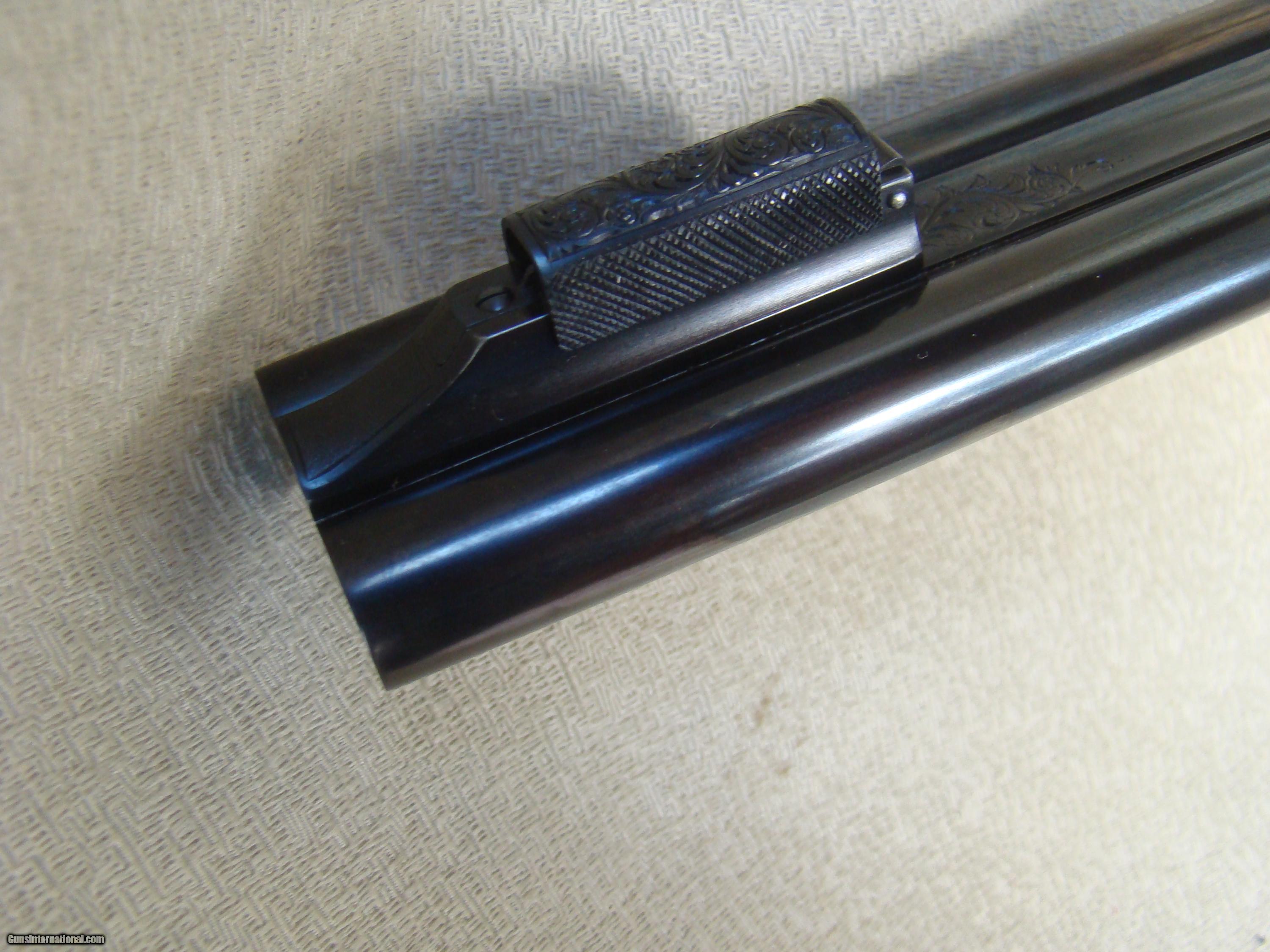 Description: Just landed! Brand new Westley Richards .450/.400, 3" , best quality detachable droplock double rifle. 24" barrels regulated for the 400 grain bullet feature a quarter rib, one standing and two folding express sights, flipover hood front sight. The toplever utilizes the traditional Westley doll's head sliding bolt. Hinged floorplate allows access to the renowned Westley detachable locks. Completely engraved in classic English scroll with "Westley Richards" in a banner and finished with a fabulous rainbow of case color hardening. This rifle is fitted with double triggers and automatic ejectors. Buffalo horn tip splinter forend. Pistol grip stock with trap grip cap features a pre-war style kidney cheekpiece. The stock of rock hard, highly figured walnut with rich black figure and extraordinary contrasting fiddleback, measures 14-3/4" over a solid red Silvers pad. This rifle was ordered to replicate the fast handling characteristics of a bygone era and weighs just 9 lbs, 7 oz. Extraordinary fit and finish and attention to detail, Westley Richards is among the best of the best. Complete with factory supplied airline travel case and original shipping crate. Today's replacement over $100K + 2 year wait. SOLD |