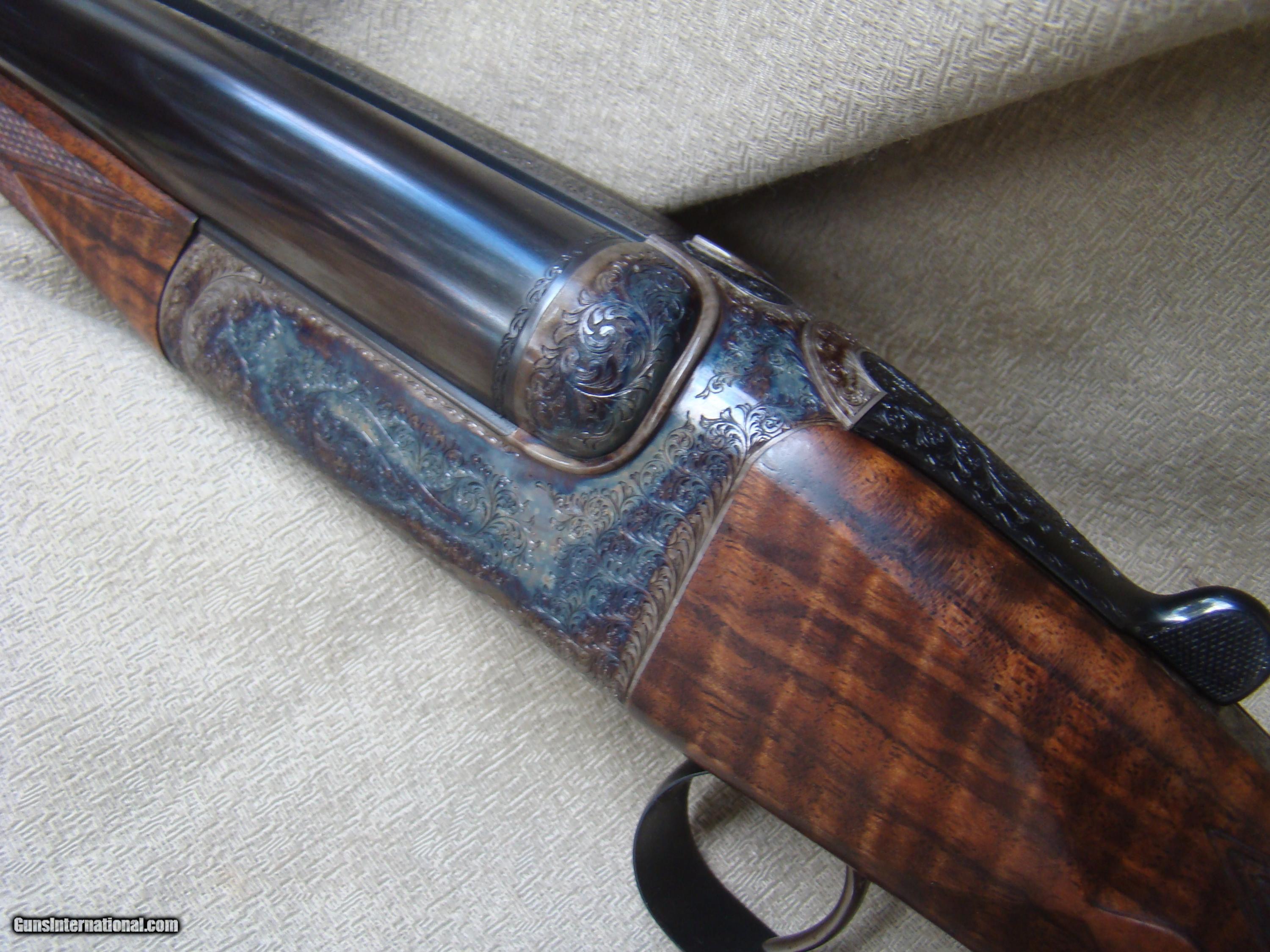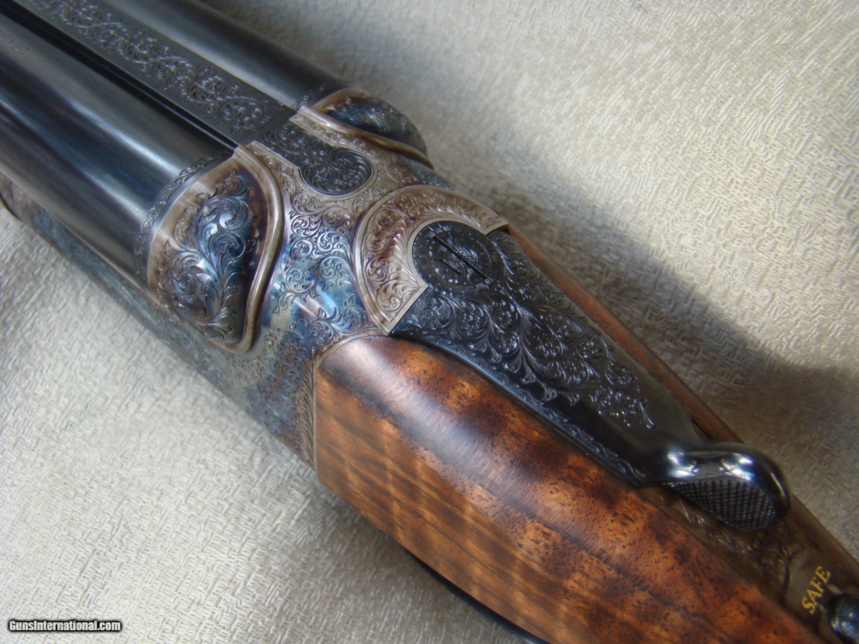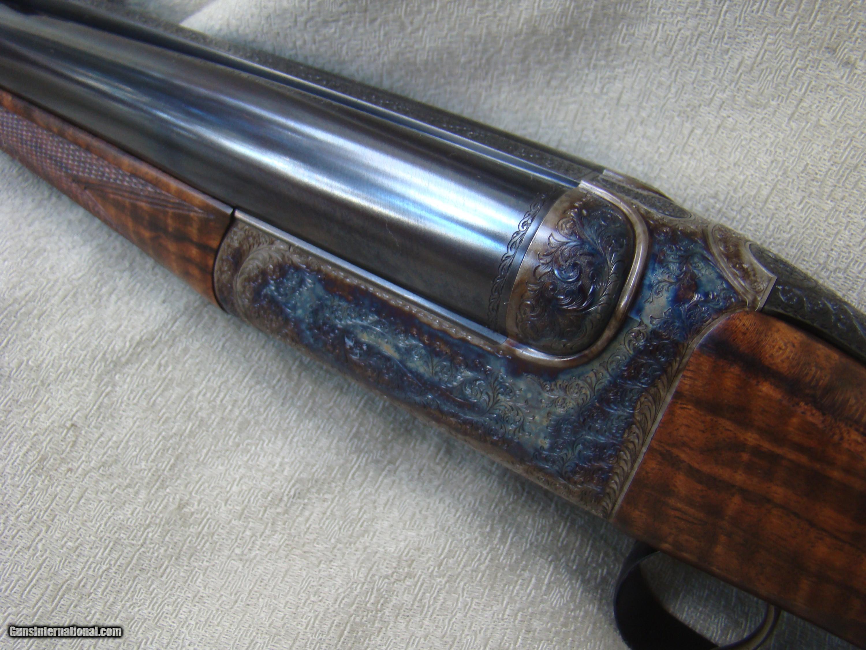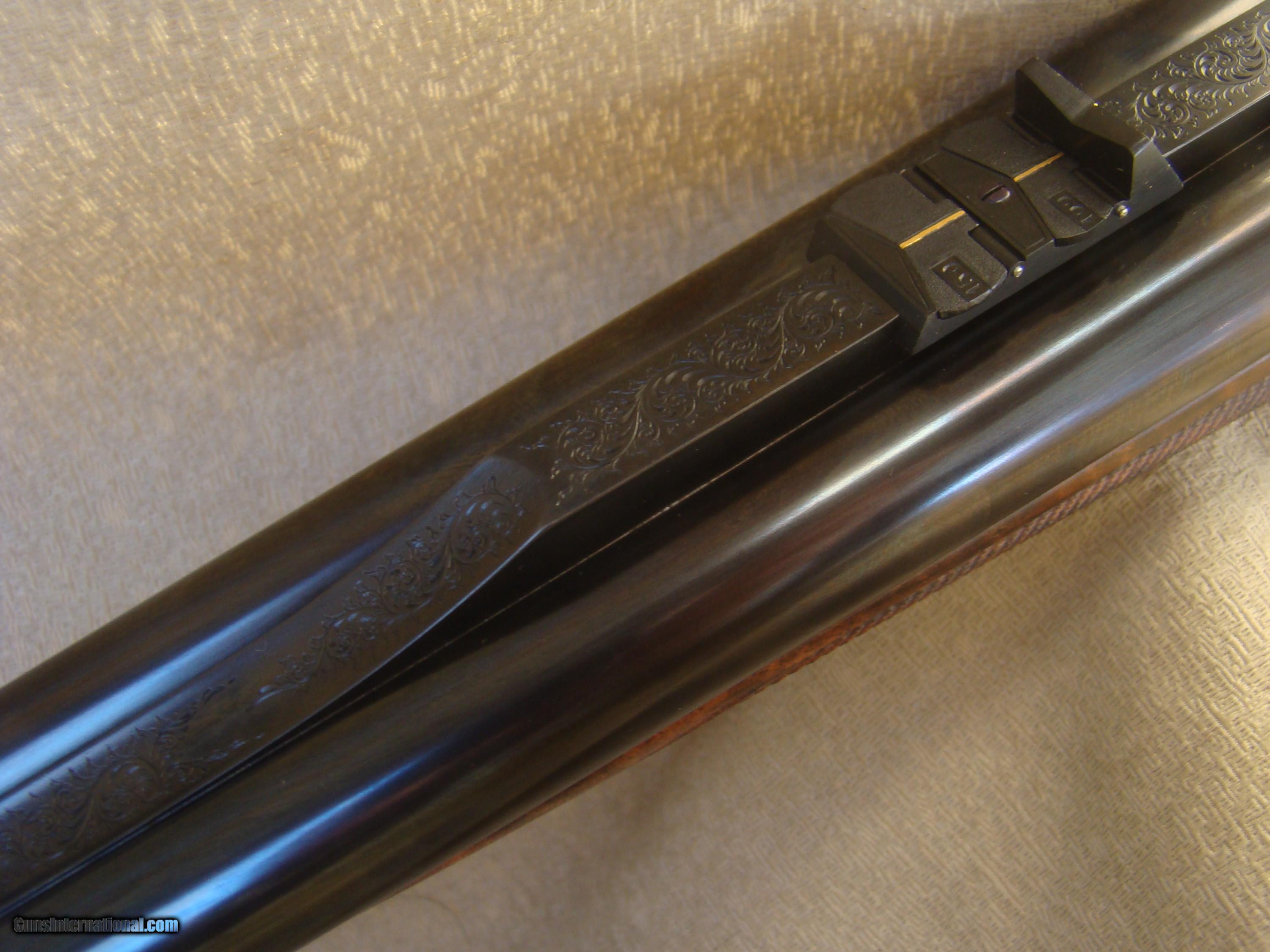 Description: Brand new Westley Richards .450/.400, 3" , best quality detachable droplock double rifle. 24" barrels regulated for the 400 grain bullet feature a quarter rib, one standing and two folding express sights, flipover hood front sight. The toplever utilizes the traditional Westley doll's head sliding bolt. Hinged floorplate allows access to the renowned Westley detachable locks. Completely engraved in classic English scroll with "Westley Richards" in a banner and finished with a fabulous rainbow of case color hardening. This rifle is fitted with double triggers and automatic ejectors. Buffalo horn tip splinter forend. Pistol grip stock with trap grip cap features a pre-war style kidney cheekpiece. The stock of rock hard, highly figured walnut with rich black figure and extraordinary contrasting fiddleback, measures 14-3/4" over a solid red Silvers pad. This rifle was ordered to replicate the fast handling characteristics of a bygone era and weighs just 9 lbs, 7 oz. Extraordinary fit and finish and attention to detail, Westley Richards is among the best of the best. Complete with factory supplied airline travel case and original shipping crate. Today's replacement over $100K + 2 year wait. SOLD |