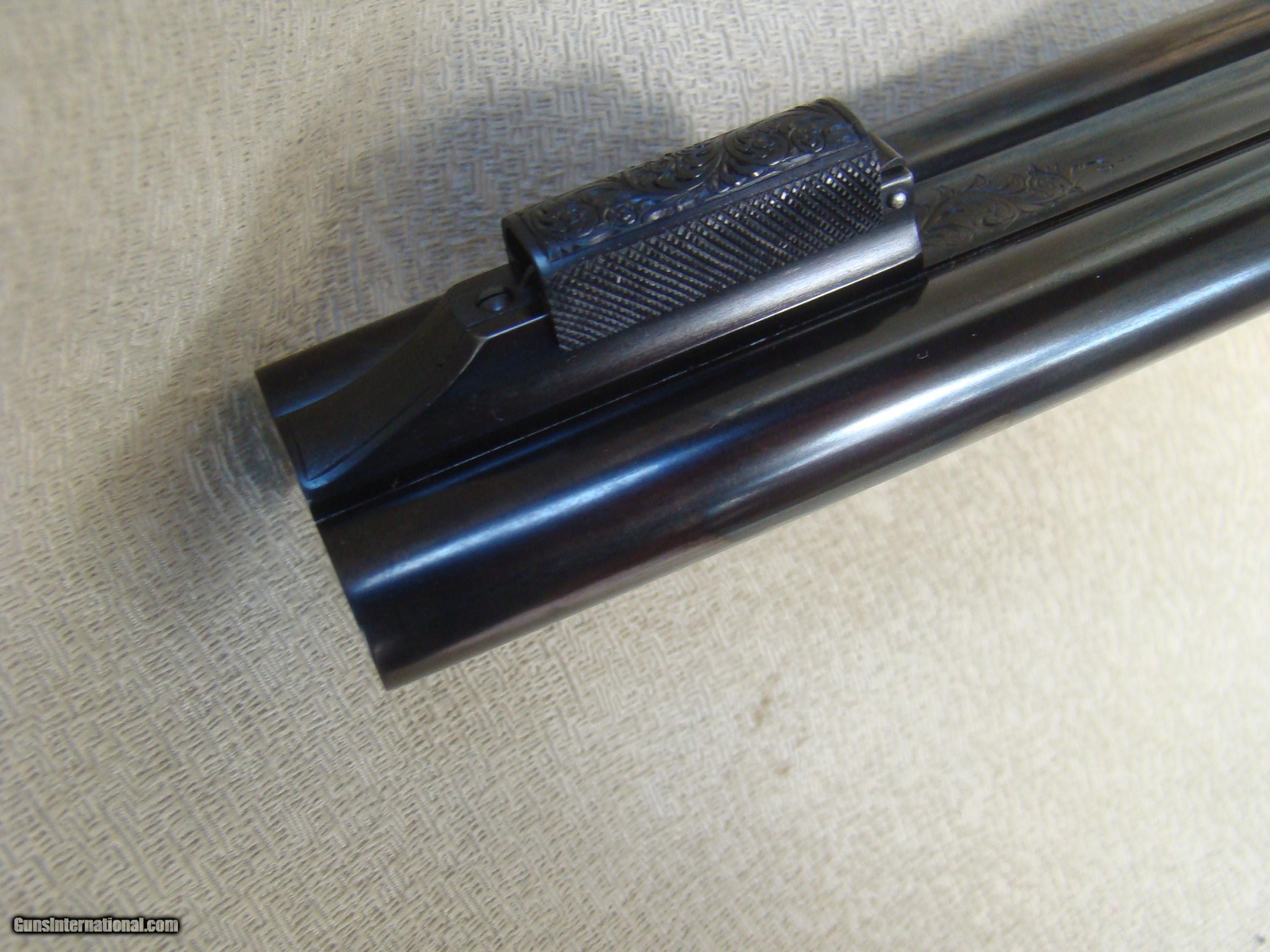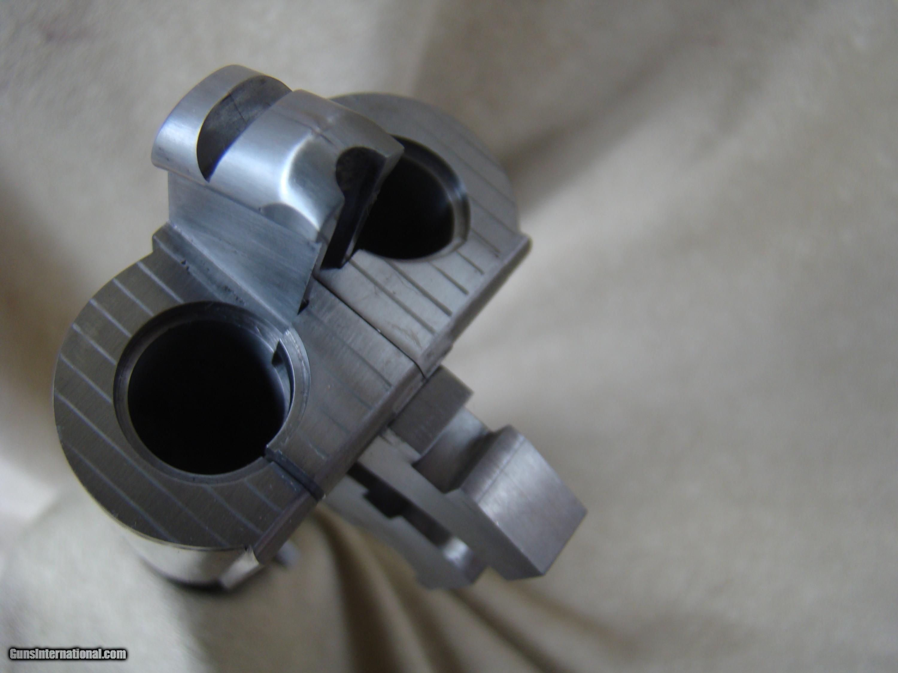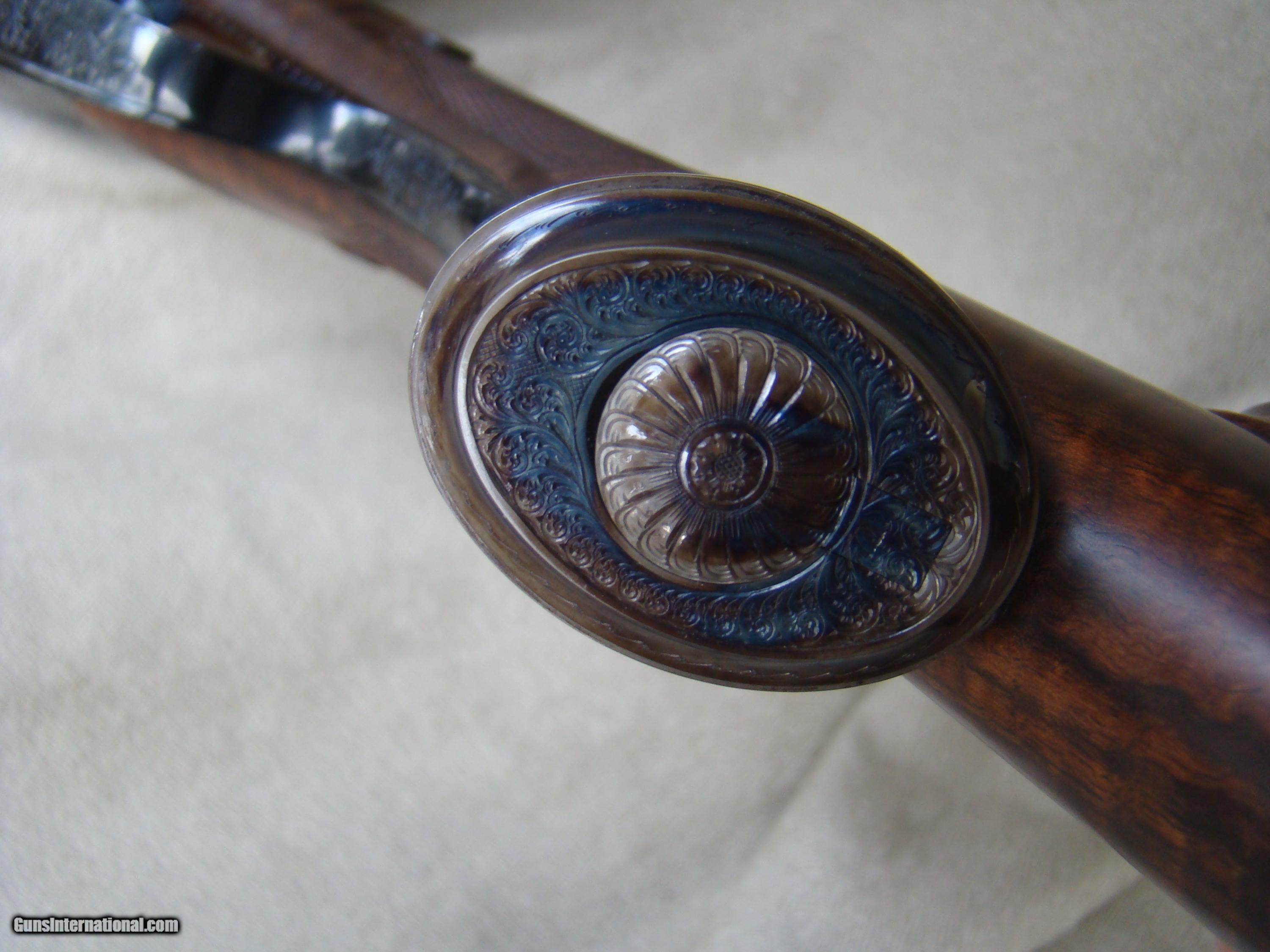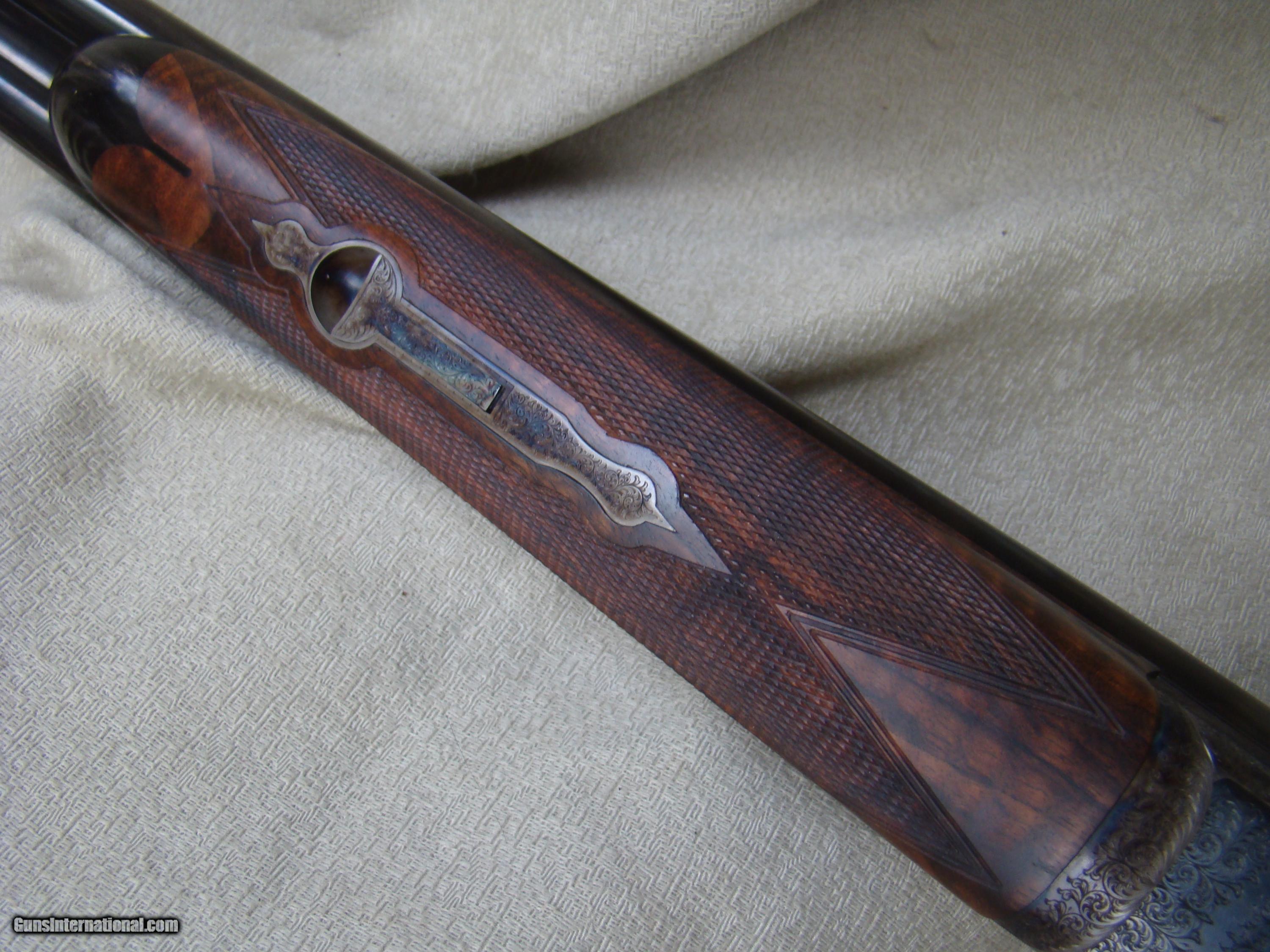 Description: Brand new Westley Richards .450/.400, 3" , best quality detachable droplock double rifle. 24" barrels regulated for the 400 grain bullet feature a quarter rib, one standing and two folding express sights, flipover hood front sight. The toplever utilizes the traditional Westley doll's head sliding bolt. Hinged floorplate allows access to the renowned Westley detachable locks. Completely engraved in classic English scroll with "Westley Richards" in a banner and finished with a fabulous rainbow of case color hardening. This rifle is fitted with double triggers and automatic ejectors. Buffalo horn tip splinter forend. Pistol grip stock with trap grip cap features a pre-war style kidney cheekpiece. The stock of rock hard, highly figured walnut with rich black figure and extraordinary contrasting fiddleback, measures 14-3/4" over a solid red Silvers pad. This rifle was ordered to replicate the fast handling characteristics of a bygone era and weighs just 9 lbs, 7 oz. Extraordinary fit and finish and attention to detail, Westley Richards is among the best of the best. Complete with factory supplied airline travel case and original shipping crate. Today's replacement over $100K + 2 year wait. SOLD |