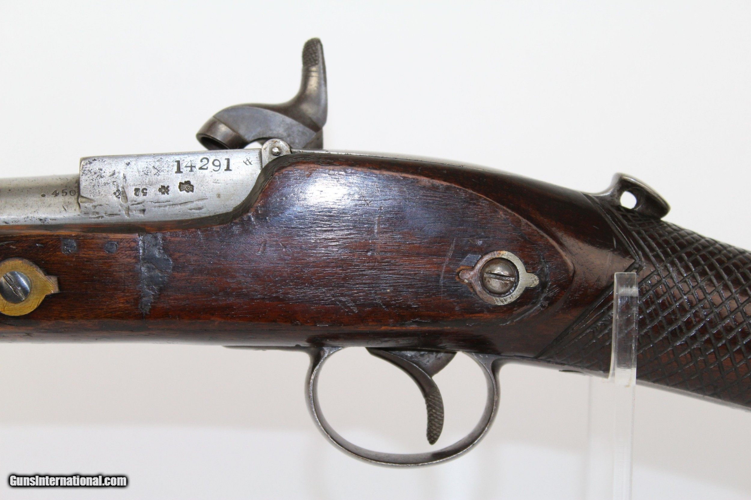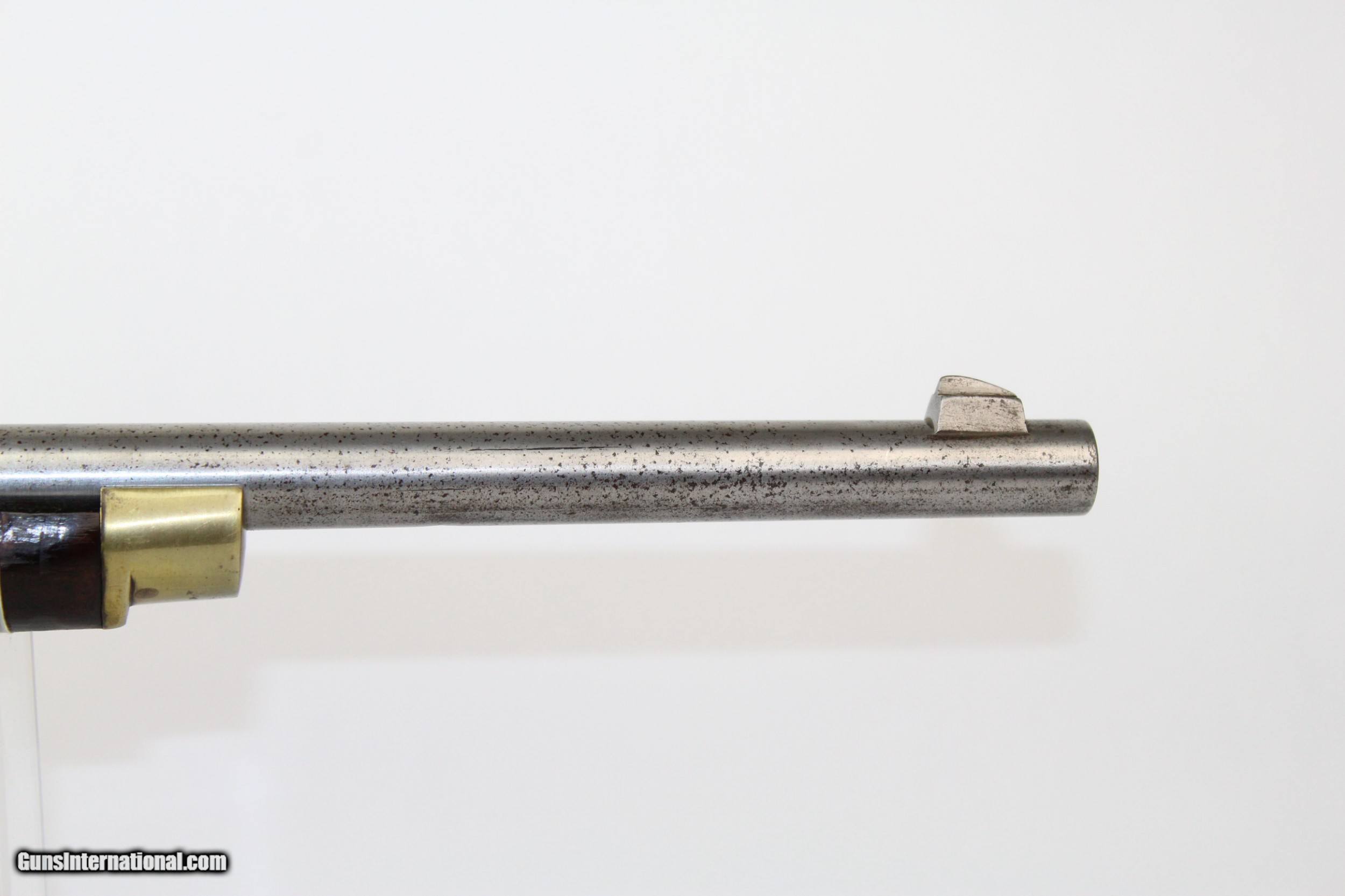 Description: SCARCE Antique Westley Richards MONKEY TAIL Carbine Favorite of Boers during War, Dated 1874 Here we present an antique Westley Richards Monkey Tail Breech-Loading Percussion Carbine, made in 1874 in Birmingham, England. Westley Richards & Co. still make world class firearms to this day, over 200 years. William Westley Richards established his prestigious company in 1812, only yet 22 years of age, at 82 High Street in Birmingham. He established his high-end London shop in 1815 at 170 New Bond Street. William’s son, Westley Richards, joined his father in business at the age of 26 and continued to prosper the business with his own ideas and patents. It was he who was responsible for the design of the aforementioned Monkey Tail Carbine in 1858. The source of its being called a “Monkey Tail” is the shape of the small knob on the loading lever. The carbine was an early pioneer in the use of polygonal rifling and utilized an ingenious caplock, breech-loading system. The rifling is what the “Whitworth’s Patent” marking on the barrel refers to, though it seems at this time the marking was a friendly attribution to Joseph Whitworth and not required by law. Both Richards and Whitworth appear to have worked simultaneously, if not somewhat together, on improving rifling technology. The rifling in these guns is octagonal, whereas Whitworth’s was hexagonal. Nevertheless, Richards seems to have wanted to give Whitworth the credit. As for the breech-loading system, the top lever hinges up, allowing the shooter to load the cartridge, just like some other designs of the time. However, upon closing the lever, the brass piston inside was mobile and when a cartridge was ignited, the gas pressure would push the piston back, locking the breech closed while chamber pressure was high. This scarce Monkey Tail Carbine features a small brass patchbox on the right side of the butt. The wrist is hand checkered. The lock is marked “WESTLEY RICHARDS & CO”. The rear of the lock is dated “1874”. The top of the barrel is marked “WHITWORTH PATENT/G.KYNOCH&CO.LO.” The tang is marked “MANUFACTURED/BY/WESTLEY RICHARDS”. The metal bear British proof marks. The overall condition is very good. The metal surfaces are mostly bright with slight peppering throughout. The markings are clear and legible. The stock is in great shape. The bore is very good with nice rifling. The action on this carbine is strong. The nipple is absent, but the vent still has good threads and should readily accept a new one. Own the original! This is a legitimate antique and not a reproduction. Barrel is 24 inches. Caliber: .45 (.450) Percussion Overall condition as seen in photos. Very Fast. Very Safe. FREE SHIPPING WORLDWIDE. Delivered directly to your door by express mail! Guaranteed AUTHENTIC & Includes CERTIFICATE OF AUTHENTICITY. ancestryguns $2550 #7127 SOLD Antique: Yes |