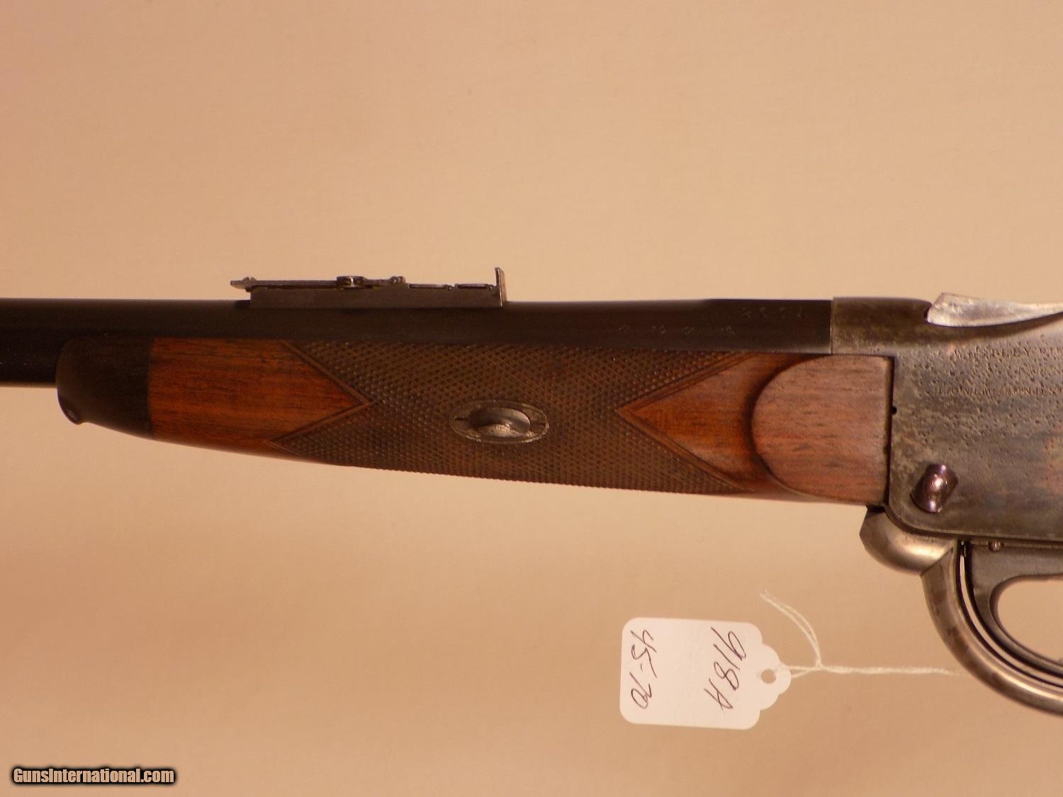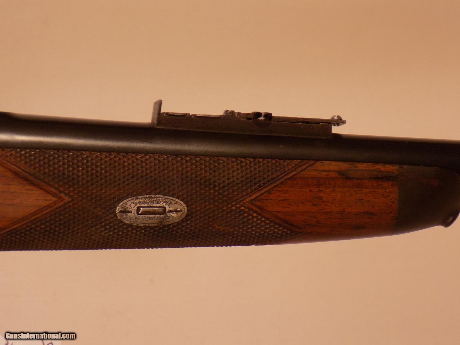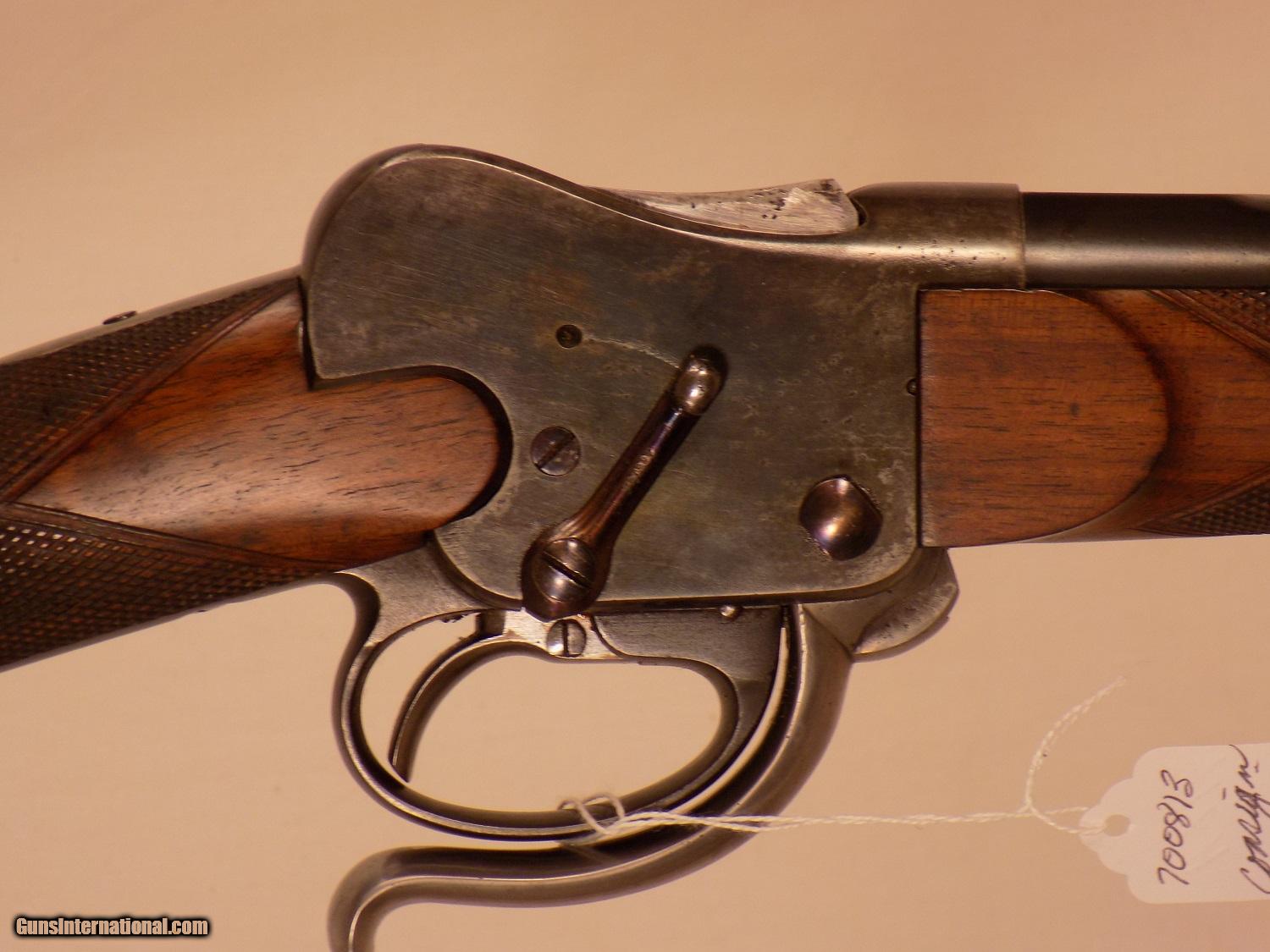 Description: WESLEY RICHARDS COMMERCIAL MARTINI SPORTING RIFLE, 45-70, 26" bbl., SN 26XX, 4 position folding rear express sight, pin head front sight, checkered straight grip stock, checkered forend with horn snobble tip, steel shotgun buttplate, sling swivels, some casehardening on the receiver with some light pitting, 95% bbl. blue, exc. bore. SOLD Antique: Yes |