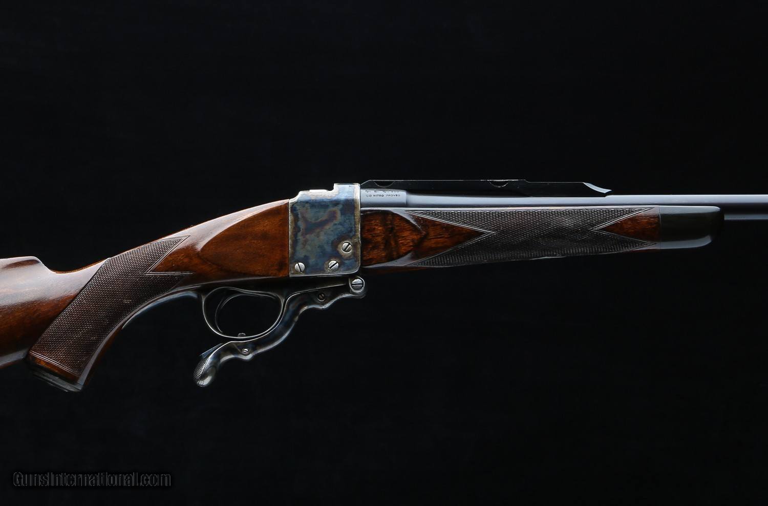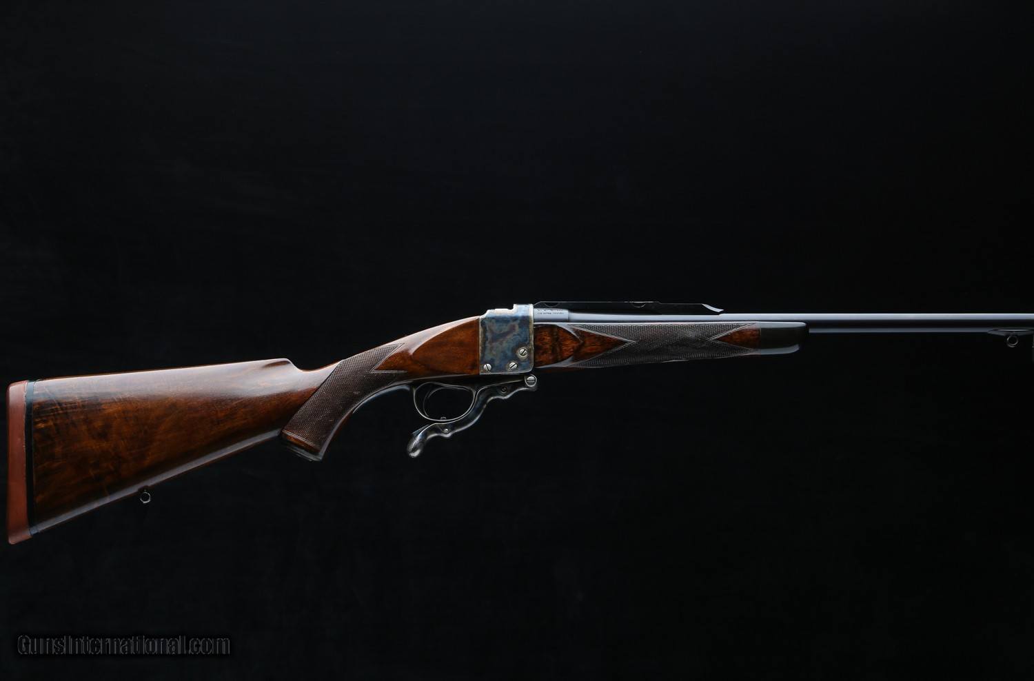Description: Based on an original W.R.&Co. Model 1897 Single Shot originally chambered for .280 Ross and was sleeved to a .22 Hi Power Savage. All the original components are present with a 24" barrel sleeved to .22 Hi Power with Westley's patented foresight and retrofitted with a Ruger No. 1 style quarter rib that accepts Ruger scope rings. Original stock has a RH cheekpiece, full pistol grip cap, and a 14 1/4" LOP over a traditional rubber recoil pad. Hook eye sling swivel on the toe line and one mounted to the bottom of the barrel. A horn grip cap and forend tip. Overall good condition with an excellent bore. Stock was refinshed long ago, presumably when the pad was installed, and the barrel rust blued when the rib was put on. Colors on the action look to be original. Overall a neat rifle on a wonderful action made by Westley's prior to WWI. SOLD |