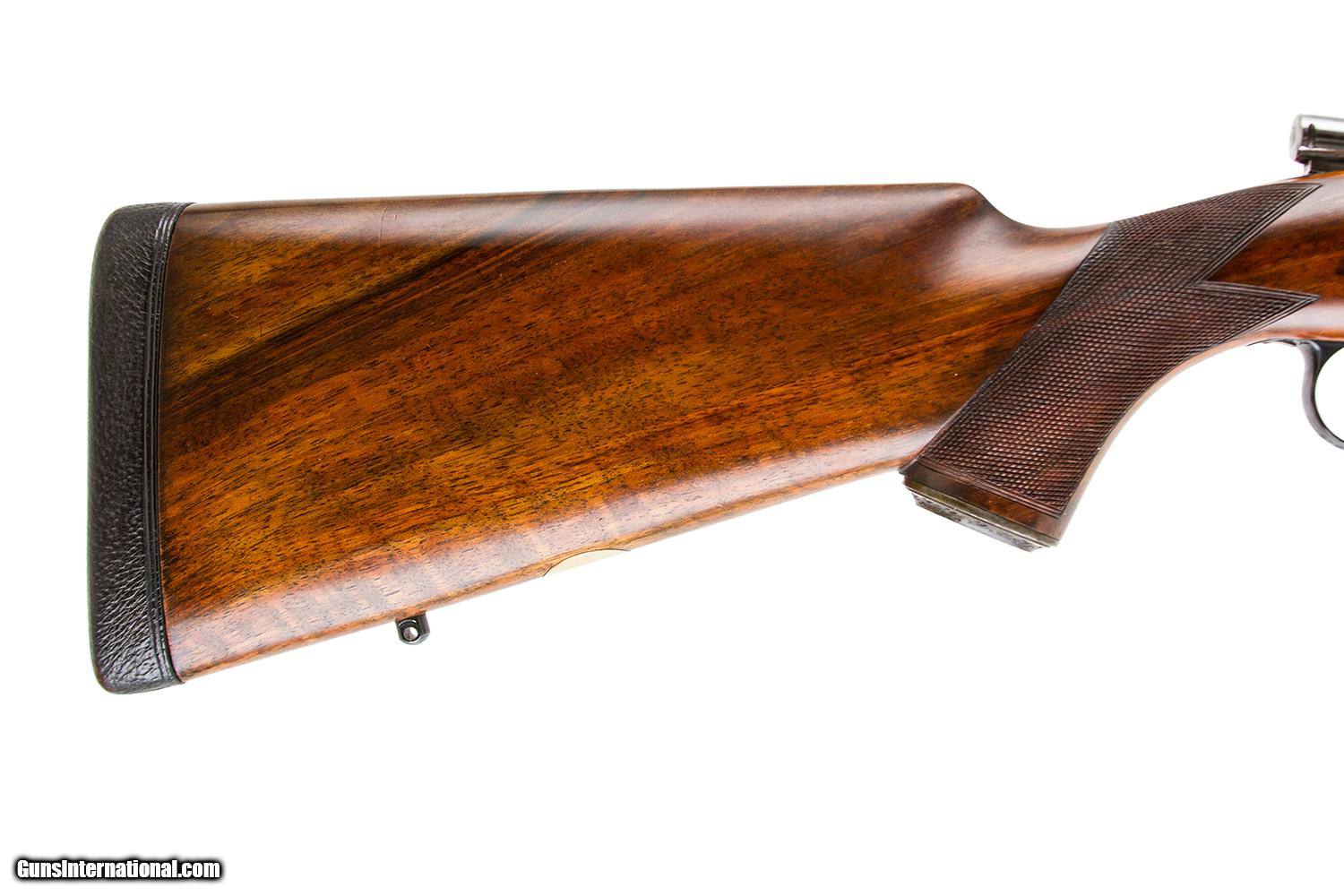 Description: FACTORY ENGRAVED 24" BARREL WITH 3 LEAF 1/4 RIB EXPRESS SIGHT AND WESTLEYS PATENTED FRONT NIGHT SIGHT ENGRAVED STEEL GRIP CAP ENGRAVED 1/4 RIB AND FRONT SIGHT ENGRAVED FLOOR PLATE TRIGGER GUARD RECEIVER BOLT AND JEWELED BOLT NEW CONDITION 8 LBS 15 OZ X 14" LOP SOLD |
