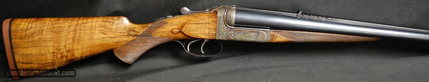 Description: Westley Richards – Double Rifle, .450-400, 3” chambers, 26” barrels, nicely figured metal capped pistol grip stock with a cheek piece, ¾” pad, double triggers, extractor, splinter forend, swivel mounts, leaf sights marked at 100, 200, 300, 400 & 500 yds., boxlock gun with dolls head 3rd fastener, Birmingham proofed, bores remain in outstanding condition, beautiful case coloring, full coverage miniature scroll engraving with maker's name in gold on ribbon on each side of the receiver, marked 60 grs. Cordite, 400 grain bullet, includes 19 rounds of reloaded ammunition, refinished to pristine and near perfect condition, includes oak & leather case, perfect gun for Africa, available for immediate delivery. S&H - $50.00.