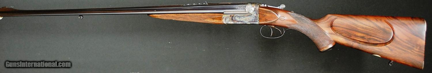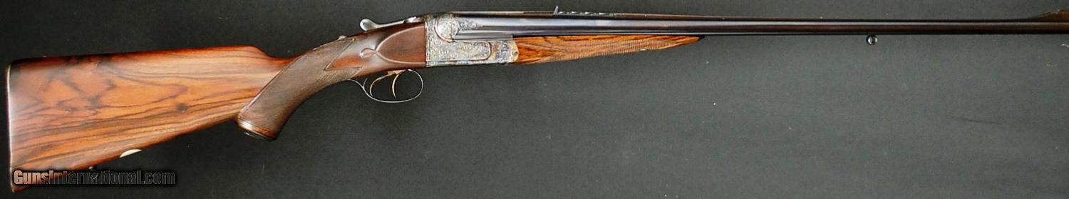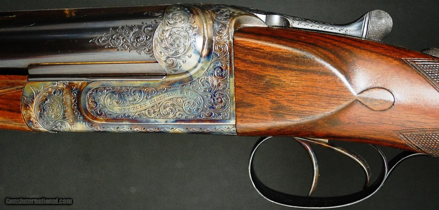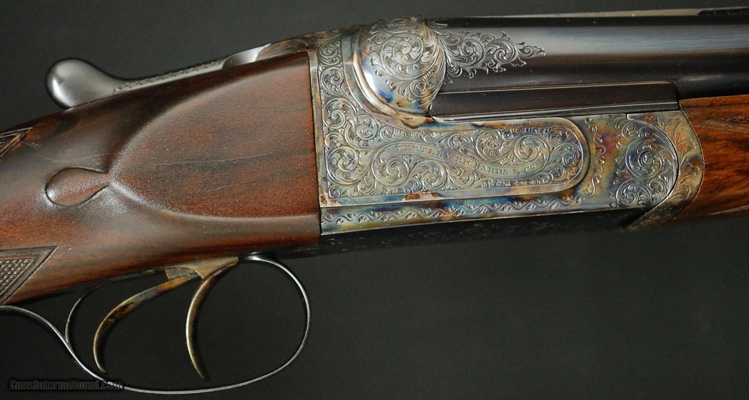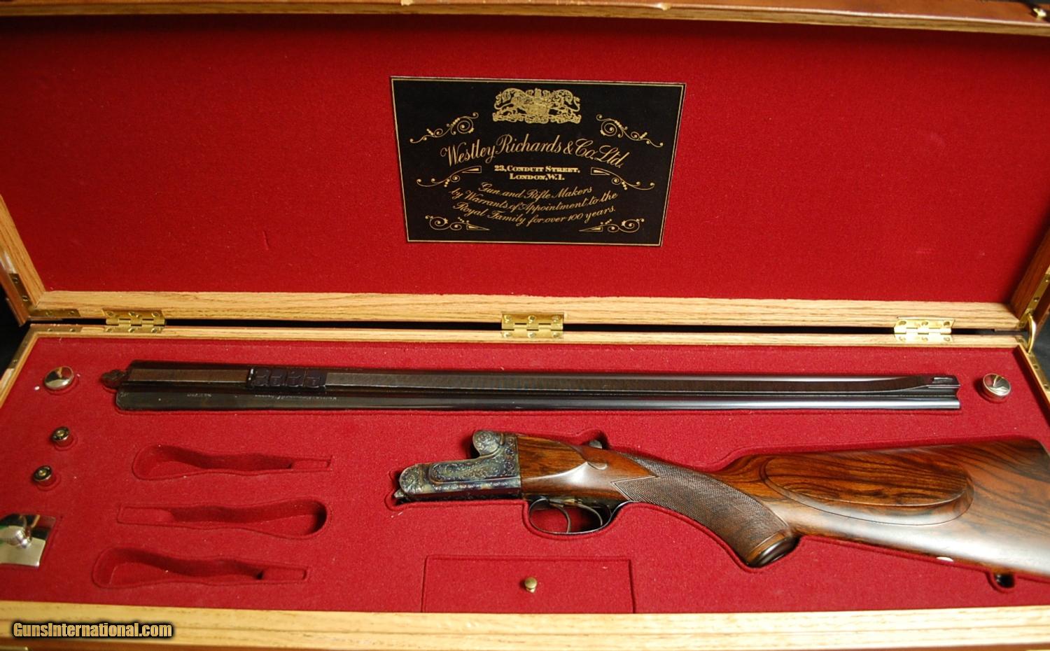 Description: Westley Richards - Double Rifle, 9.3 x 74R, 26” barrels, hinged plate drop lock, double triggers, cheek piece, flip leaf sights, checkered butt with heal and toe plate, ornamental scroll engraving, pistol grip stock with long tang trigger guard and cap, splinter forend, automatic ejectors, auto-safety, sling swivels, in its maker's oak and leather case with accessories, gun is in very good condition condition, the very highest quality workmanship available for immediate delivery.