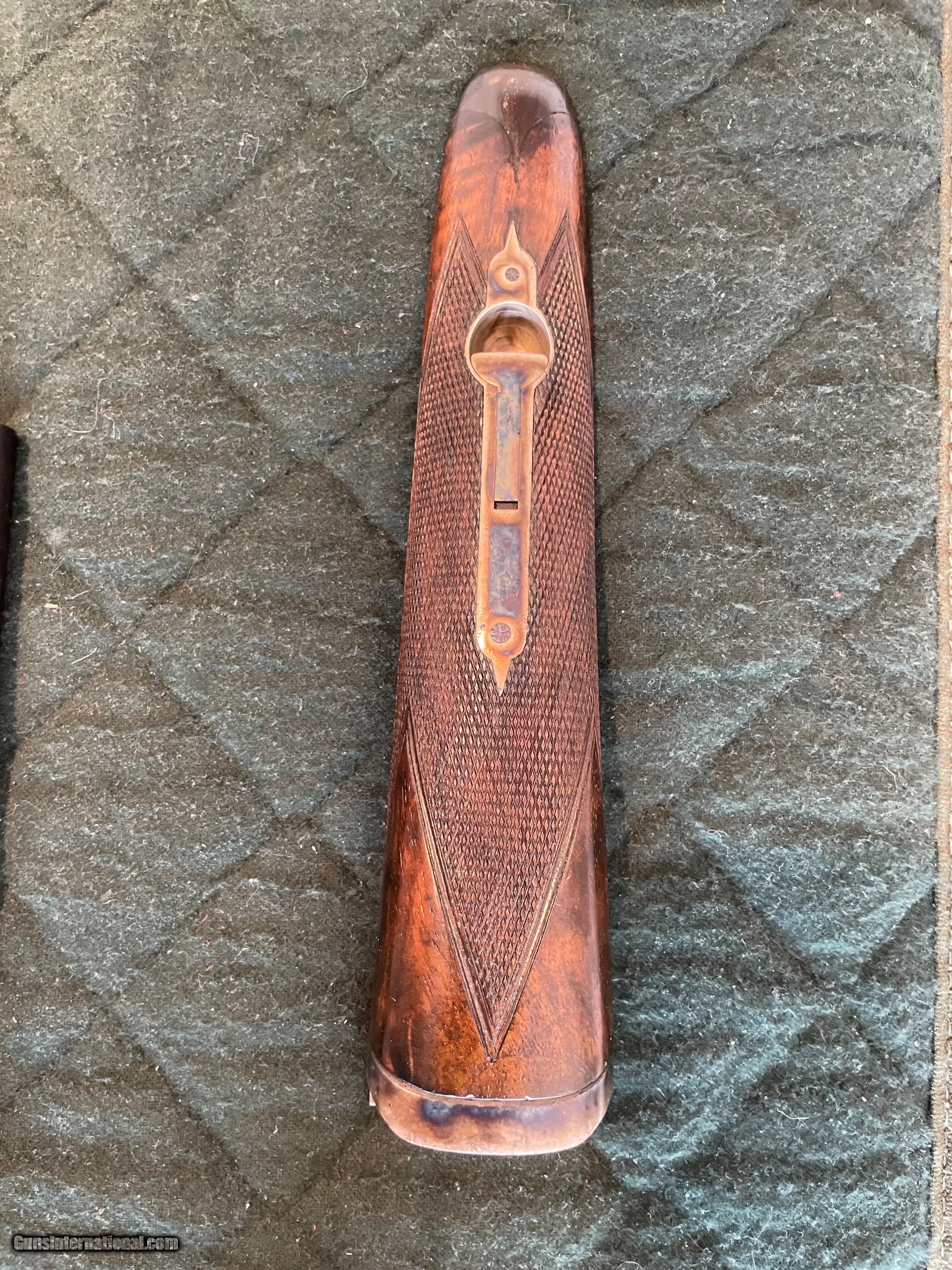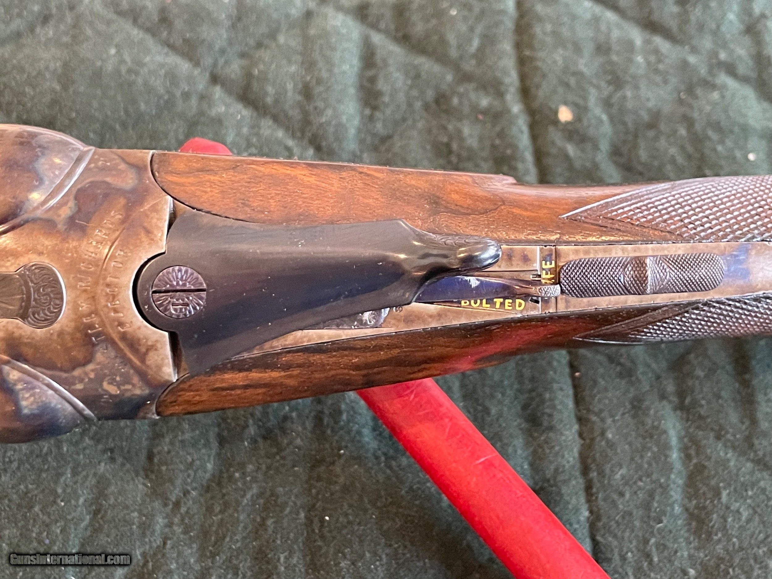 Description: LAST CHANCE GOING TO This rifle was manufactured in circa 1904 featuring the famous Deeley and Taylor patent hand-detachable locks, and is chambered for the classic .450/.400 3" nitro express cartridge. Hornady makes this ammunition today, and it is readily available. Properly balanced with the right barrel length for proportions that are pleasing to the eye. Rifle weighs 9 lbs 15 oz so it is not uncomfortable to shoot. That is the beauty of the .450-400 as it is plenty big medicine to be sure, but no detached retinas as a result of shooting it. The 26" blued barrels are respectively signed “WESTLEY RICHARDS. 178. NEW BOND ST. LONDON. GUN MAKERS BY SPECIAL APPOINTMENT TO HIS MAJESTY KING EDWARD VII” and “W.R. HIGH VELOCITY NITRO EXPRESS RIFLE. .400 BORE”, and each tube is engraved with a band of stylized foliage at the breech end and again at the muzzle. Bores are excellent, bright and shiny. Condition is Excellent as professionally refurbished. The barrels, action and furniture each retain nearly all of their renewed blued and casehardened finish and have slight handling and storage marks. The stock has also been professionally refinished and retains well-defined checkering with occasional scattered minor age related storage and handling blemishes and a small chip along the left edge of the trigger guard tang within the checkered area. Mechanically excellent. Bores are bright and shiny. The lightest amount of pitting exists in the right barrel's grooves, and it may just be fouling as I have removed some fouling with a good cleaning already. The left barrel is even better than is the right. The sunken concave rib is partially engraved with fine classic English scrollwork and sighting comprises a block mounted bead front sight with flip-up moon-sight and patent flip-over tunnel cover and partially matted rear sight ramp with sight formed of one standing notch sight and two folding leaf notch sights graduated to 300 yards. The casehardened treble grip action is signed “WESTLEY RICHARDS” in gold on each side, engraved “WESTLEY RICHARDS/EJECTOR” ahead of the blued toplever, bolted automatic safety with gold inlaid “SAFE” and “BOLTED”, blued detachable floorplate, and blued trigger guard. The underside of the barrels and water table are struck with Birmingham nitro proof marks. The well-figured walnut pistol grip stock has a raised cheekpiece and panels of multipoint checkering on the grip and forearm, a rubber recoil pad , a casehardened grip cap with hinged trap cover, and a casehardened Deeley and Edge fastener and dark horn tip on the forearm. The underside of the butt is numbered “18” and has a blank silver oval initial escutcheon and blued sling eye, and the corresponding sling eye is fitted beneath the barrel to accept hook type sling swivels. Stock has 14 5/8 inch length of pull. Weight 9 lbs. 15 oz. Wonderful Condition. A great no nonsense rifle in the right caliber, at a price that won't break the bank. The same as a Best quality Westley Richards Double Rifle with all the features sans the engraving. This rifle is provided with an Italian made Beretta take down canvas with leather corners case that is in new condition. Thanks for your interest. Please do not hesitate to contact me with questions. No text messages, please. email or call at your convenience. SOLD Rifle Caliber: .450/400 3" Manufacturer: Westley Richards Model: Gold Label Serial Number: 8664 Barrel Length: 26 Bore: Excellent Ejectors: yes Condition: Excellent Action: drop lock Triggers: double LOP: 14 5/8 Finish: Blue / Case Coloring Weight: 9lb 15oz. Manufacture Date: 1904 Case: Canvas Beretta Take Down Case. |