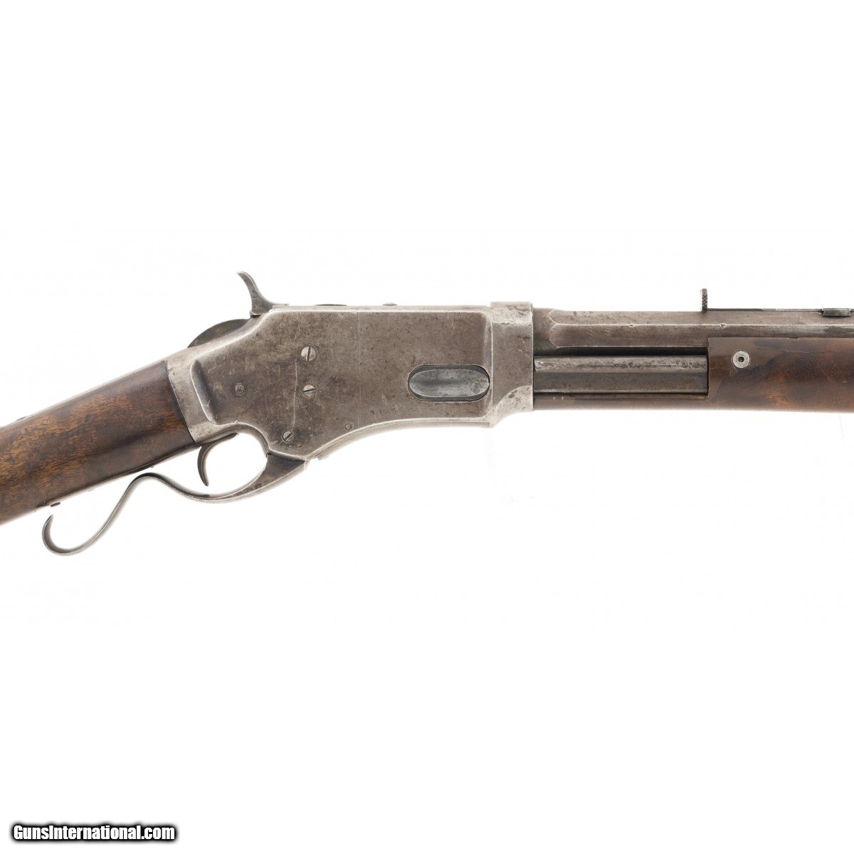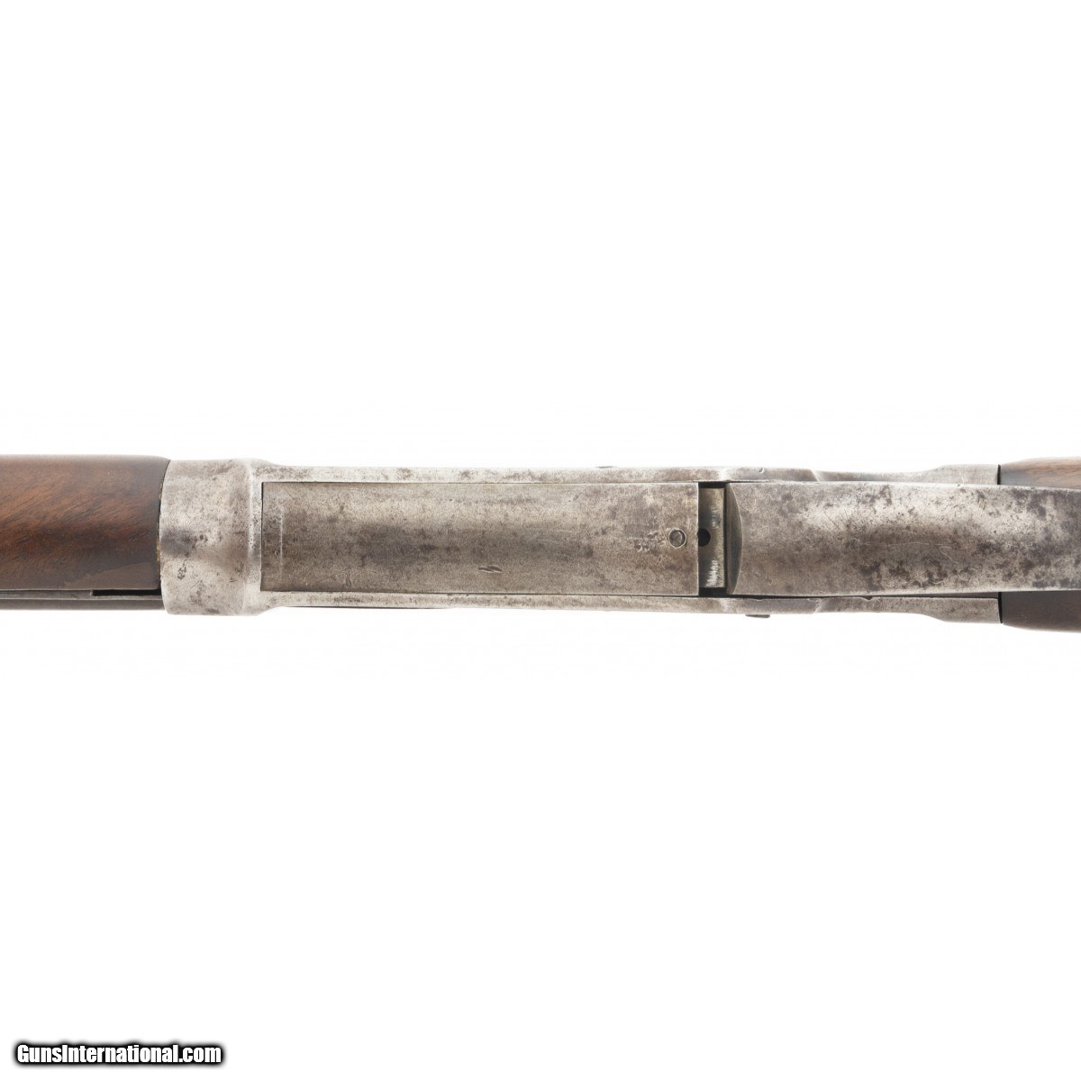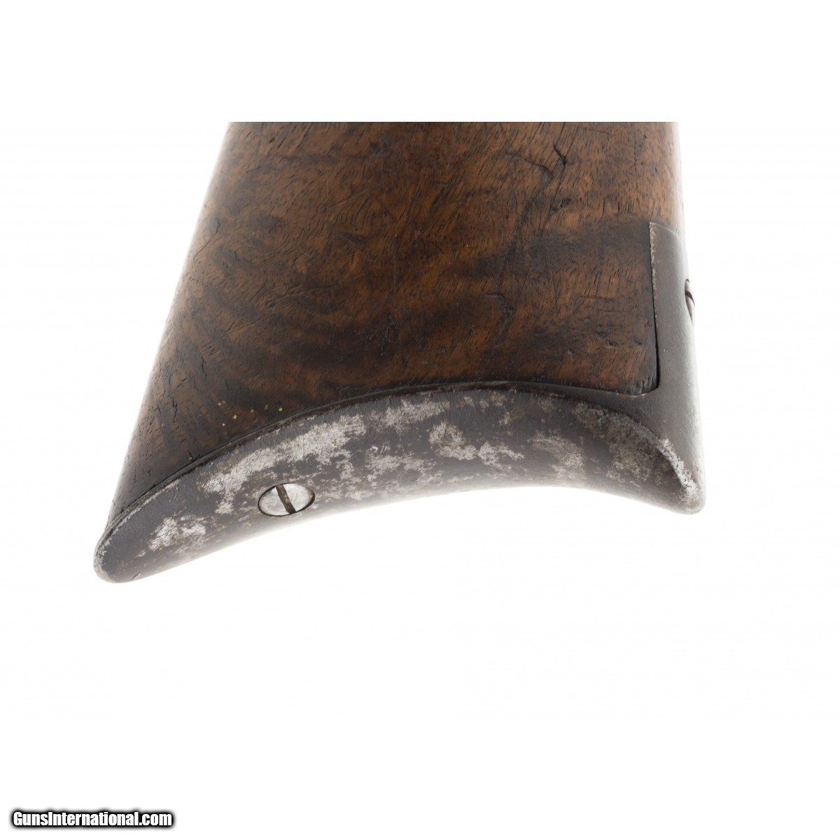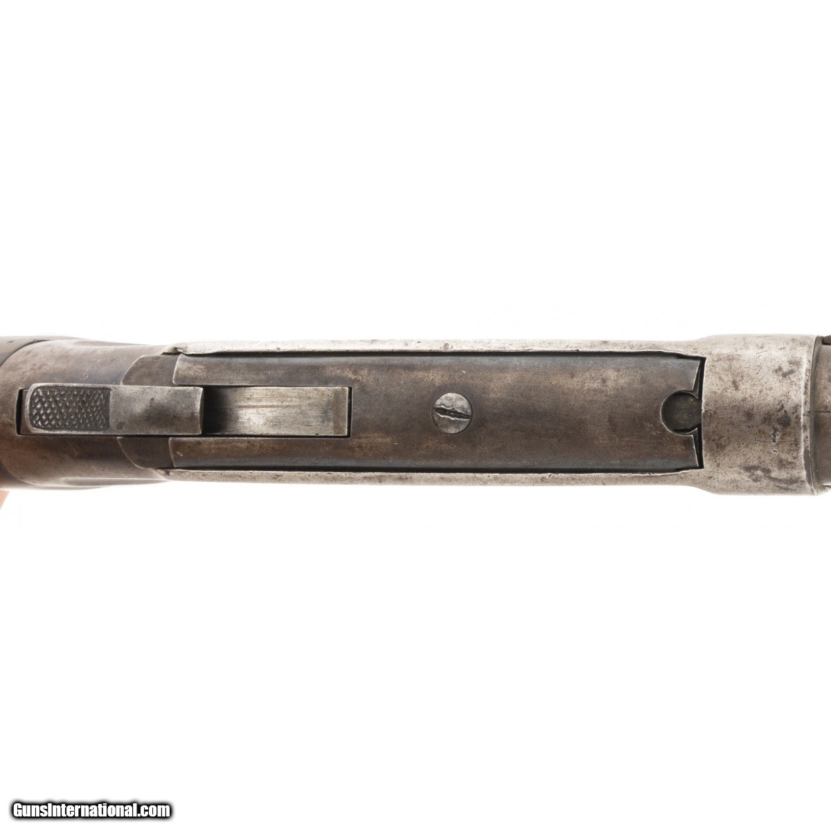 Description: "Made in late 1870s- to early 1880s. 45-70 caliber with a 28in barrel. The metal of this gun is nice and sharp with blue in protected areas, but the metal is mostly a light brown to gray patina. The wood is good with a minor crack on the left hand side of the wrist and a chip on the left hand side of the forearm. There is a repair to the right hand side of the magazine where a rectangular piece of wood was cut out and a piece of metal was attached to repair the magazine. The bore is very fine as it is bright and shiny with just the slightest bit of corrosion. This is a very rare gun with roughly only 1500 of these rifles made. SOLD Antique: Yes |