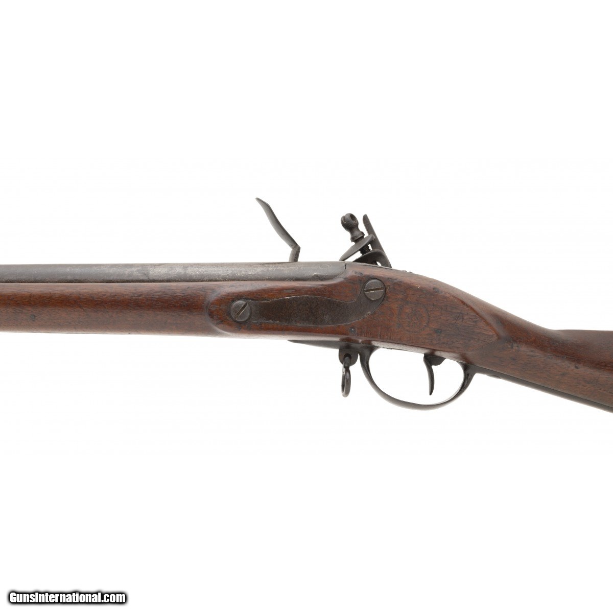 Description: " This Whitney State of New York flintlock 69 caliber musket was made circa 1814. The overall length is approx. 57.5"". The 42"" round barrel has a dark smooth bore. All the metal has a smooth brown patina with a few areas of roughness on the barrel, cock, lock, and bands. The buttplate has moderate pitting from being stored in a moist area. The barrel has the Whitney raised P in a sunken oval proof mark. The lock is marked NEW HAVEN in a ribbon forward of the cock. The bell shaped swivels and ramrod are present. The stock is very good with no cracks or chips. It has the State of New York circular cartouche with scalloped edges with V over BY over I.M inside. The I.M stands for inspector John McLean. The action functions correctly. This is a very nice overall State of New York War of 1812 Whitney musket. SOLD Antique: Yes |