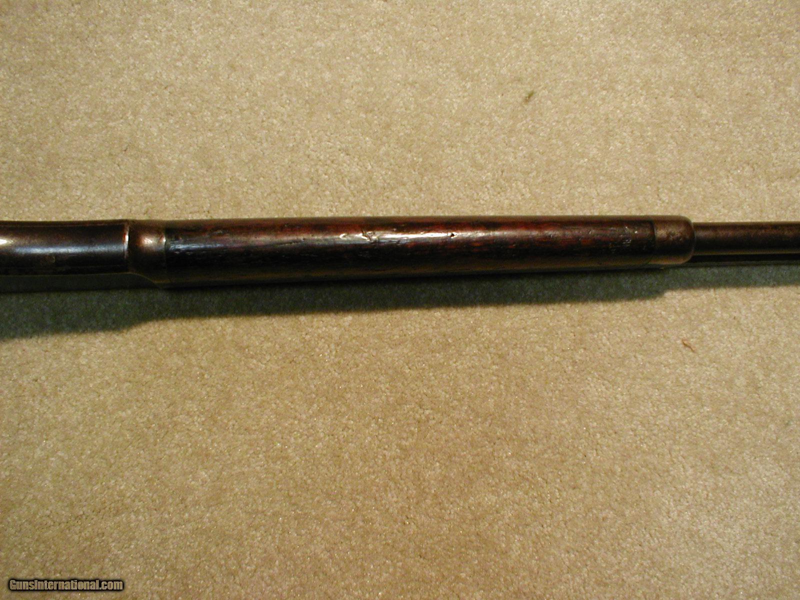 Description: EARLY BIG FRAME WHITNEY-KENNEDY OCTAGON RIFLE IN .45-60 CALIBER, WITH "S" LEVER, MADE EARLY 1880s, quite a bit more scarce than the .44-40 size medium frame model, this one shows use, but no abuse, a nice uncleaned and un-messed with example with 28" octagon barrel, overall metal is an uncleaned mottled gray/brown (receiver, barrel and magazine), exc. screws, exc. wood with tight wood to metal fit shows only light handling, rear sight is a frontier period replacement of a fixed brass buckhorn placed in the original dovetail with no alterations, front sight is a small copper blade, early barrel marking "Whitneyville Armory CT USA" with correct patent markings on the upper tang, bore a little dark with sharp rifling and ought to scrub out to near excellent. This was a limited production very high quality rifle with only 15,000 of all models (medium and large frame) made between 1879 and 1886 when the company was bought out by Winchester who immediately stopped production, thus killing a serious potential competitor! The actions on these rifles are amazingly smooth. Nice example of a large caliber frontier rifle. SOLD Antique: Yes Manufacturer: whitney Model: Whitney-Kennedy Large Frame Sporter Serial Number: 5XXX Caliber Info: 45-60 Condition: VG-Fine Barrels: 28" oct. |