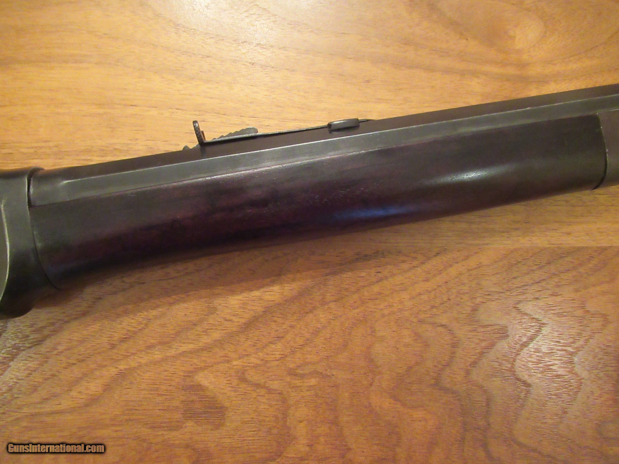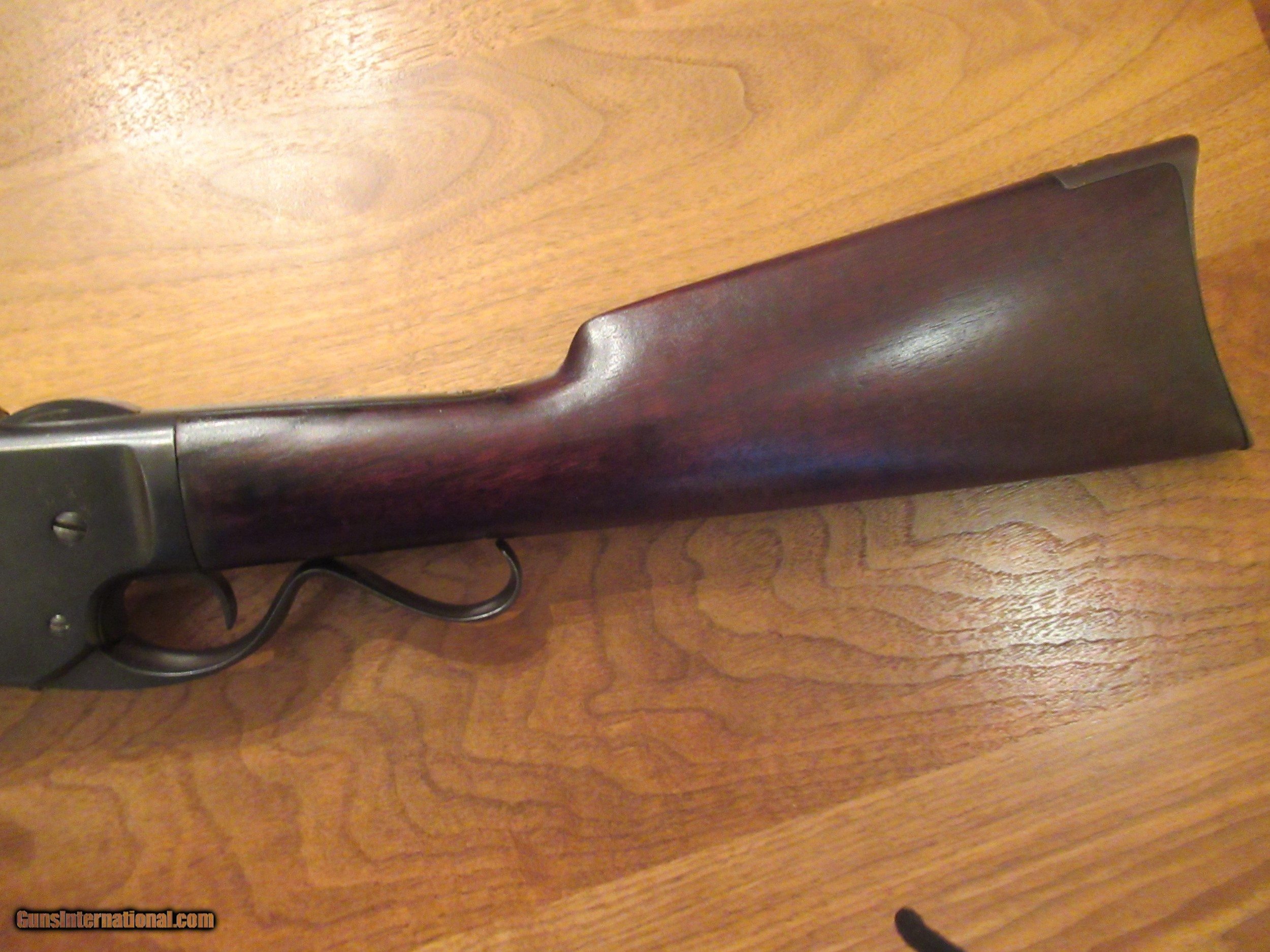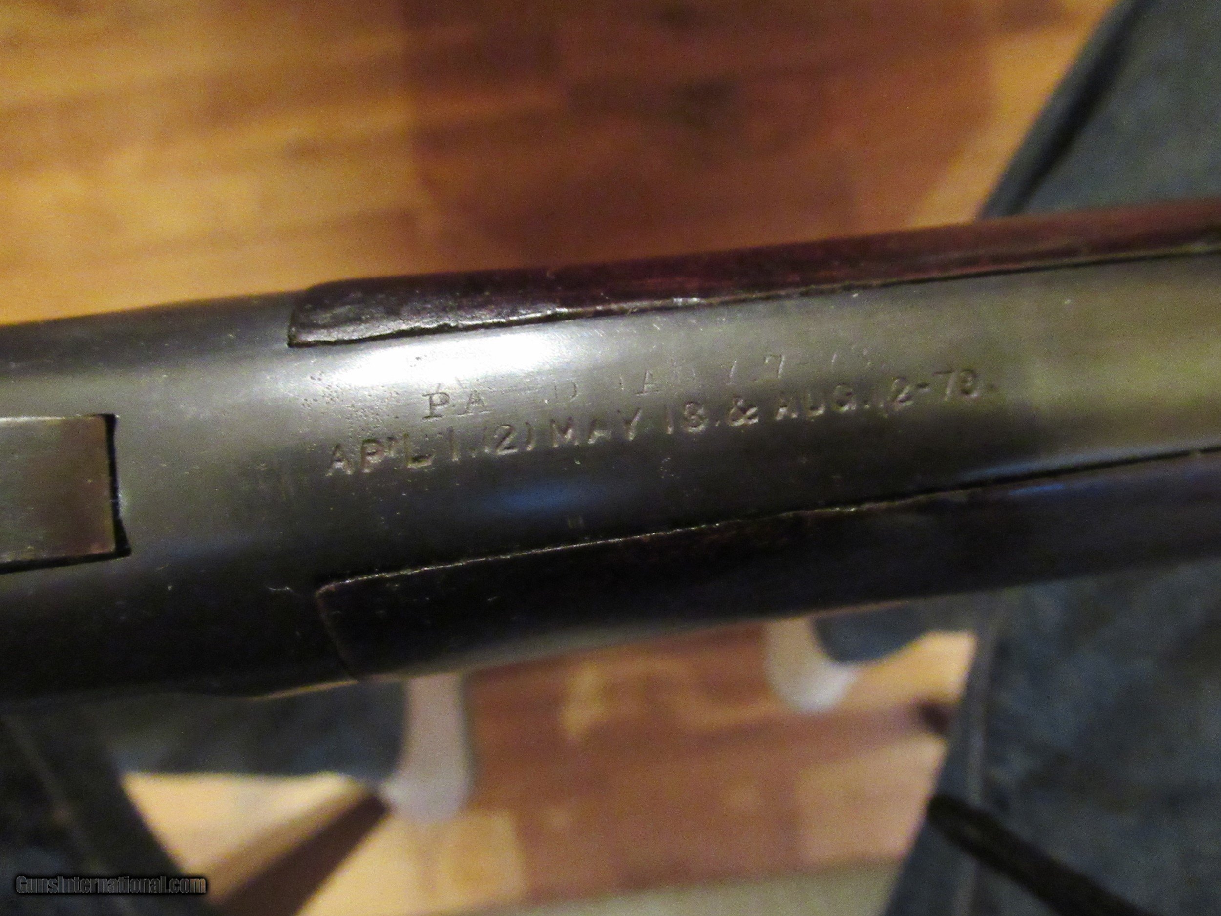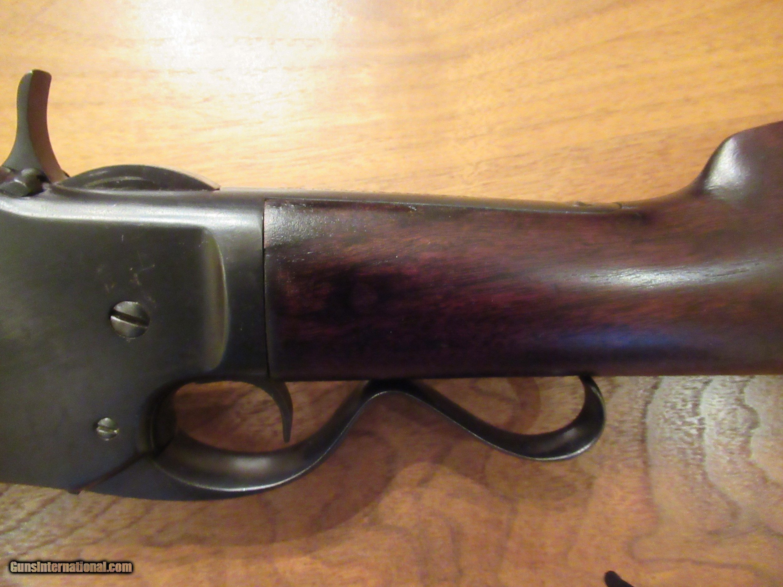 Description: A scarce Whitney Kennedy Lever Action Rifle with only about 15,000 made ending in 1887. Mechanically excellent with a good shootable bore with some typical black powder pitting but strong rifling. Barrel is 20 inches and 44-40 caliber. This gun looks to be an old refinish but nicely done with some lightening to the markings on the tang. The barrel is 20 inches which means it was probably shortened many years ago for better handling as the octagon barrel is substantial. The wood shows an old hard to see repair at tang and the forend looks to have old repairs along the top sides. Whitney Kennedy's are hard to find and if this was all original would bring around $3000. It will make a good shooter or cowboy action gun. Please see the detailed pictures. Shipping is $40. No sales to Alaska or Hawaii or where prohibited. Please email with any questions. SOLD Antique: Yes Rifle Caliber: .44-40 Winchester |