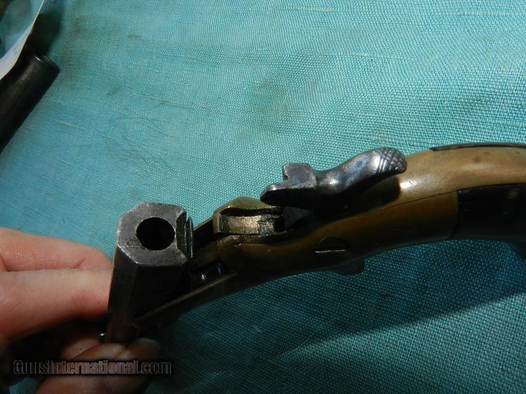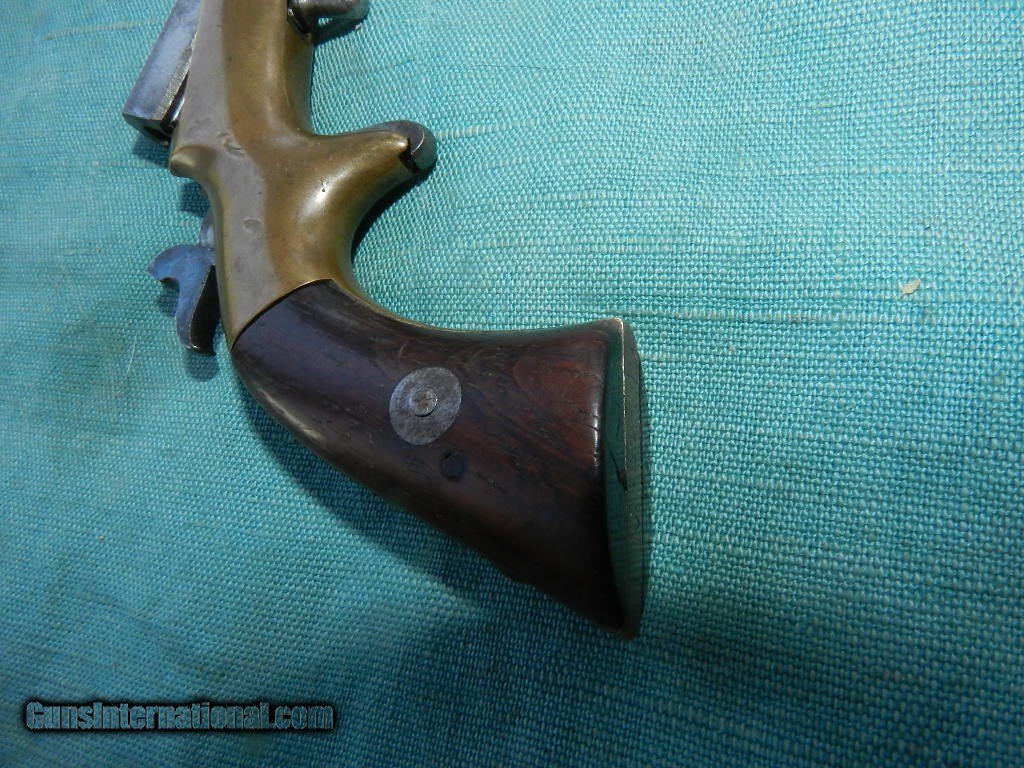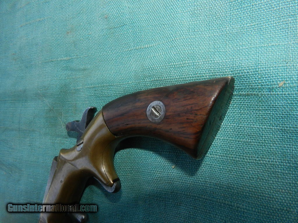 Description: SOLD With a serialof #636,this 22 RF derringer with a, 3 1/2” part-round part-octagon barrel with an oxidized and pitted bore. The barrel on this First Type pistol has been lightly cleaned and has aged to light brown and pewter with area of light pitting. The brass frame rates very good plus with scattered light dents and handling marks. The smooth un-numbered rosewood factory grips rate about good showing light handling marks,very, very, small chip missing from the right toe and an almost noticable small check at the butt of the right panel.Push button under the barrel s pulled back to tip up the barrel. The gun functions mechanically and barrel-to-frame fit exhibits a little bit of play. There are a few lightly struck letters on the butt. Top of the barrel states F. Wesson, pat'd oct 25th 1859. A neat hide away small frame .22 derringer.When buying a gun always have it examined by a competent gunsmith before shooting. To buy a gun from me you must get a direct email for me, with details, and shipping cost. We don’t have a web site .I prefer money orders or a check. Item ships when funds come in. I try to keep guns affordable, which means I make less money than most dealers. You won’t get altitude sickness, or nose bleed, with my prices! I consistently have the best selection of older guns If you attempt to buy, you must still contact us for details . Best to email to buy. Sometimes a local person can stop buy and purchase before the gun is removed. Sometimes not home to get calls. Some guns are required shipment to a gun dealer near you for a transfer to you when it arrives. Otherwise many older or black powder guns ship to your door. With the widest selection of older guns at great prices, We don’t have a store, and sell on the internet only. I’m easy to get along with. Thank You[JB1] [JB1] SOLD Antique: Yes |