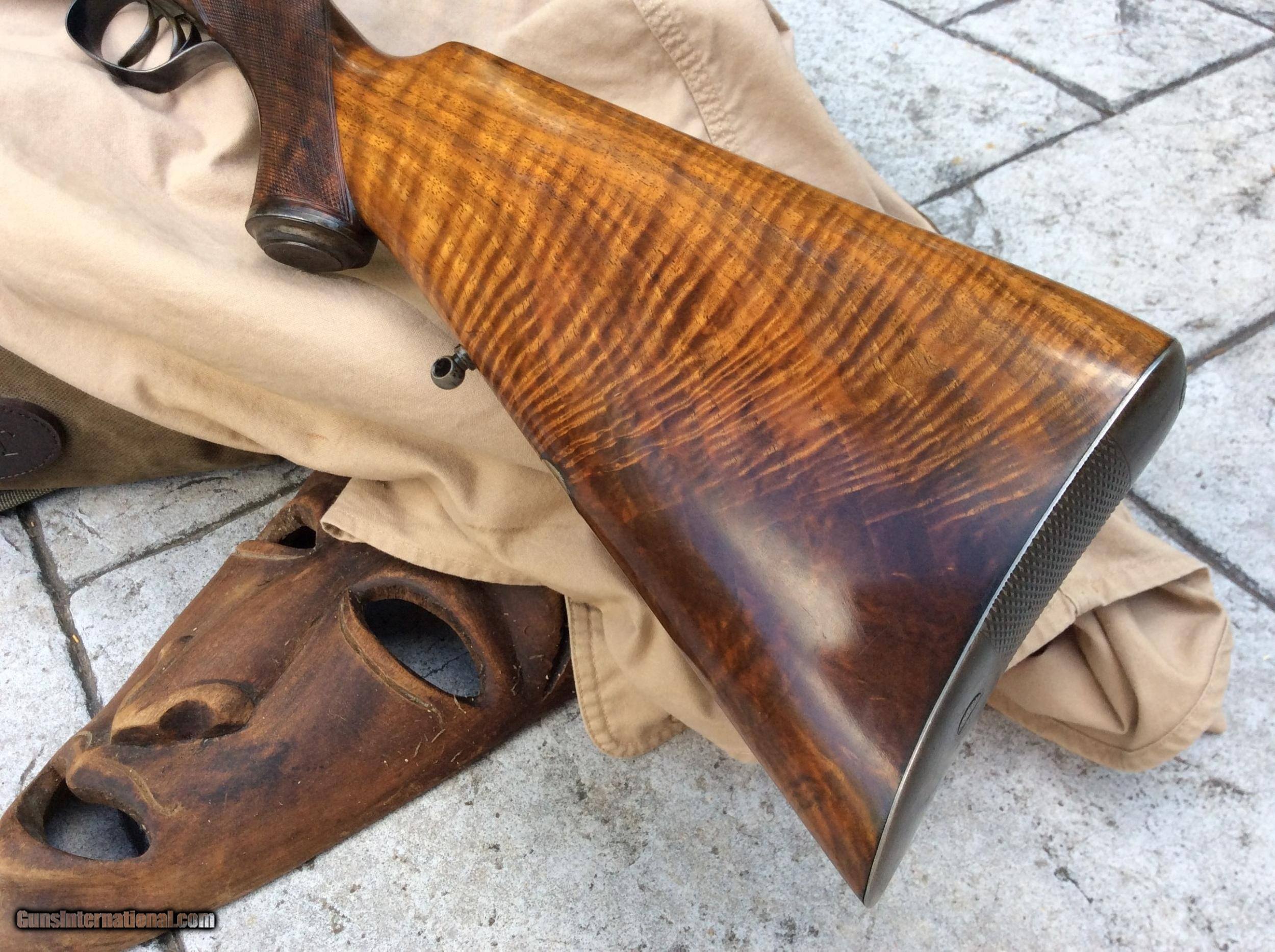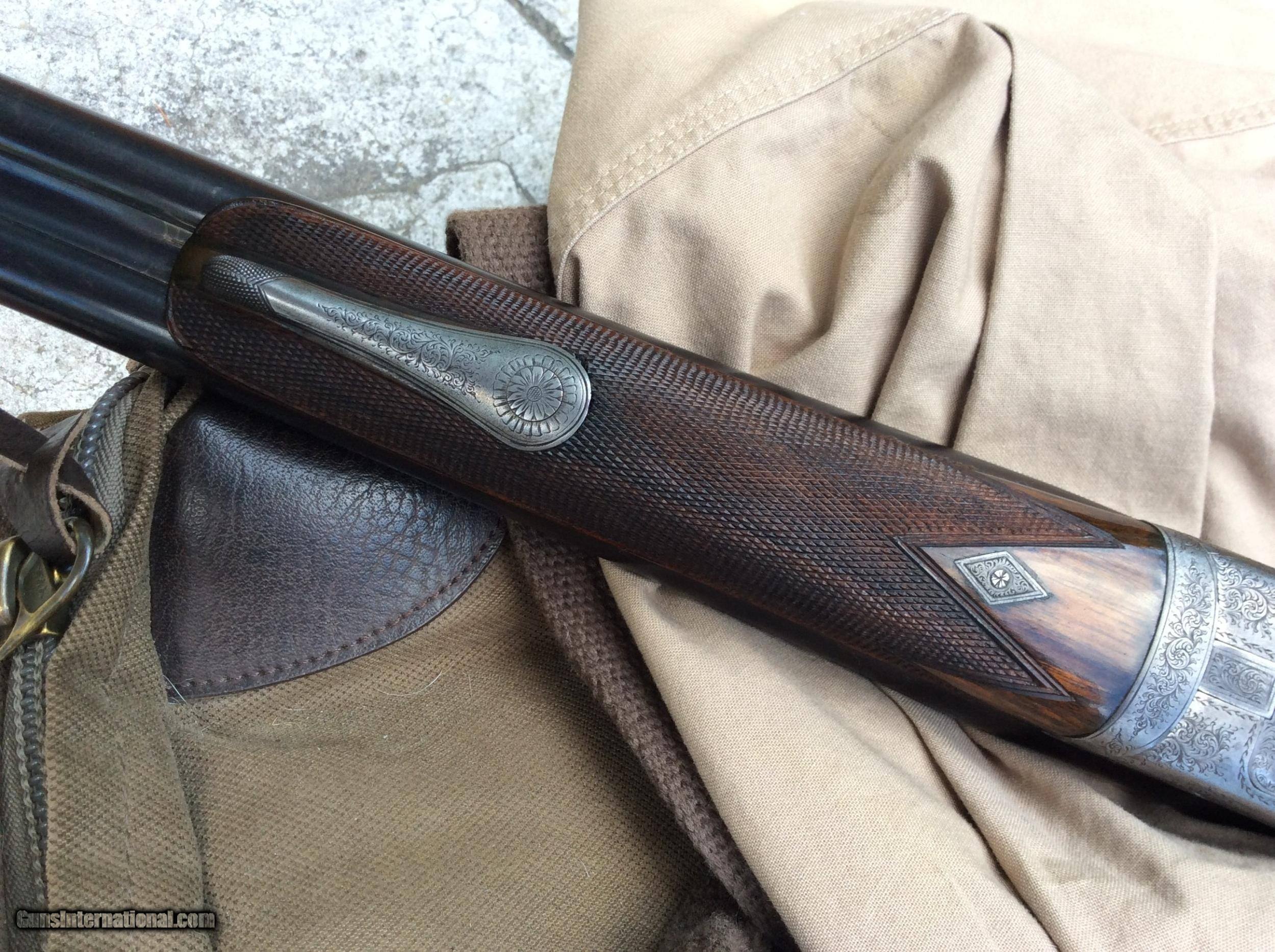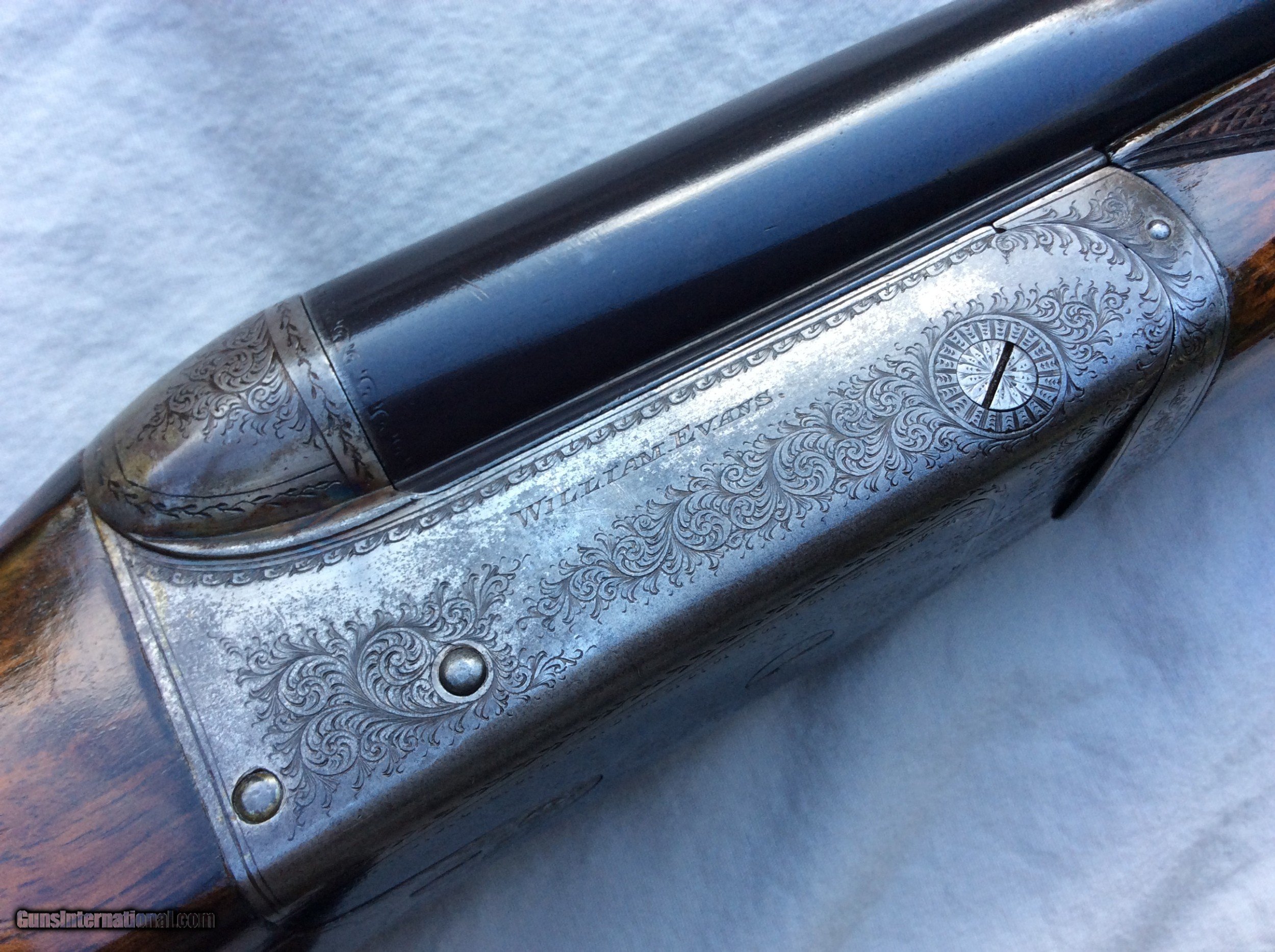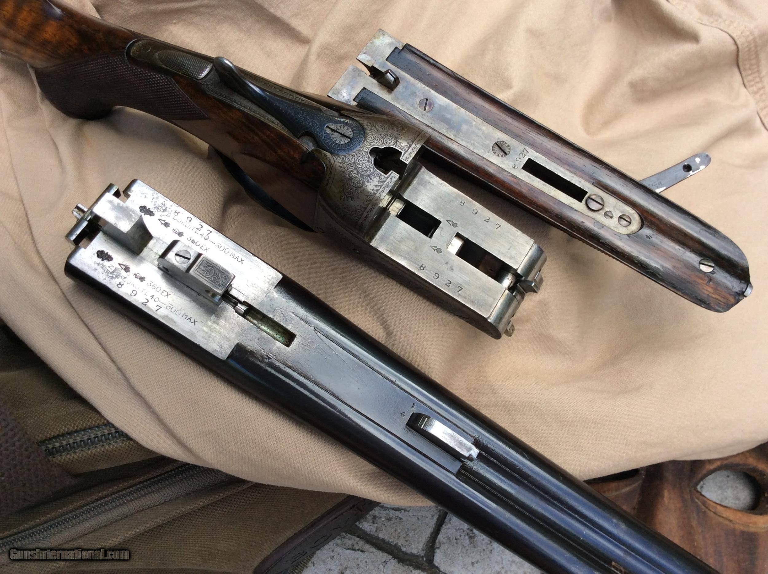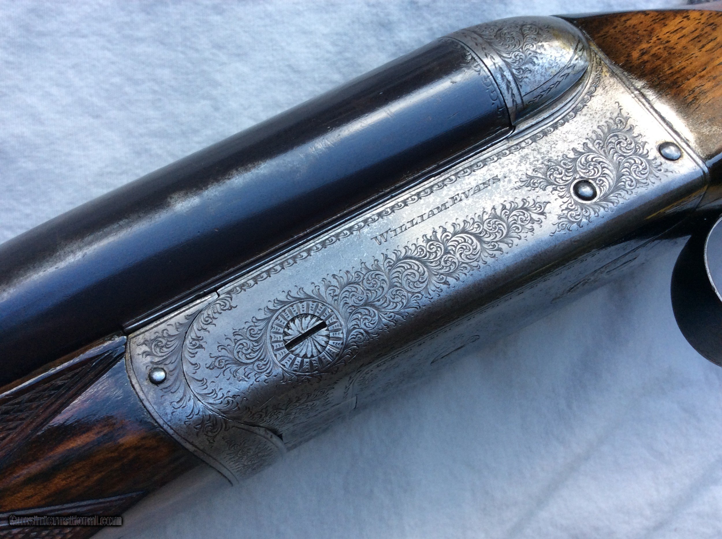 Description: WILLIAM EVANS (FROM PURDEY'S) .400/.360 PURDEY NITRO EXPRESS (2 ¾ in.) BOXLOCK EJECTOR DOUBLE RIFLE ACTION/RECEIVER: Built on the venerable Webley Long Bar action- Bushed Strikers- Double Triggers- 80% Engraving coverage in Fine English Scroll- Bottom Tang Extended to Engraved Steel Grip Cap. BARRELS: 26” Dovetail Lump Ejector Barrels with Raised Matted Rib and Doll's Head Third Bite- Express Rear Sight with One Standing and Two Folding Leaves- Ramp Front Sight with Fine Bead plus Flip Up Night Sight. WOOD: Neutral Cast Buttstock with stunning Fiddleback figure- 14 5/8” LOP to Checkered Steel Buttplate with Widow's Peak. Lever Release Forend. Sling Eyes fore and aft. CONDITION: Excellent- As close to Original as you will find- Receiver Silvered with Even Patina- Bluing at 94%- Wood Solid with Checkering at 96%- Action Tight and On Face- Strong Ejectors – VG/Excellent Bores. WEIGHT: 9lbs 2oz ACCESSORIES: In its original brass cornered canvas trunk case with William Evans trade label. Also included are reloading data, a full set of CH4D reloading dies, new Kynoch headstamped snap caps, 100 pcs new unfired Kynoch brass (for modern Boxer primers), and 8 vintage Kynoch ammo boxes containing 16 pcs old once-fired brass and 11 live rounds old unfired cartridges (all Berdan-primed). PROVENANCE: William Evans company records indicate this rifle was commissioned in 1907 (name of ordering individual illegible) with final recorded sale to Lt. Col. W.G.S. Mitchell in 1919. Extensive bio on Sir William Gore Sutherland Mitchell documents his rise through the Royal Air Force (RAF), retiring in 1941 at the rank of Air Chief Marshal at which time he became the first RAF Officer to hold the post of “Black Rod” in the House of Lords. THIS GUN HAS IT ALL – Condition, Provenance, and Performance (Accurate with readily available 9.3mm dia. bullets, well matched power for deer/wild boar-sized game, and light recoil for pleasant extended shooting). SOLD Rifle Caliber: .400/360 Nitro Express |