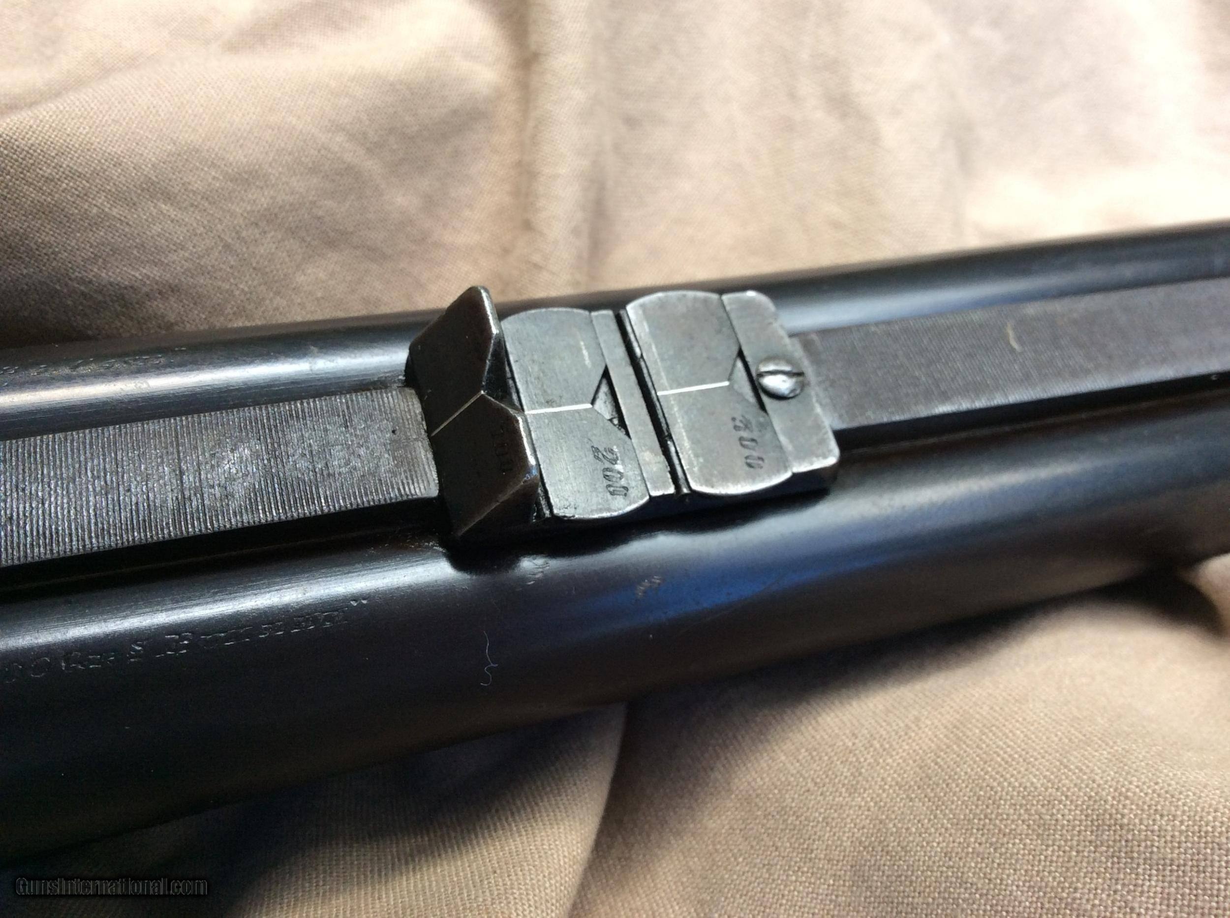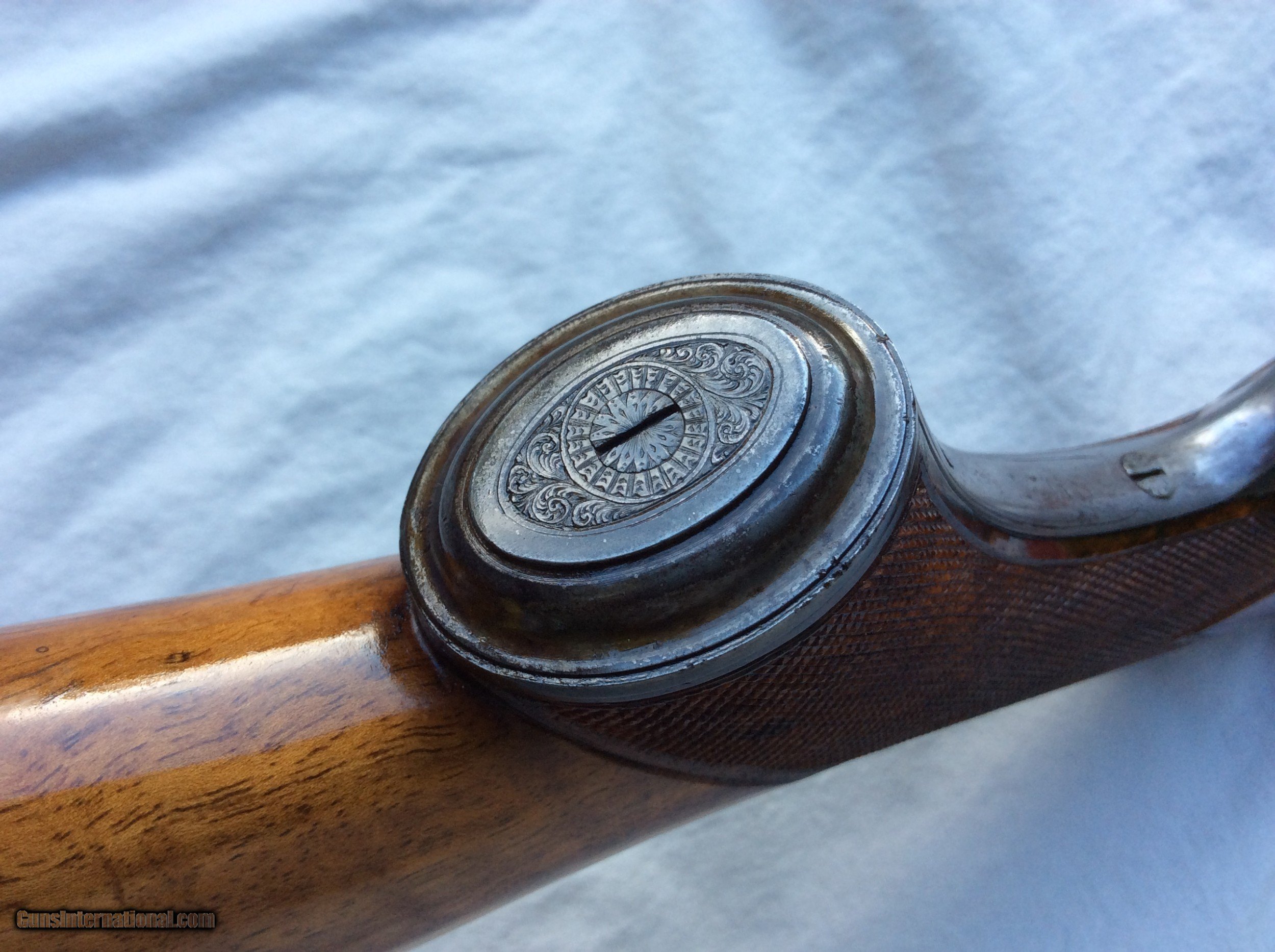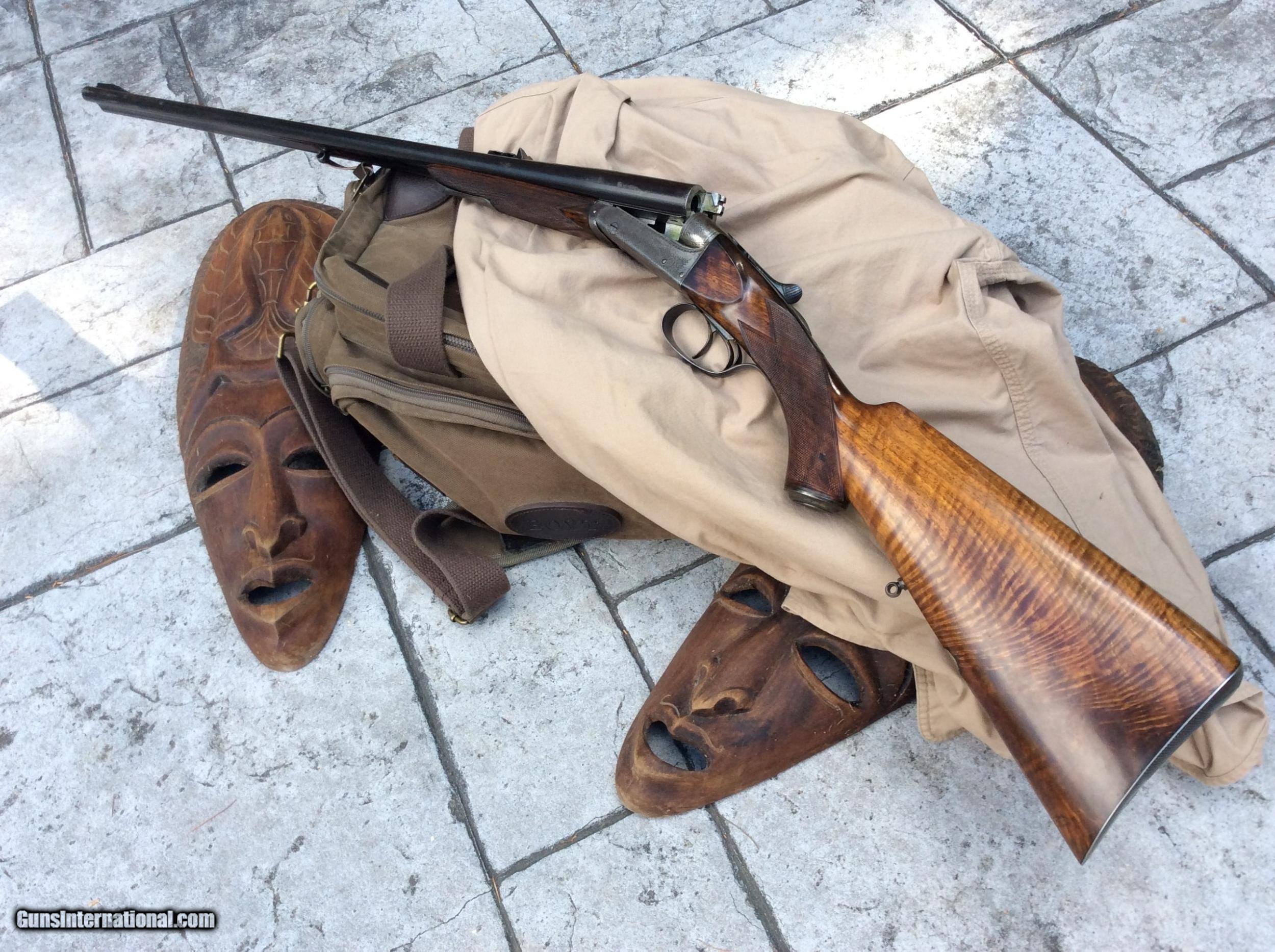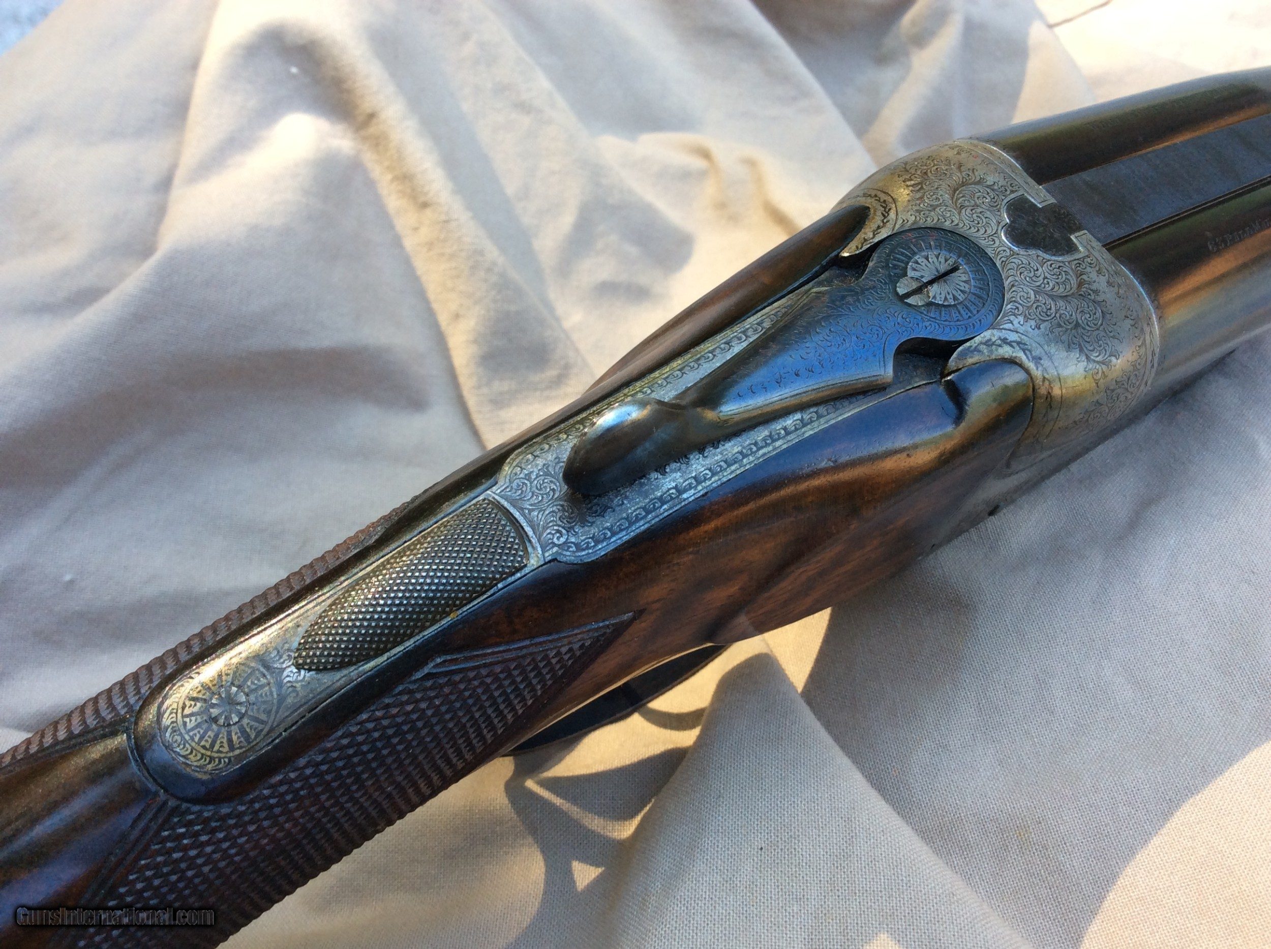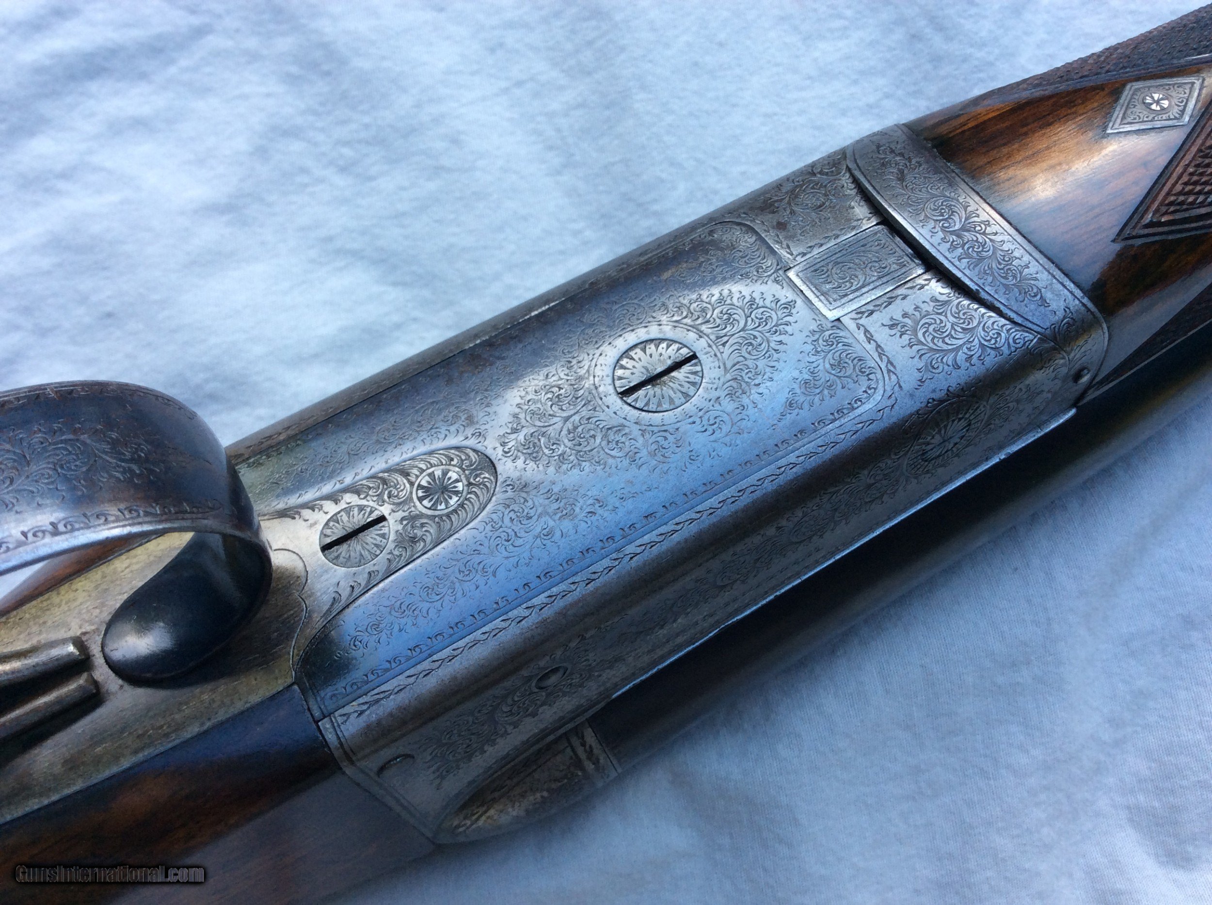 Description: WILLIAM EVANS (FROM PURDEY'S) .400/.360 PURDEY NITRO EXPRESS (2 ¾ in.) BOXLOCK EJECTOR DOUBLE RIFLE ACTION/RECEIVER: Built on the venerable Webley Long Bar action- Bushed Strikers- Double Triggers- 80% Engraving coverage in Fine English Scroll- Bottom Tang Extended to Engraved Steel Grip Cap. BARRELS: 26” Dovetail Lump Ejector Barrels with Raised Matted Rib and Doll's Head Third Bite- Express Rear Sight with One Standing and Two Folding Leaves- Ramp Front Sight with Fine Bead plus Flip Up Night Sight. WOOD: Neutral Cast Buttstock with stunning Fiddleback figure- 14 5/8” LOP to Checkered Steel Buttplate with Widow's Peak. Lever Release Forend. Sling Eyes fore and aft. CONDITION: Excellent- As close to Original as you will find- Receiver Silvered with Even Patina- Bluing at 94%- Wood Solid with Checkering at 96%- Action Tight and On Face- Strong Ejectors – VG/Excellent Bores. WEIGHT: 9lbs 2oz ACCESSORIES: In its original brass cornered canvas trunk case with William Evans trade label. Also included are reloading data, a full set of CH4D reloading dies, new Kynoch headstamped snap caps, 100 pcs new unfired Kynoch brass (for modern Boxer primers), and 8 vintage Kynoch ammo boxes containing 16 pcs old once-fired brass and 11 live rounds old unfired cartridges (all Berdan-primed). PROVENANCE: William Evans company records indicate this rifle was commissioned in 1907 (name of ordering individual illegible) with final recorded sale to Lt. Col. W.G.S. Mitchell in 1919. Extensive bio on Sir William Gore Sutherland Mitchell documents his rise through the Royal Air Force (RAF), retiring in 1941 at the rank of Air Chief Marshal at which time he became the first RAF Officer to hold the post of “Black Rod” in the House of Lords. THIS GUN HAS IT ALL – Condition, Provenance, and Performance (Accurate with readily available 9.3mm dia. bullets, well matched power for deer/wild boar-sized game, and light recoil for pleasant extended shooting). SOLD Rifle Caliber: .400/360 Nitro Express |