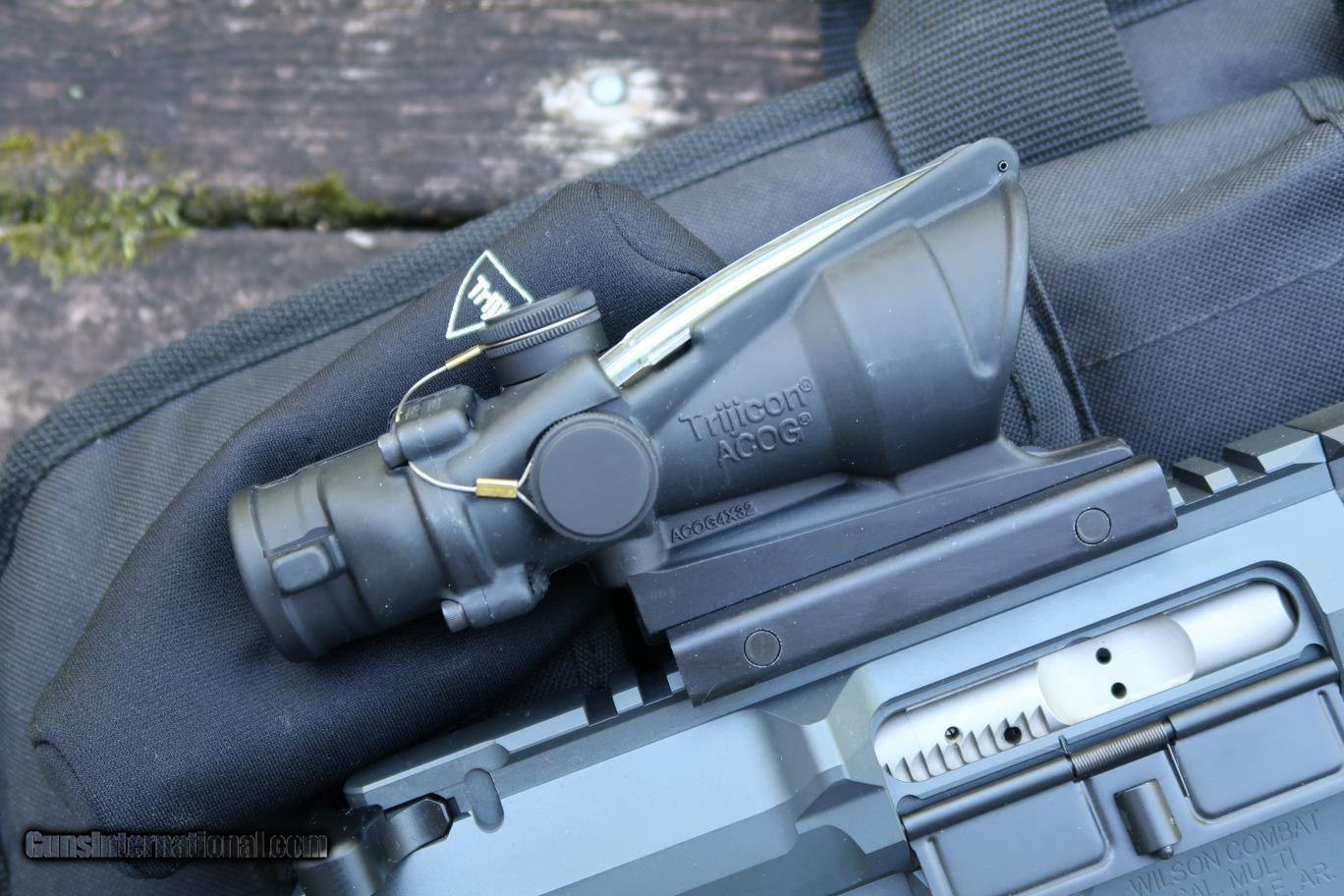 Description: As new, early Wilson Combat Rifle, receiver has matte gray finish. Barrel 16" fluted medium weight with flash hider & threads. Ventilated aluminum forearm with picatinny rail & left side accessory rail. MOA pistol grip and tactical trigger guard. Single stage trigger. Collapsible Rogers Super-Stock. Trijicon ACOG 4x32 BAC with green central reticle. One L5-AWM 30 round magazine. Complete with factory Wilson Combat case with pockets and accessory pouch. No literature. Synopsis: Wilson Combat, Recon Tactical, with Trijicon 4x32 BAC green reticle and case. Cal: 5.56/.223 Condition: CONDITION: As new without evidence of use. The Wilson Combat rifle has a high capacity magazine that prohibits sales to CA, CO, NY, NJ, CN, HI, MD or any other states whose laws prohibit the purchase of such a firearm. There will be no separation of the rifle and magazine. ~~Insured shipping fee of $105; most packages shipped using FedEx 2nd Day.~~ SOLD Manufacturer: Wilson Serial Number: WBC0736 Caliber Info: .223 Rem |