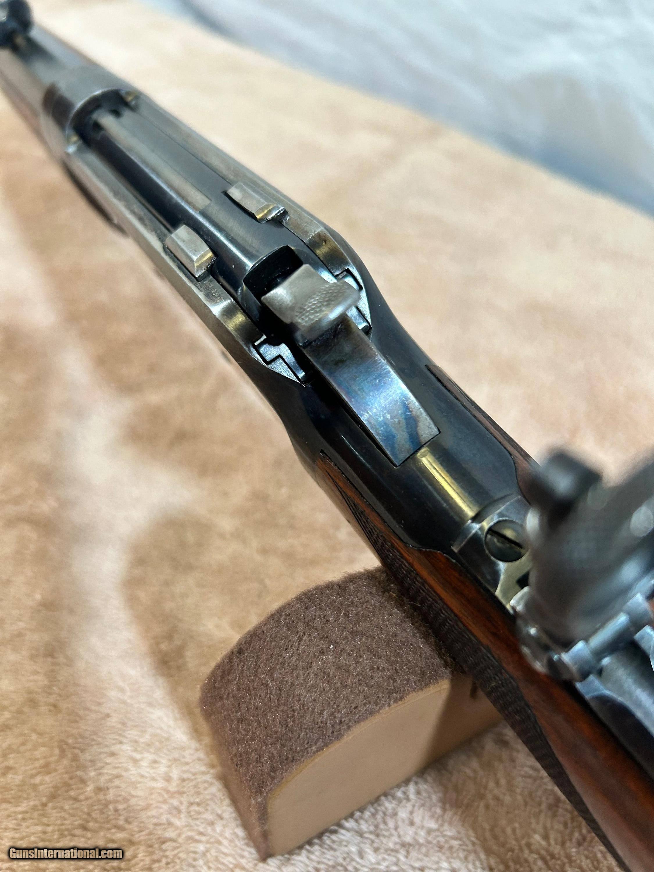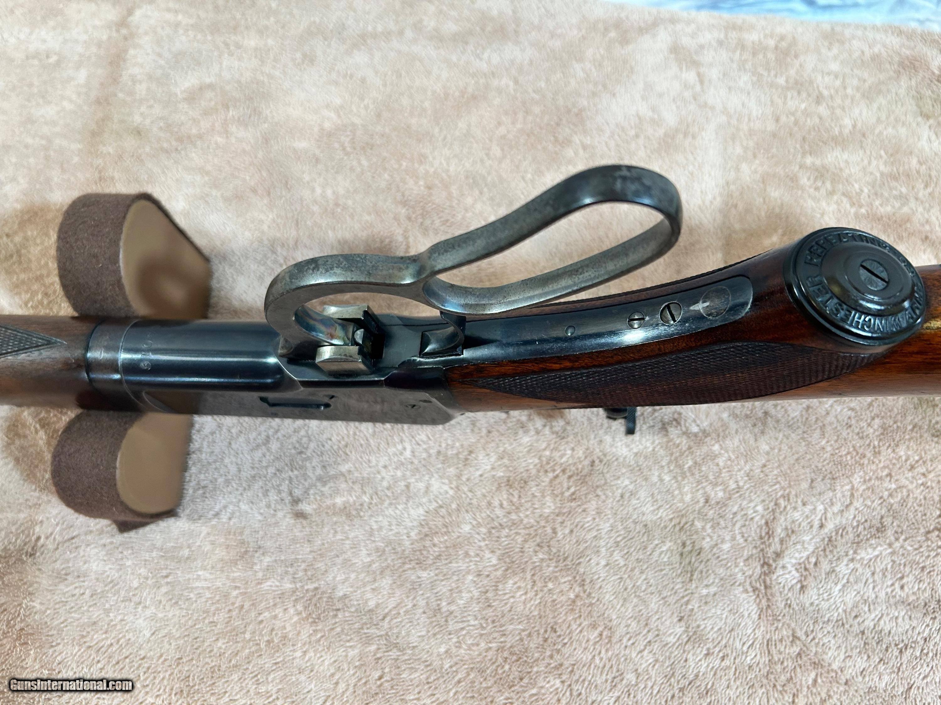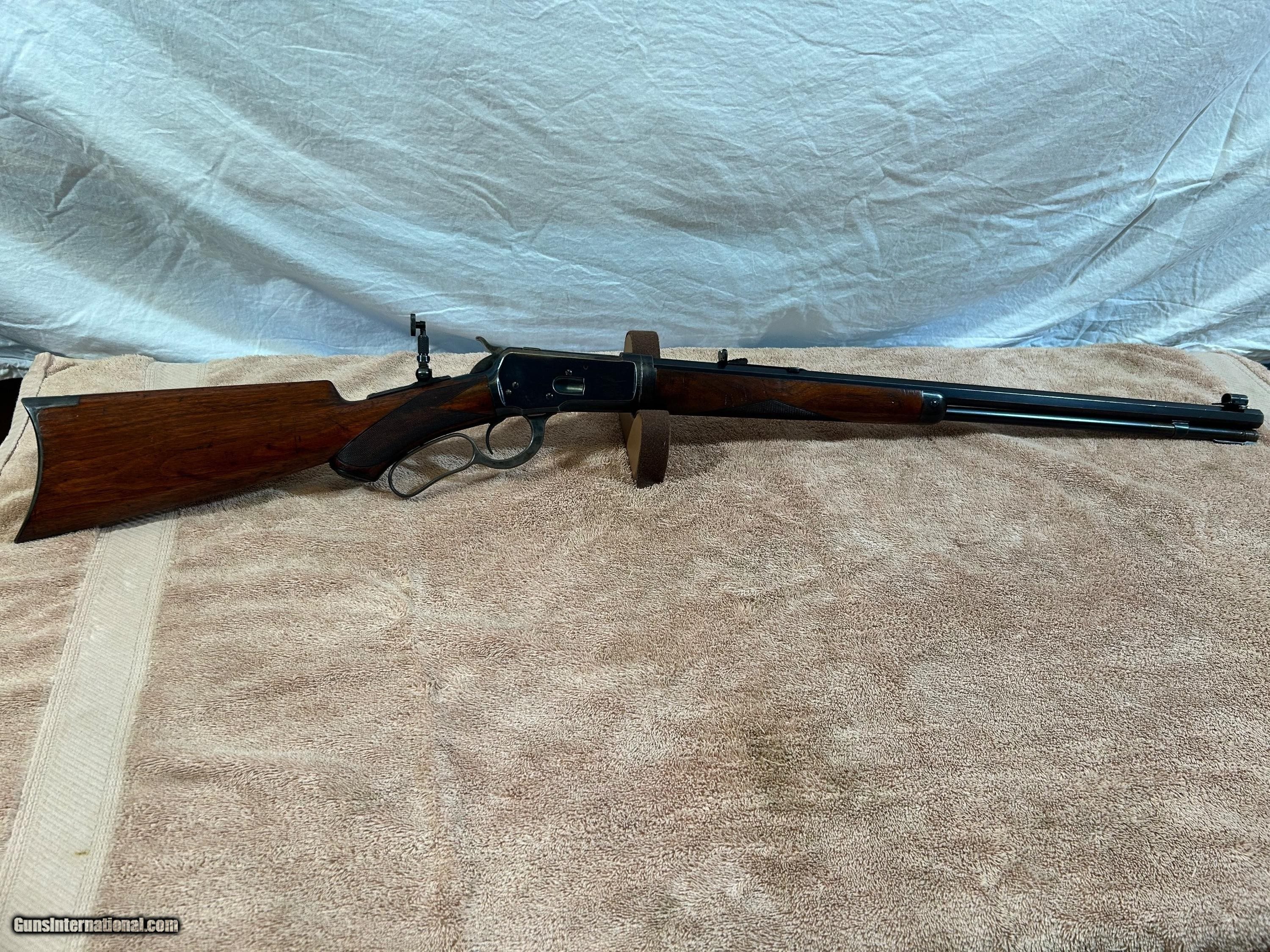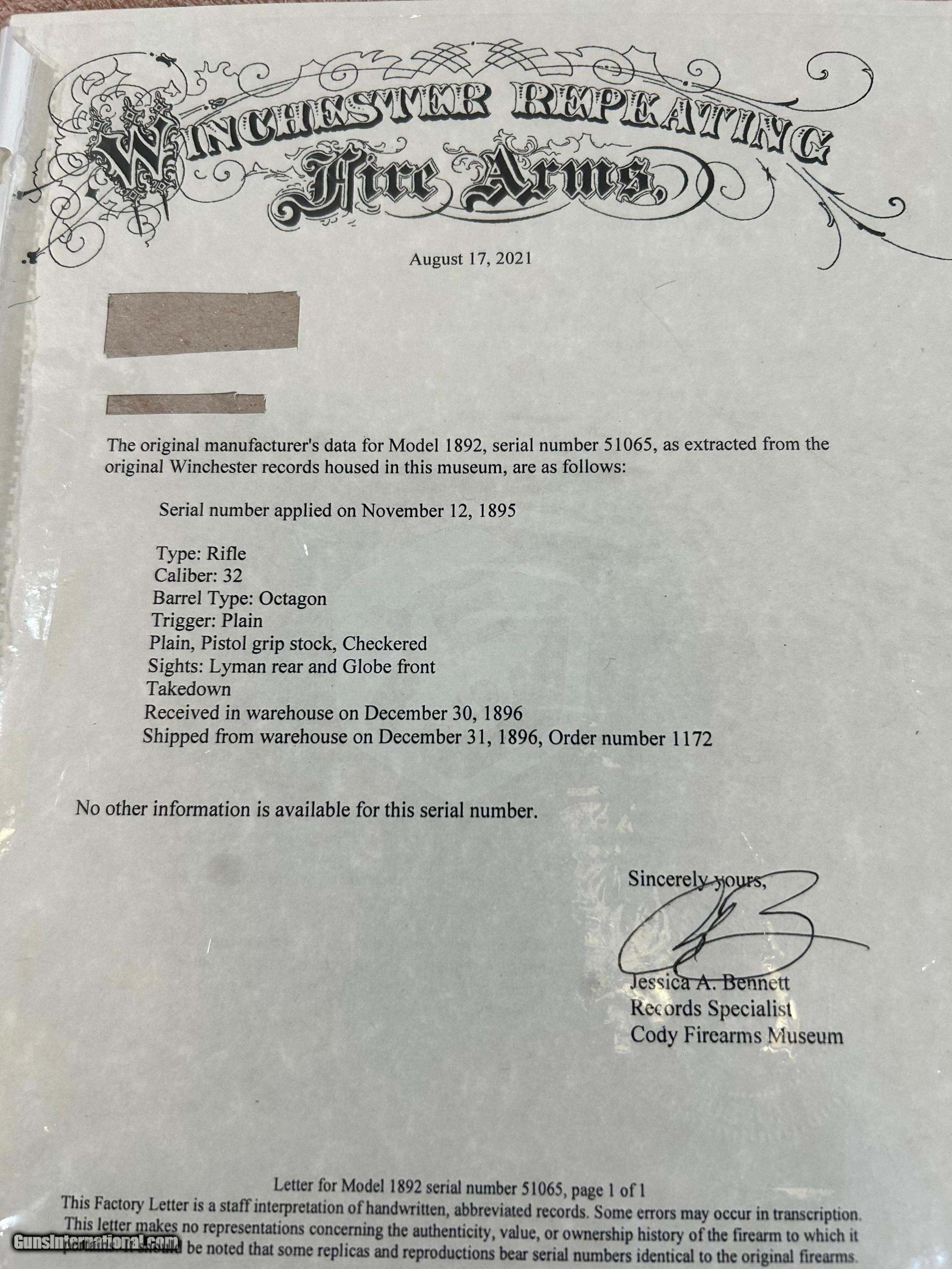 Description: Scarce Antique Winchester Mod 1892 Deluxe Factory special order 32-20. Special order options are Deluxe Checkered Stock, Capped Pistol Grip, Take Down, Lyman Globe front sight, Lyman Tang Peep sight. All the special order features are listed on the Factory Letter. Rifle has a standard 24in. Octagon Bbl. With a nice bore about a 7 out of 10 The rifle retains a large amount of original blue with edge wear, nice case color on the lever, hammer and butt plate. Very nice Fire Blue loading gate. The Wood stock with matching forearm retains nice original varnish. Overall this is a very scarce Antique Deluxe 1892 that seldom comes available. Mfg 1895. Collector Quality Please add 75$ S/H All reasonable offers considered. Thanks for looking. SOLD Antique: Yes Manufacturer: Winchester Model: 1892 Serial Number: 51065 Barrel Length: 24in. Condition: All original Metal Condition: Very good Wood Condition: Nice Bore Condition: 1-10. (7) Manufacture Date: 1895 |