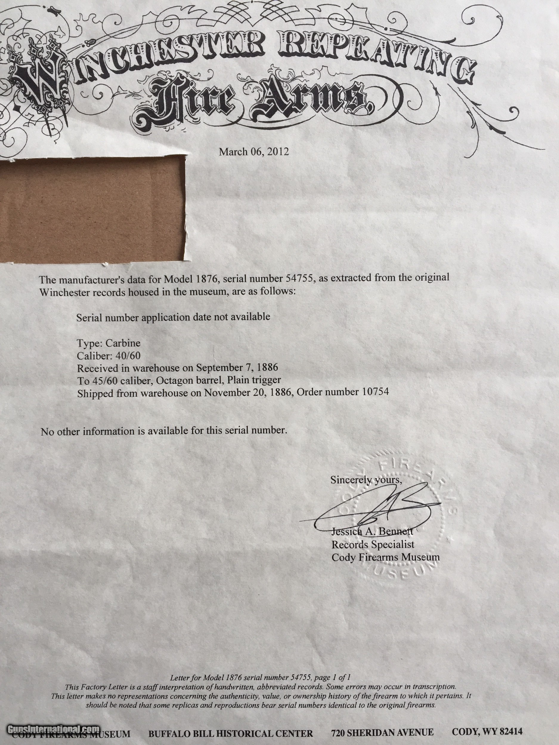 Offered up here, is an opportunity to own a very rare Winchester rifle. We are all familiar with Saddle Ring Carbines, this is not that. This Winchester Third Model 1876, serial number 54,755, began its humble life as a Winchester Model 1876 Saddle Ring Carbine (SRC) in 40-60 caliber, as entered in the assembly records, and shipped to the warehouse on September 7, 1886. However, it went back to the assembly room before final shipment from the warehouse (at the request of the customer who ordered it) where it was converted to Rifle configuration, with a caliber change to 45-60 and the saddle ring retained. The carbine to rifle conversion meant a different barrel, magazine tube and stamped carrier block, still using the original serialized receiver. The gun was finally shipped on November 20, 1886 in its new configuration: an Octagon Barrel, Full Magazine, Crescent buttplate Rifle with the Sling Ring maintained. A “Saddle Ring 1876 Rifle”, if you will.