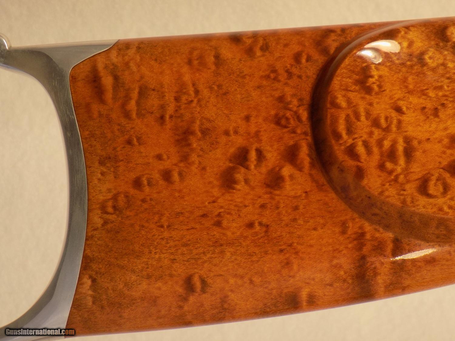 Description: #2131A WIN. HI WALL ENGRAVED CUSTOM SCHUETZEN RIFLE, 45 70, 26 #2 oct. bbl., casehardened receiver is floral engraved, mint curly Maple checkered PG left hand cheek rest stock, nickeled Schuetzen buttplate, checkered snobble forend, adjustable midrange tang sight & vernier windage adjustable globe front sight, mint bore, 100% casehardening on receiver, 100% bbl. blue. $3450 SOLD |