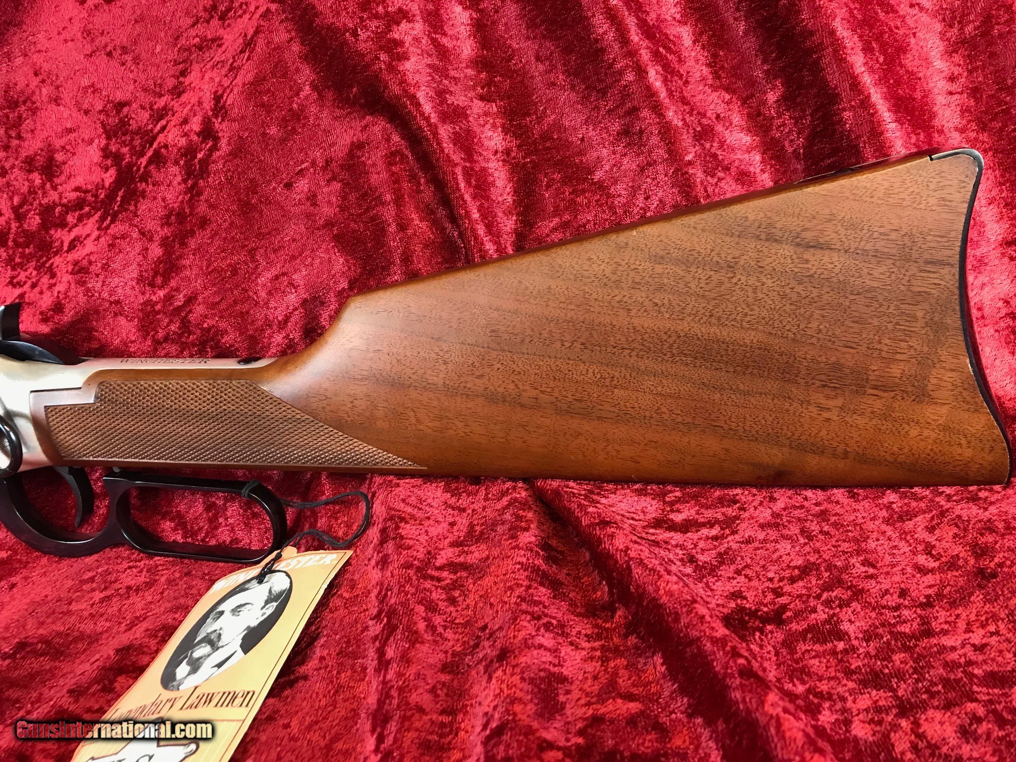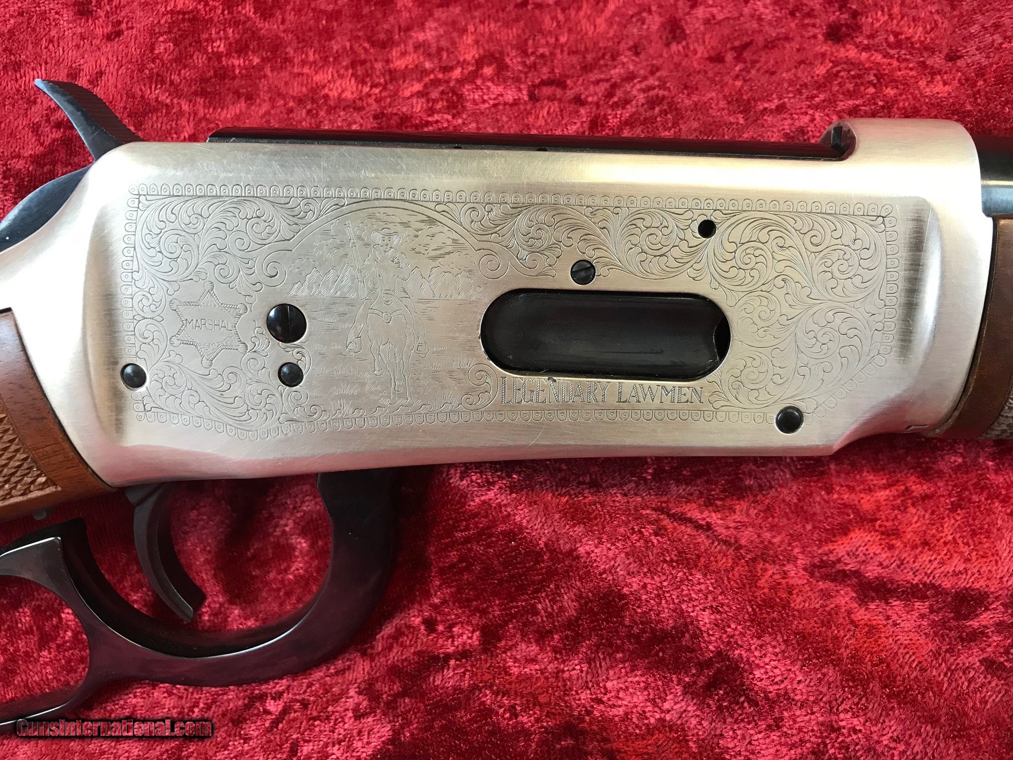 Description: Made in 1978, this commemorative Winchester 94 "Legendary Lawmen" carbine is new in box and gorgeous! The sharply checkered butt stock and fore end are free of any dings or handling marks, and the bluing on the barrel, magazine, lever, hammer, and trigger is immaculate. The left side of the silver plated receiver features an engraved scene of an old west lawman on horseback, bringing in a bound prisoner. The right side sports a lawman riding his horse and holding his trusty Winchester rifle. With a 16" barrel, this saddle ring carbine is light and very fast handling. Comes complete with original hang tag and box. A very neat collectable Winchester in perfect shape! SOLD Manufacturer: Winchester Model: 94 Legendary Lawmen Carbine Caliber Info: .30-30 |