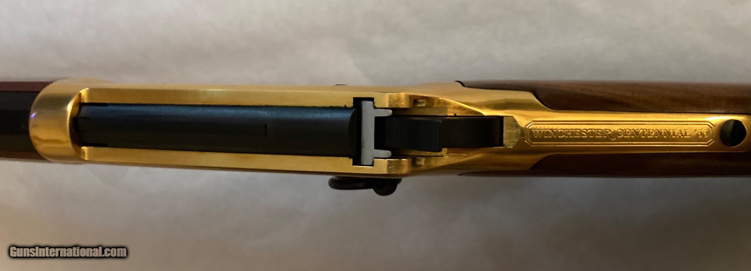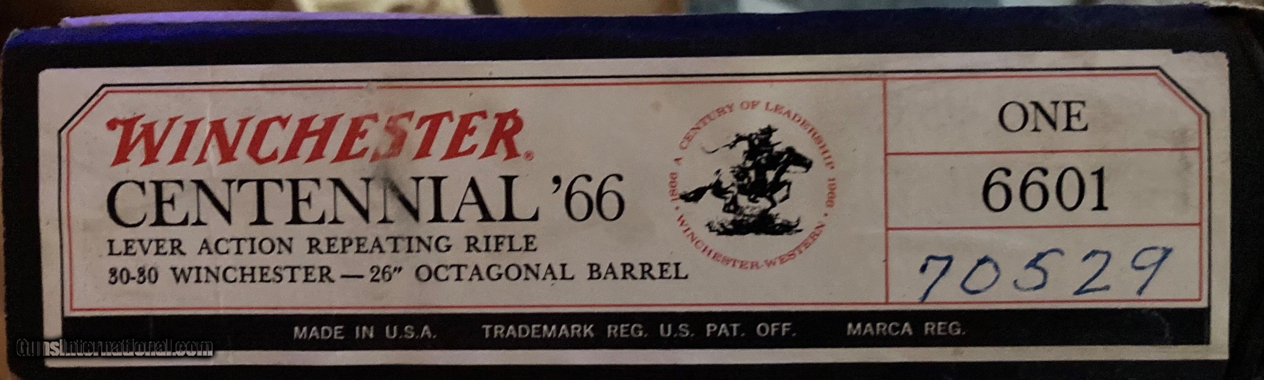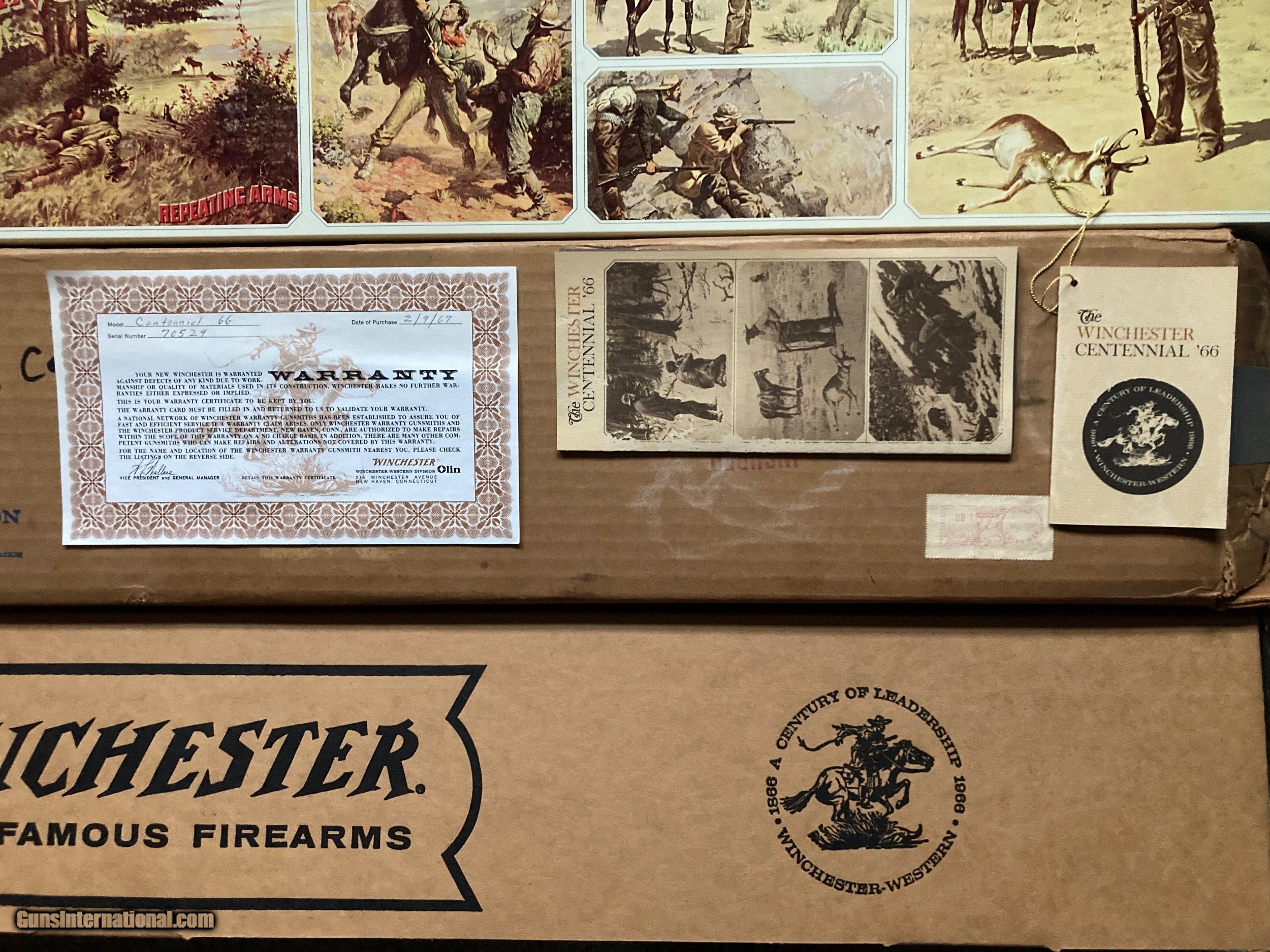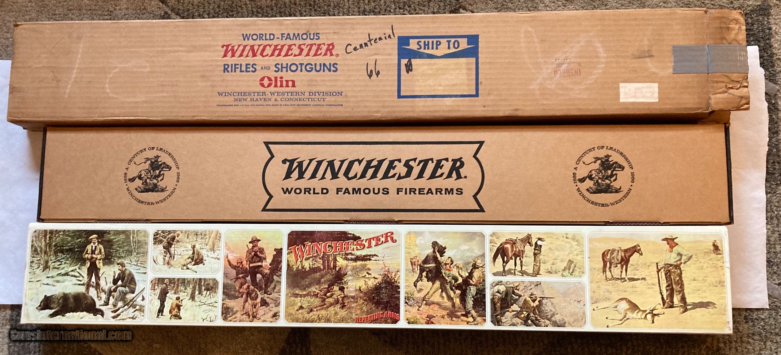 Description: *****Sold to Doug**** NIB Winchester Centennial 66 Rifle. This is a very unique collectable rifle as it includes all paperwork as it was shipped from the factory in 1966. The Shipping carton is even included with a postal date of October 7, 1966. The lever action has never been opened so the hammer shows no blueing loss. I will ship from my FFL to your FFL UPS insured for $40.00 conus. I accept postal money order, bank cashiers check or your personal check. Will ship when your payment clears my bank. Keep a watch for my other listings of Winchester Commeratives. SOLD Manufacturer: Winchester Model: Centennial 66 Barrel Length: 26 Metal Condition: New Wood Condition: New |